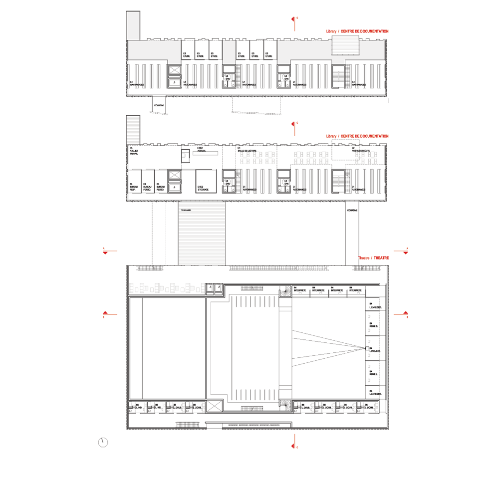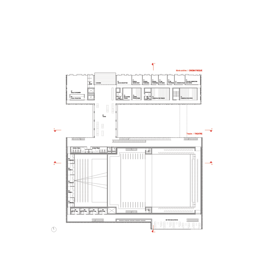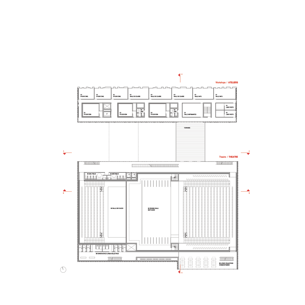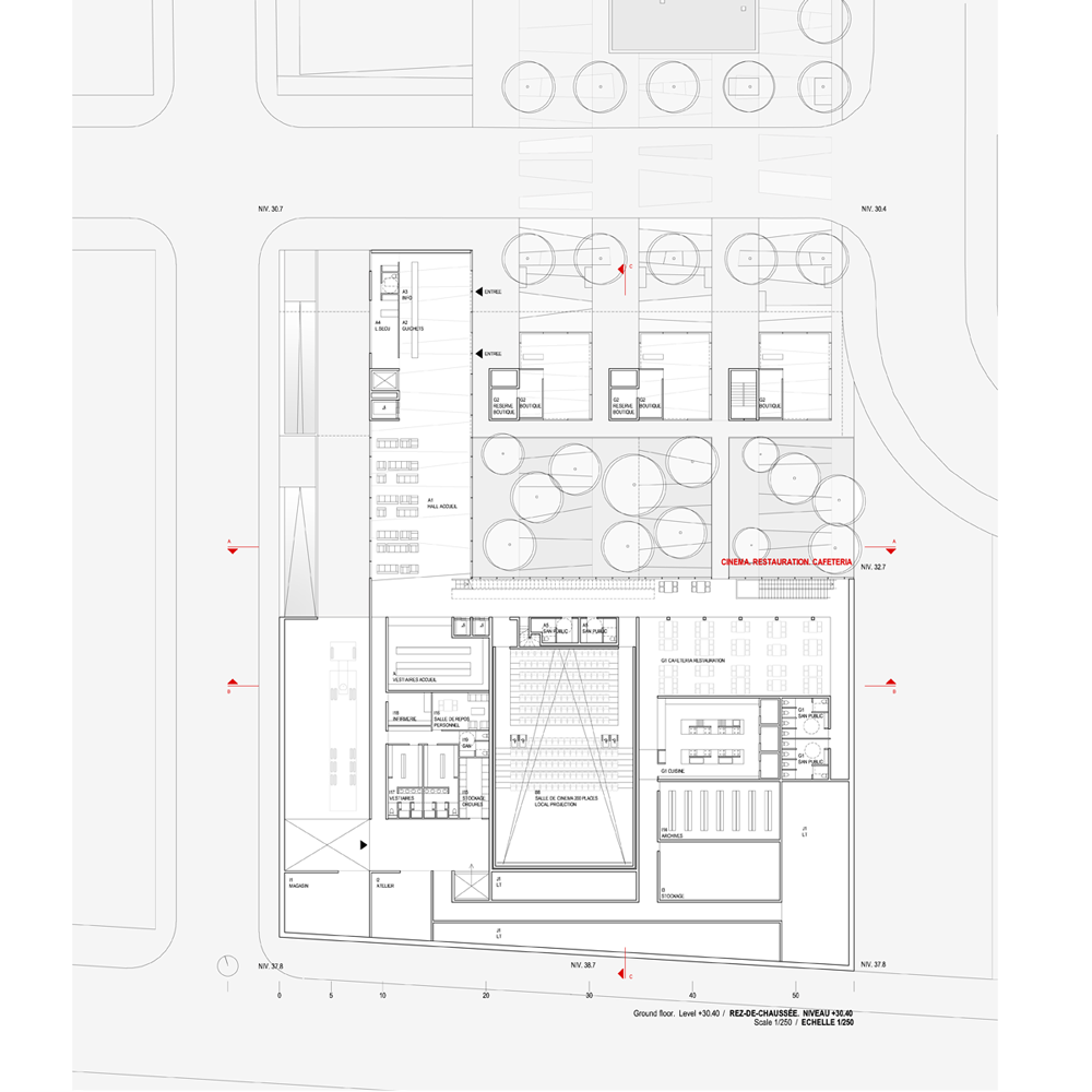 1 - un adossement au Sud, le long du ring, accueillant, en relation avec le lointain, les parties à la fois les plus introverties, les plus grandes et les plus expressives du programme (salles de spectacles et d’exposition)
