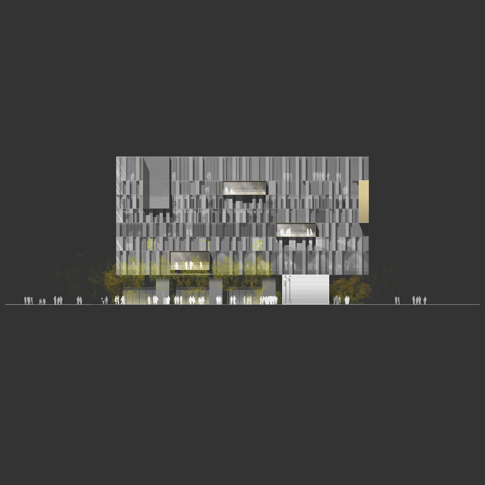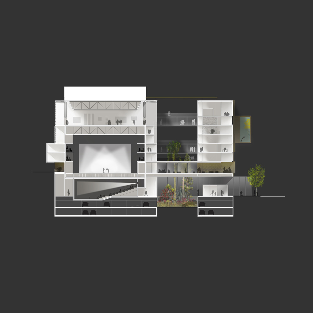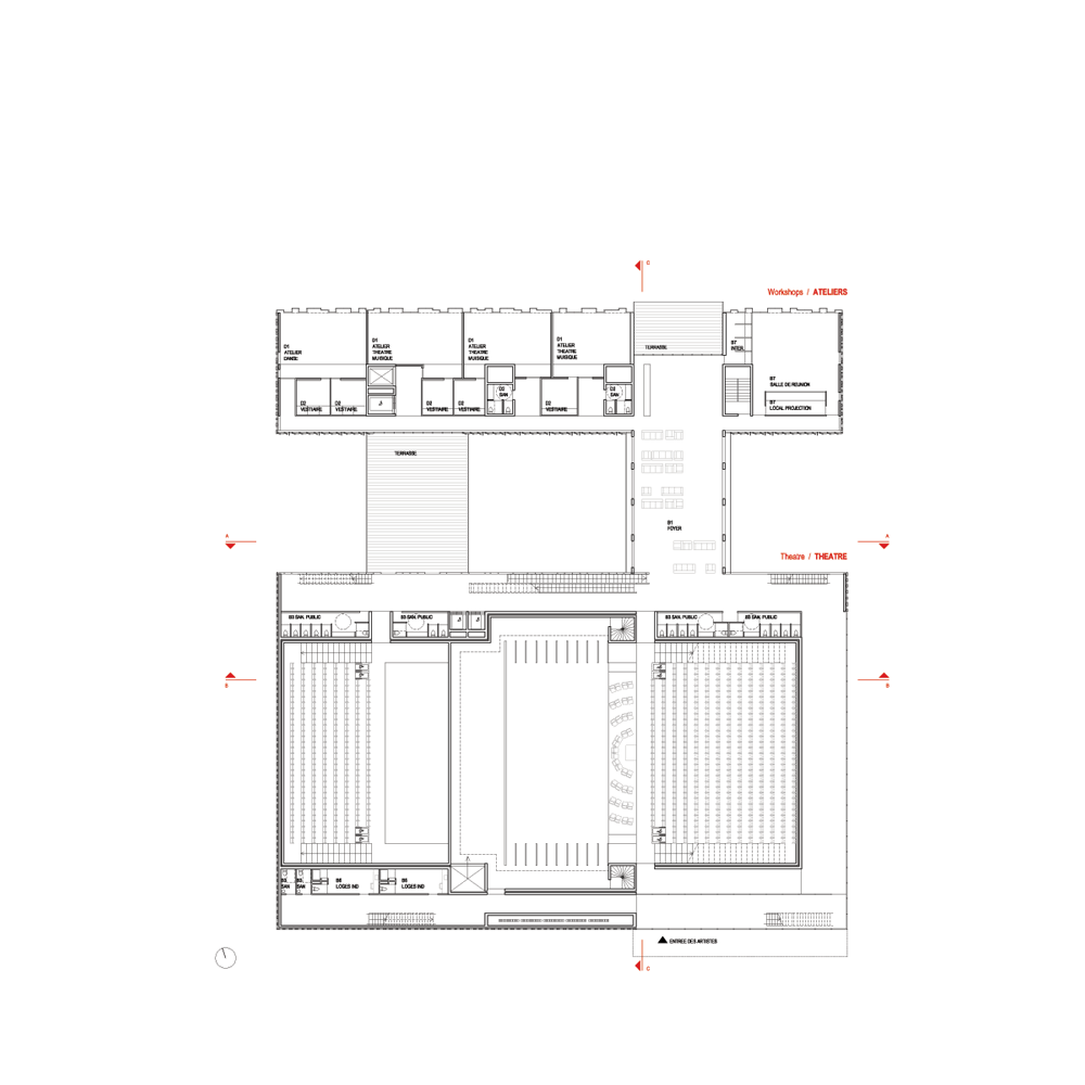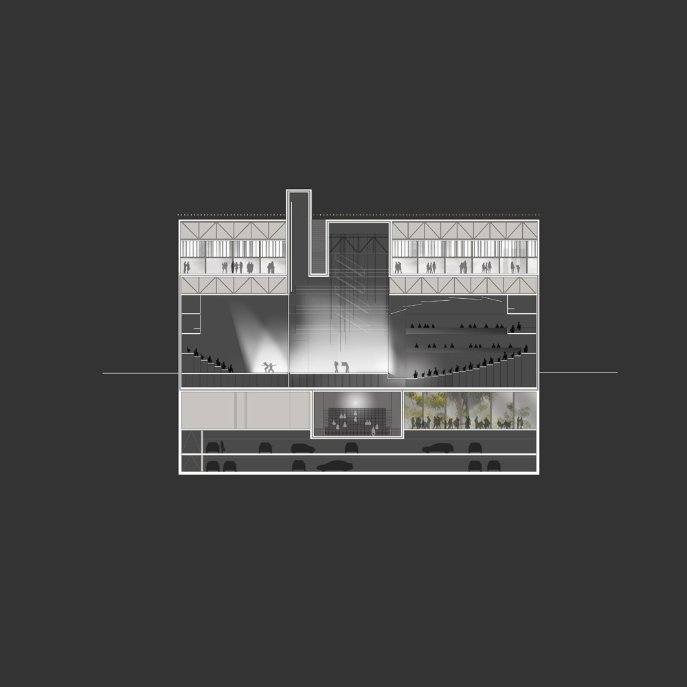 1 - un adossement au Sud, le long du ring, accueillant, en relation avec le lointain, les parties à la fois les plus introverties, les plus grandes et les plus expressives du programme (salles de spectacles et d’exposition)