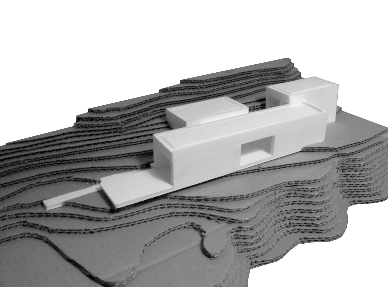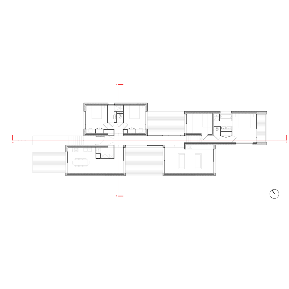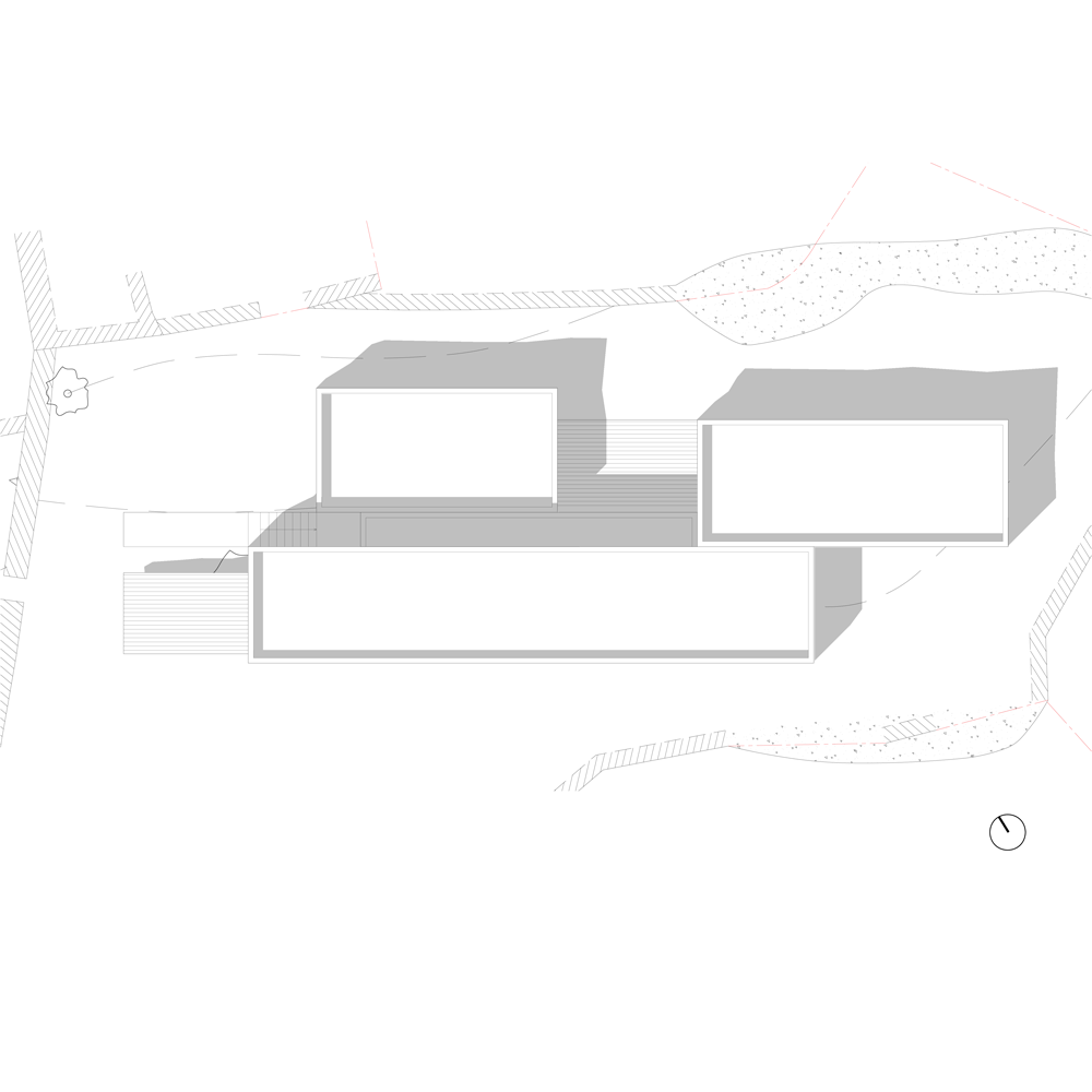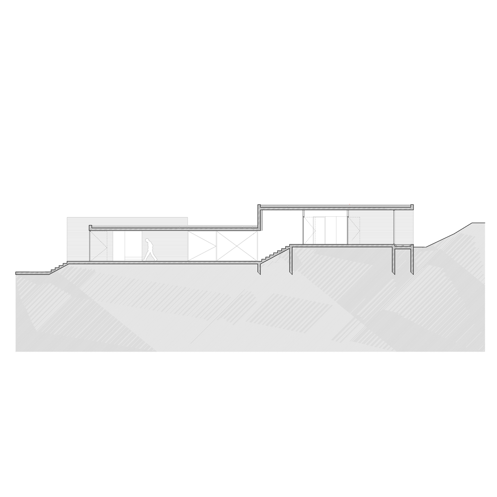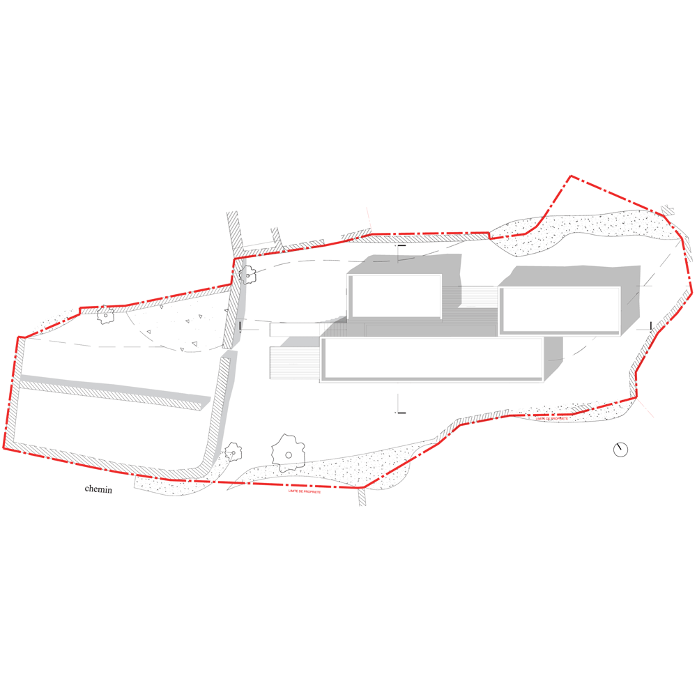 L’intimisation des espaces de vie est le fruit de l’éclatement du programme mais surtout du travail en coupe du projet. En effet cette maison est constituée de quatre volumes habitables à des côtes altimétriques différentes qui jouissent chacun d’une terrasse particulière au même niveau. Ainsi chaque espace possède un prolongement extérieur qui est en relation avec le paysage (montagne ou mer). C’est au moyen de ces terrasses que les différents volumes construits sont reliés. Les espaces les plus partagés sont donc ces terrasses extérieures qui deviennent donc des véritables pièces à vivre.