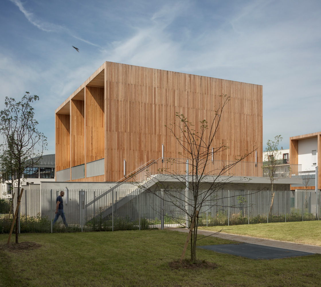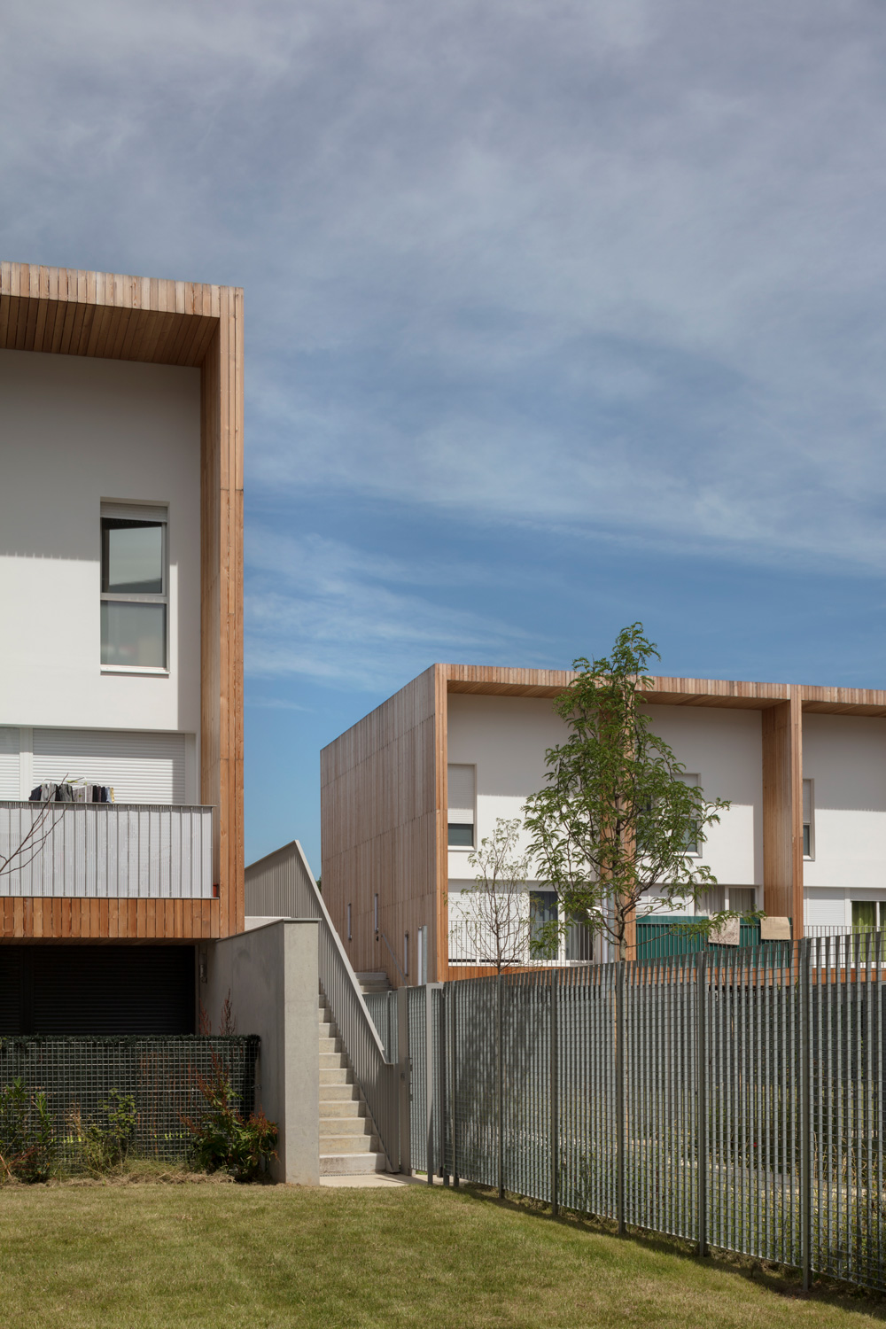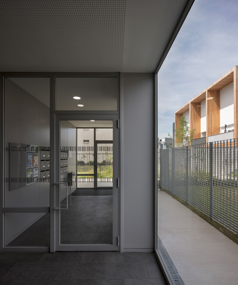 Les logements placés en partie basse sont accessibles aux personnes à mobilité réduite et s’ouvrent au Sud sur un jardin privatif, tandis que ceux placés au 1er étage sont distribués par une large coursive en platelage de bois bénéficient d’une grande loggia double-hauteur.