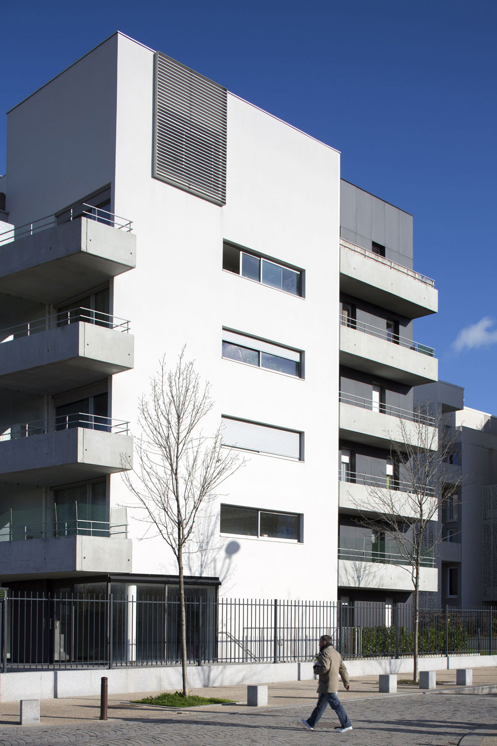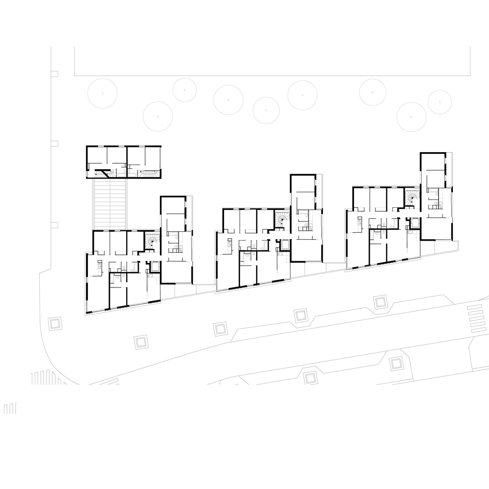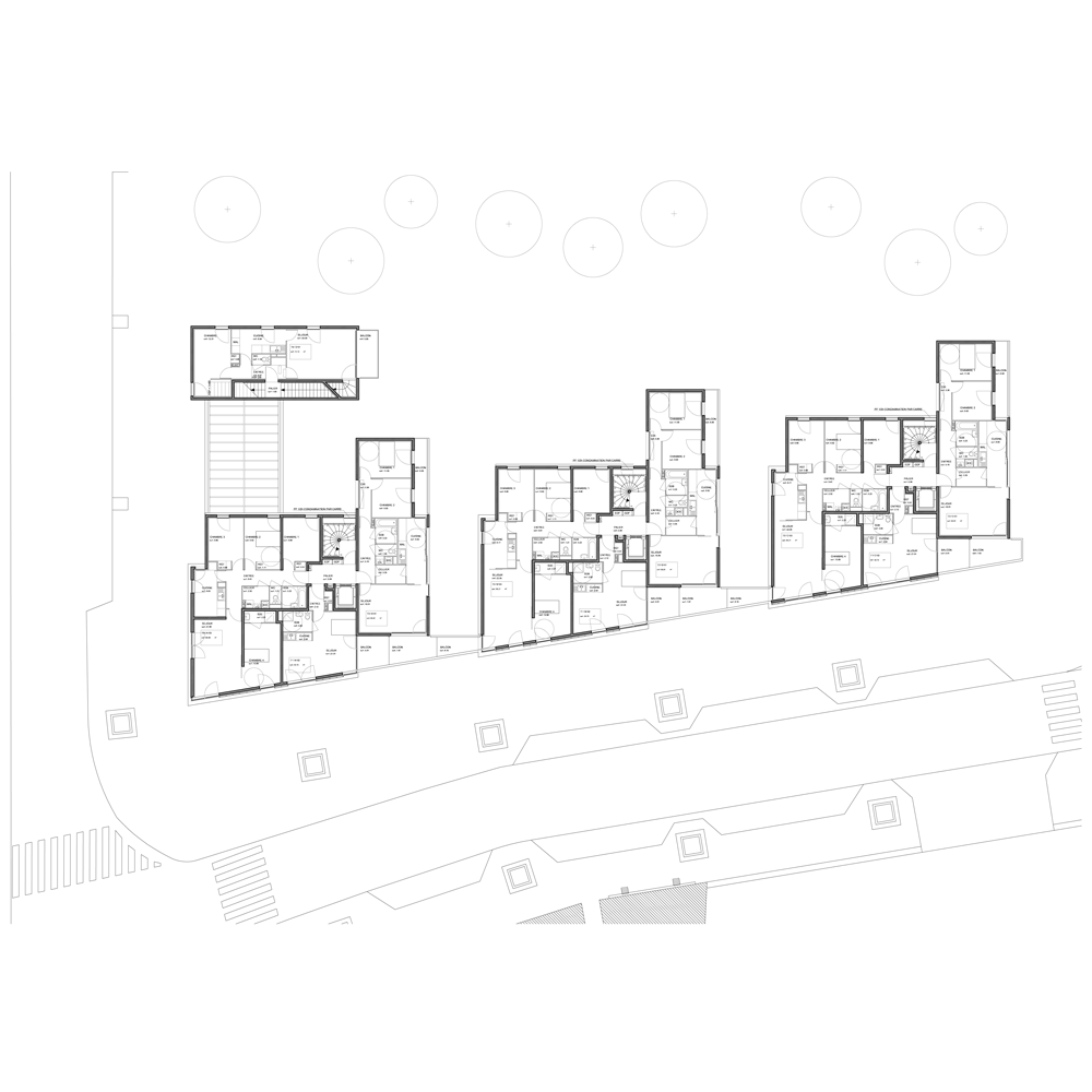 pour réaliser ces objectifs, la future opération de logements développe méthodiquement le principe de l’immeuble à “plots” reliés par des terrasses et offrant deux “angles” urbains spécifiques en réponse au futur complexe.