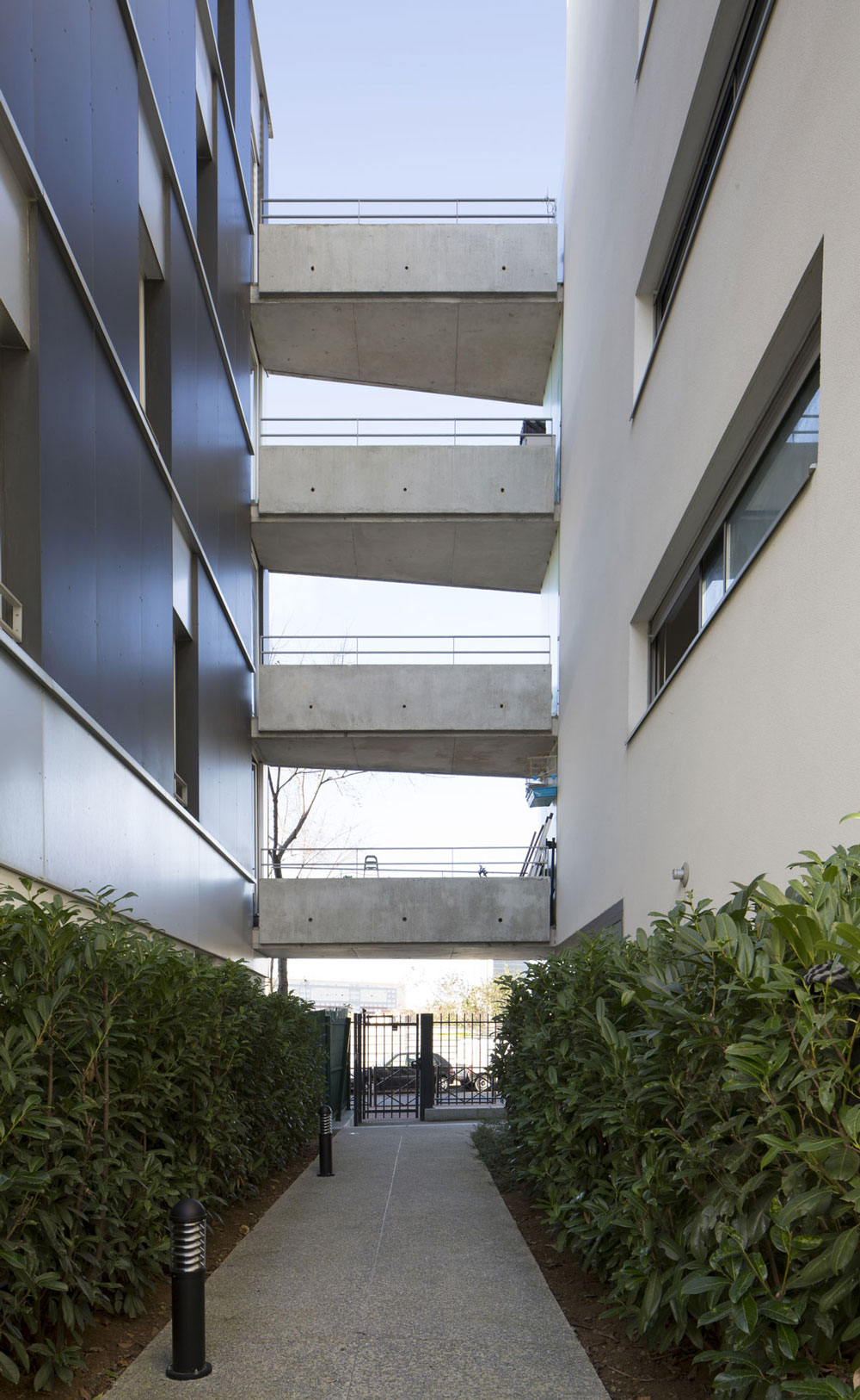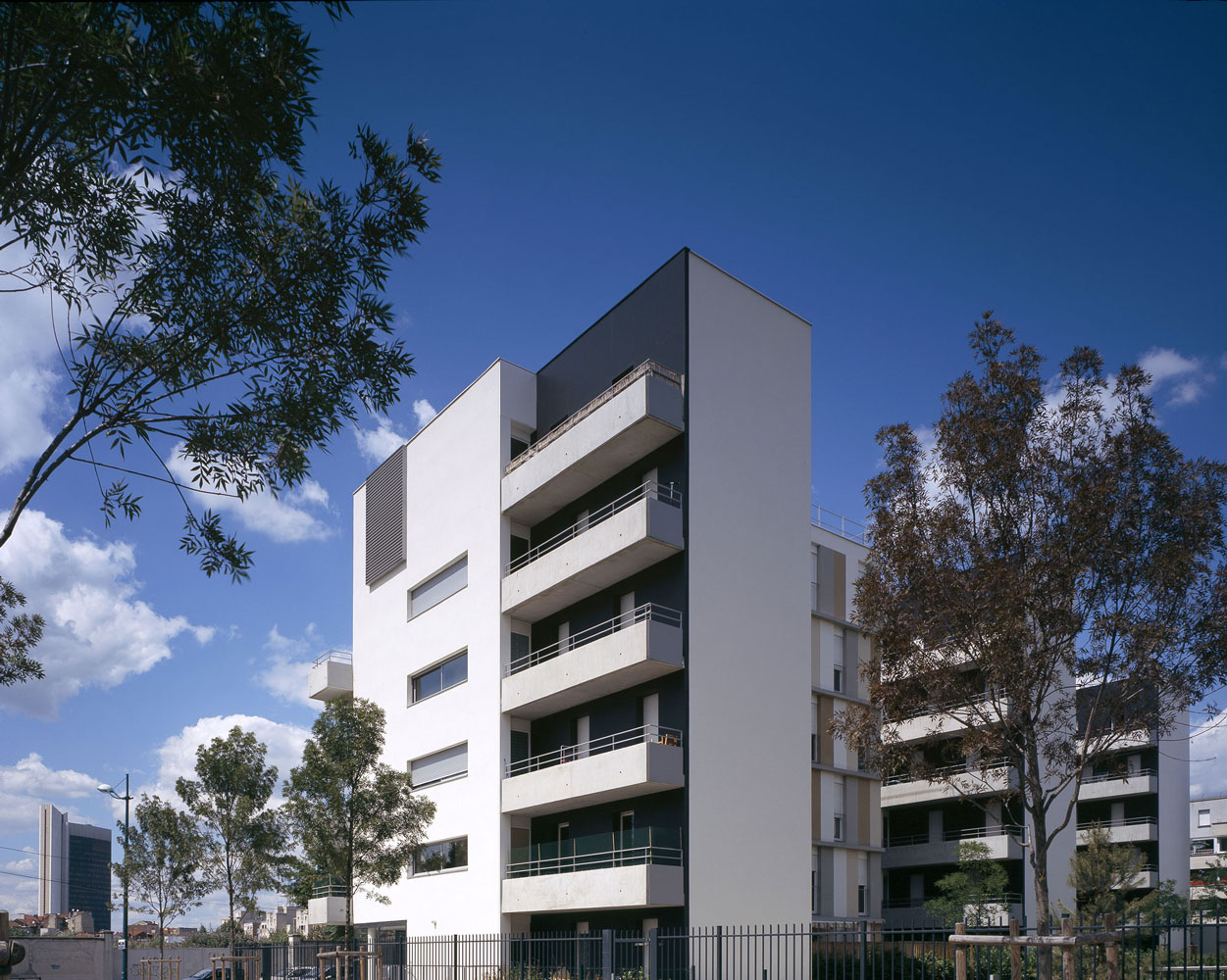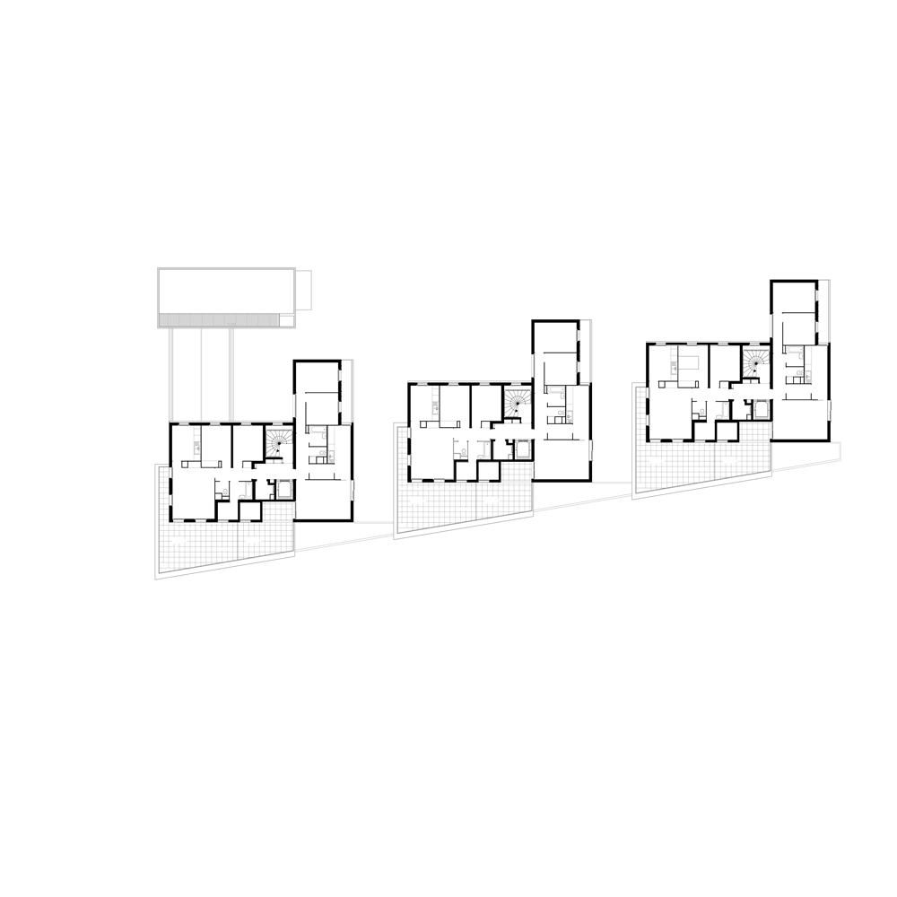 pour réaliser ces objectifs, la future opération de logements développe méthodiquement le principe de l’immeuble à “plots” reliés par des terrasses et offrant deux “angles” urbains spécifiques en réponse au futur complexe.