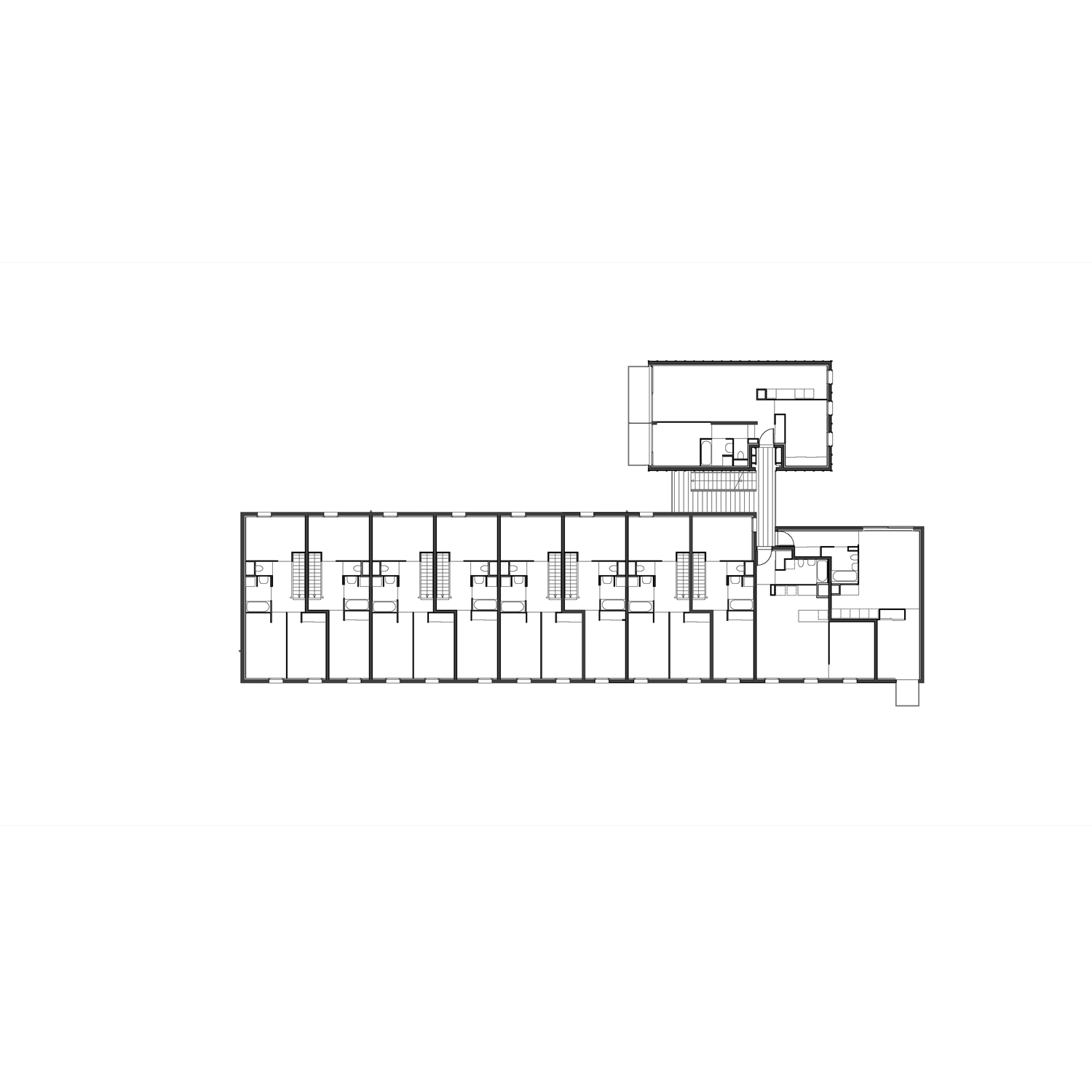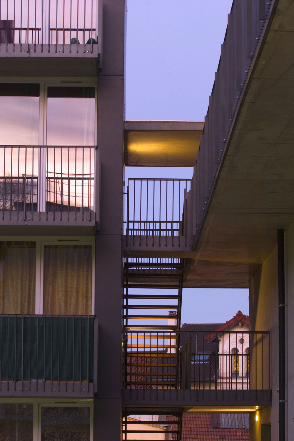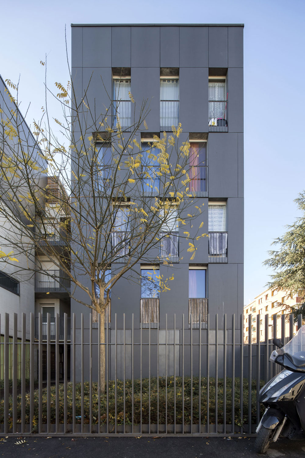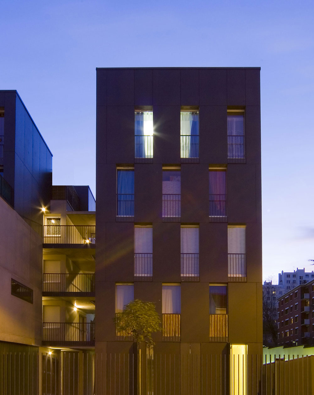 l’intervalle entre les deux corps de bâtiments accueille la distribution verticale et permet de recréer l’espace symbolique de l’appropriation partagée. la tension verticale, la forme et la dimension de cet espace extérieur associé à la mise en place d’une grille le long de la rue permettent d’établir une limite claire et naturelle avec l’espace collectif de la ville. le retrait « résidentiel » marqué par le bâtiment vertical permet d’enrichir la séquence d’entrée par la création d’un jardin sur rue offrant l’accès à la salle polyvalente de quartier placée à la « prou du projet ».