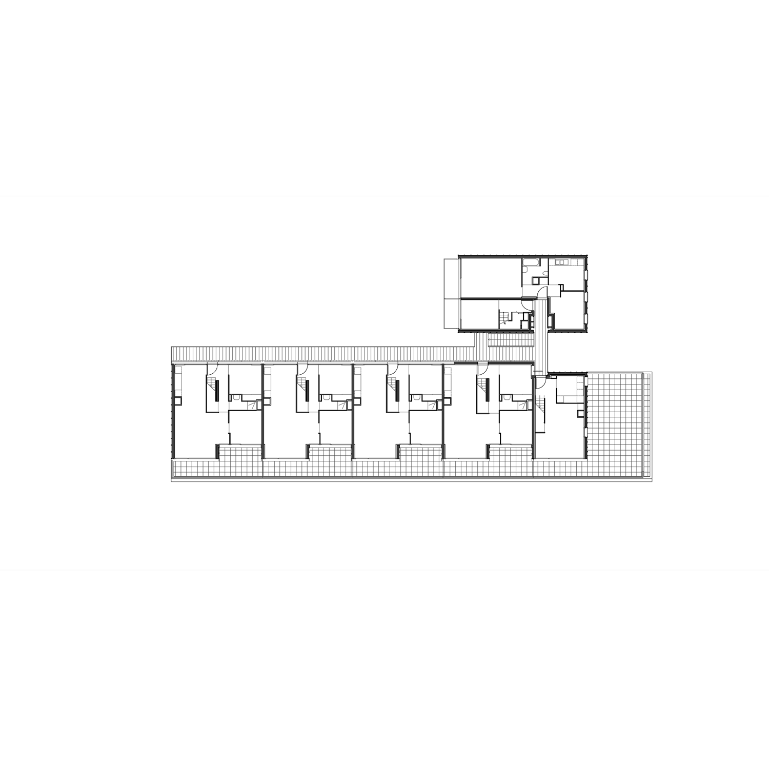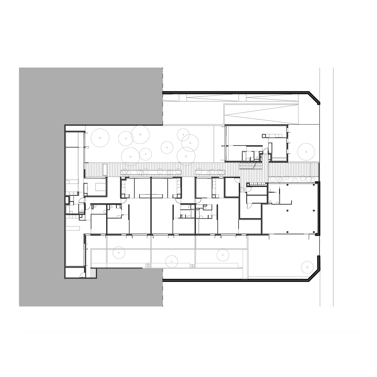 dans ce cas, il s’agit d’offrir à tous les logements, une vue frontale ou diagonale sur la rue en y plaçant les séjours qui bénéficient le plus principalement de la lumière du Sud-est. la cour est conçue comme un espace de repli calme et végétal.
