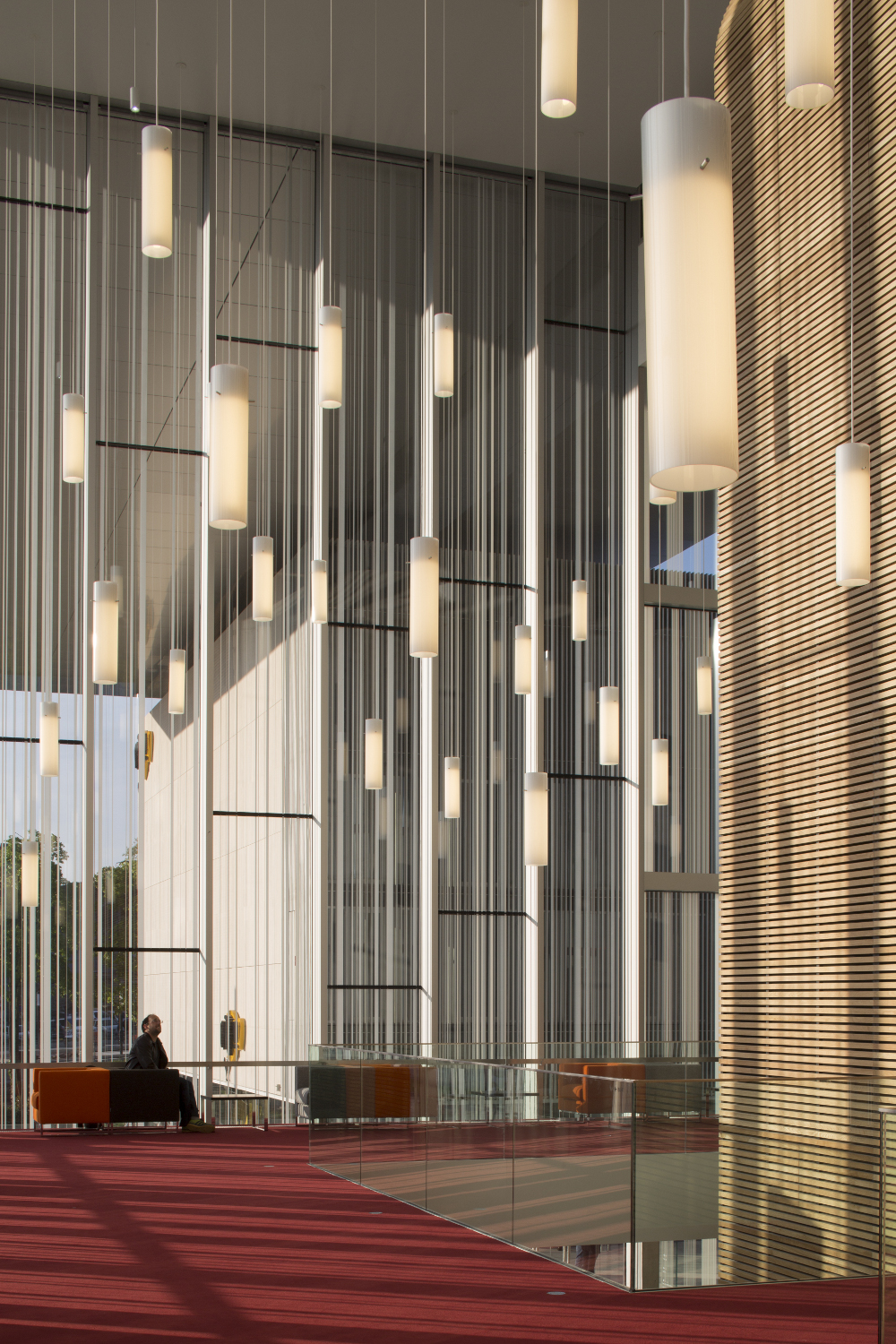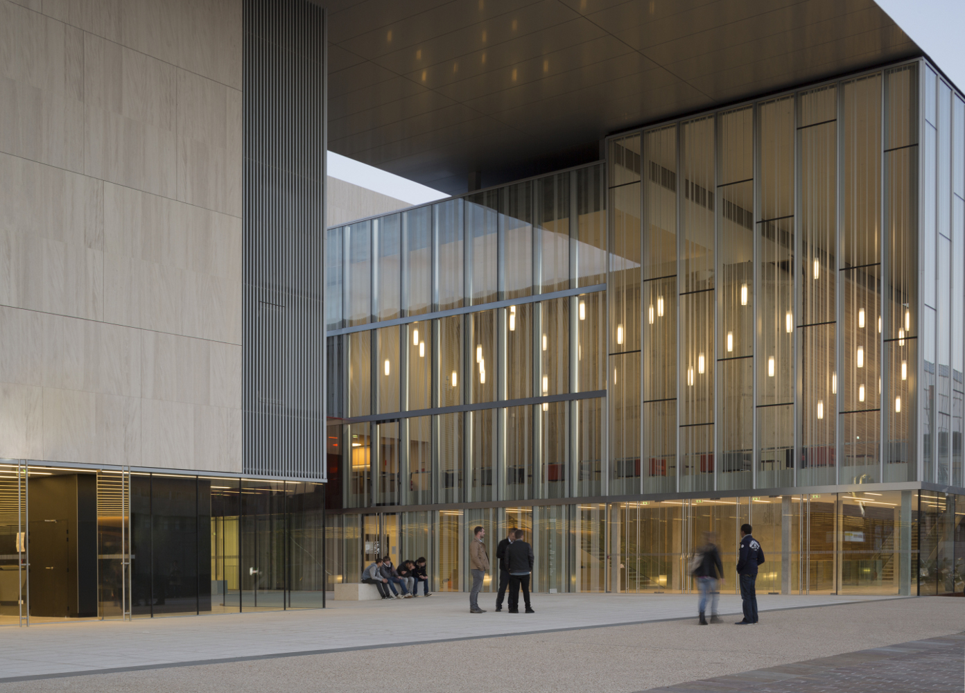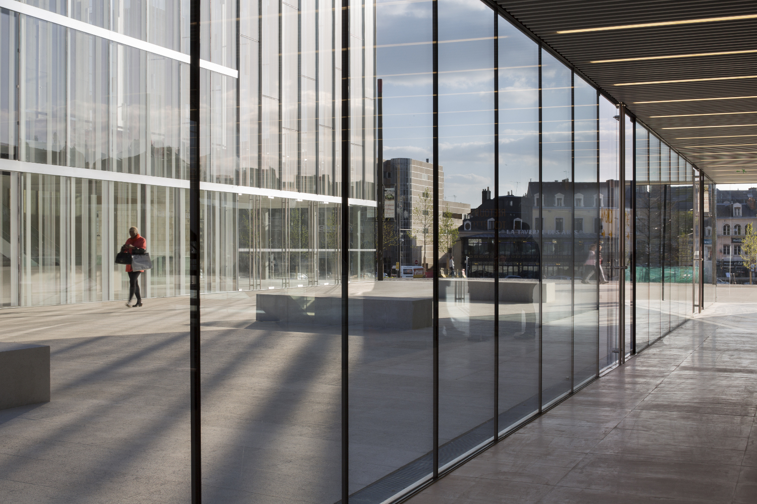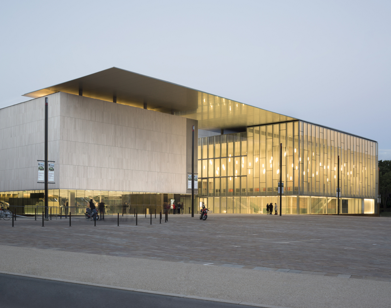 Un grand toit, en porte-à-faux, permet l’expression unitaire du projet scindé en plusieurs parties. De nuit, la sous face lisse suspendue à 14 mètres de hauteur s’illumine et révèle l’activité du centre culturel qu’elle abrite.