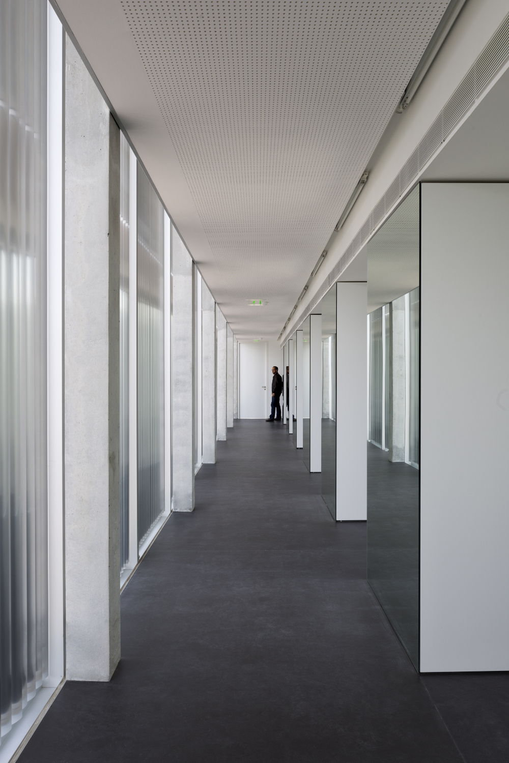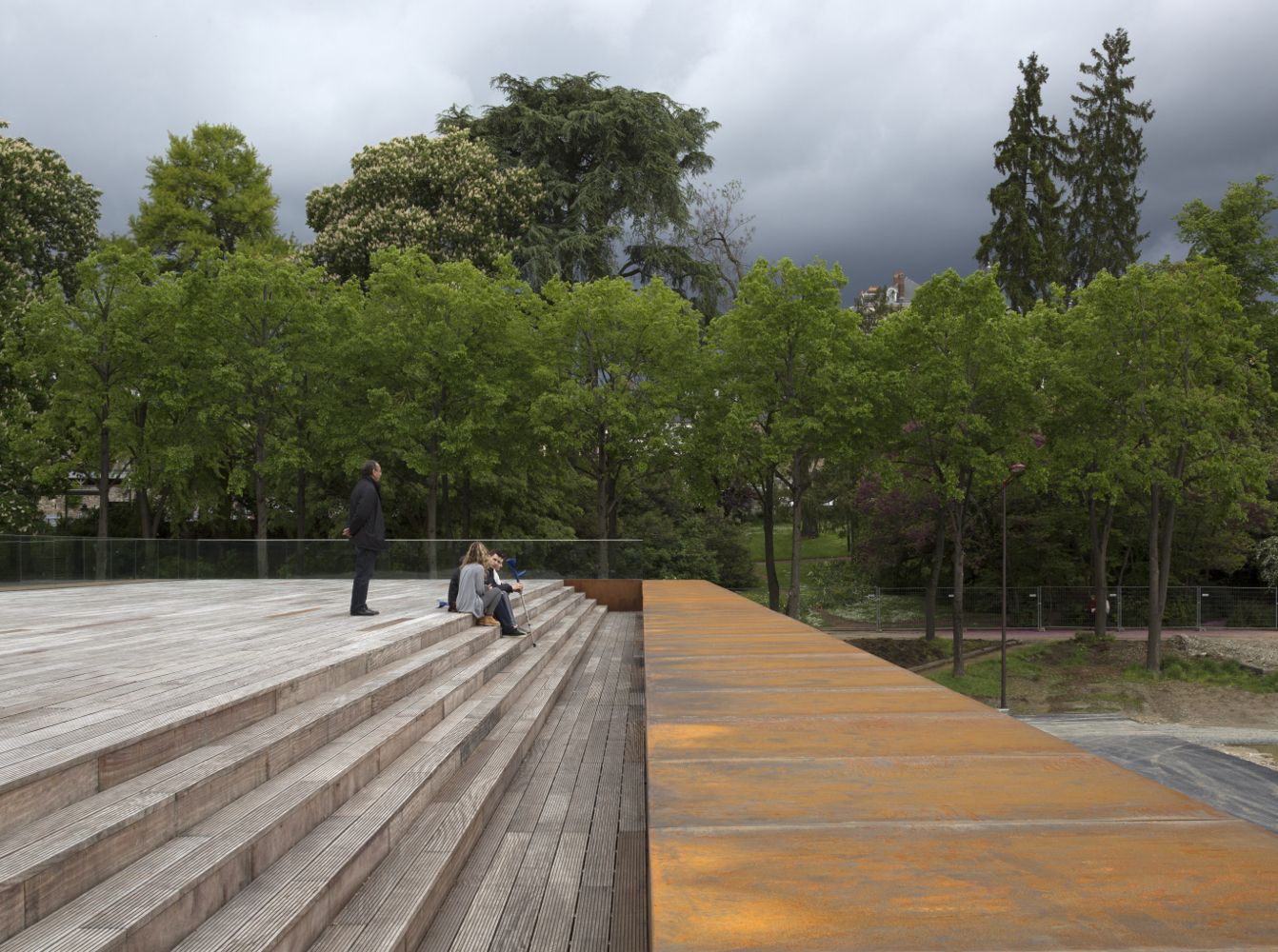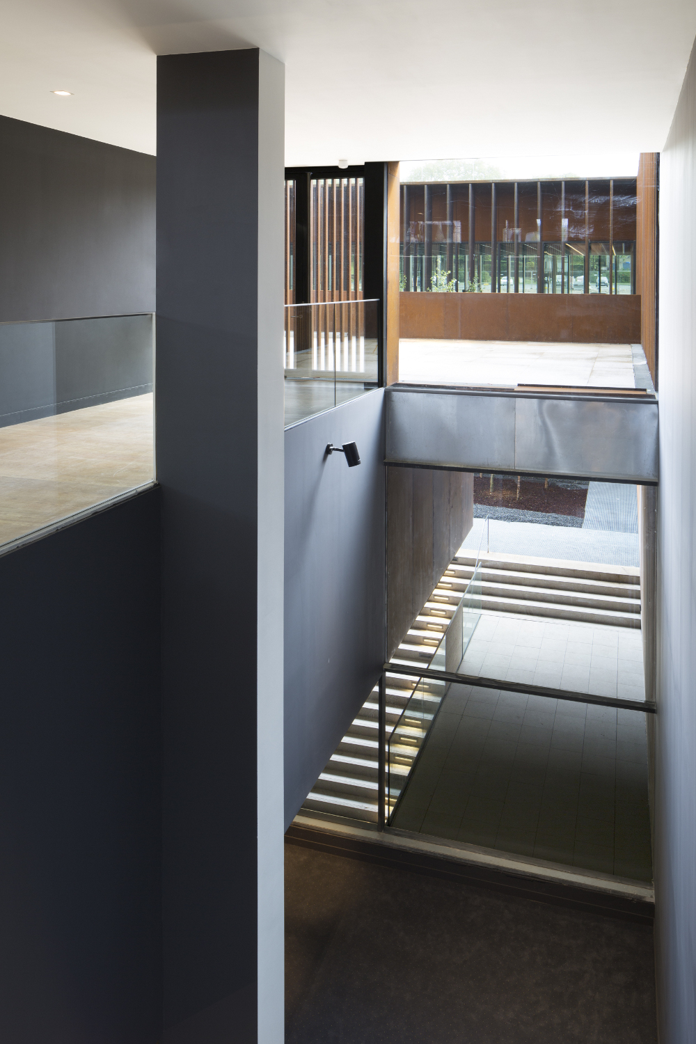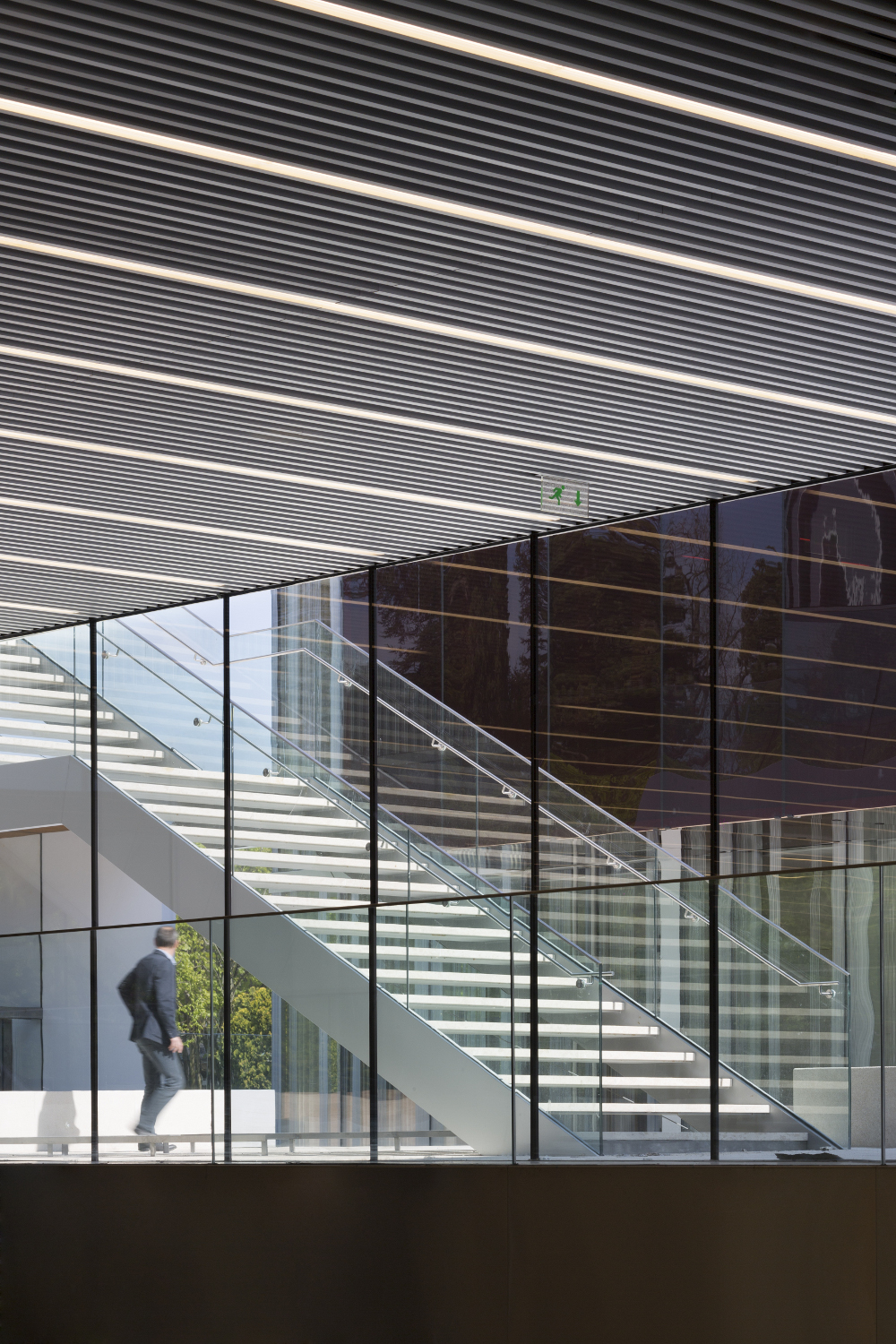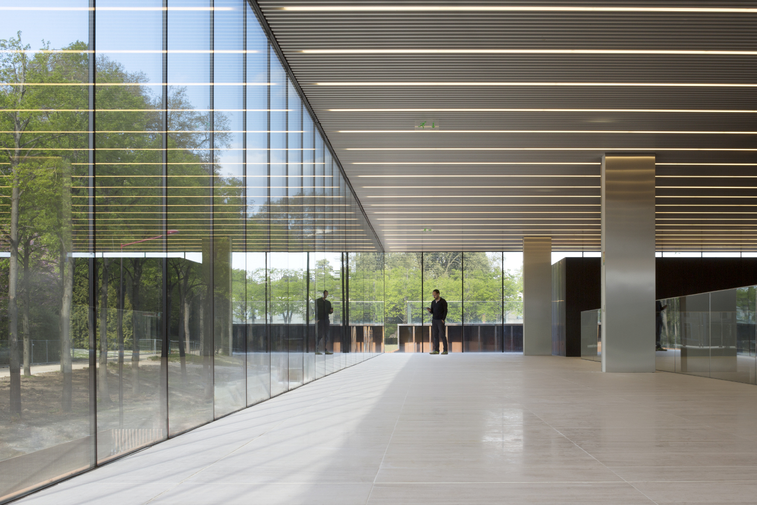 Un grand toit, en porte-à-faux, permet l’expression unitaire du projet scindé en plusieurs parties. De nuit, la sous face lisse suspendue à 14 mètres de hauteur s’illumine et révèle l’activité du centre culturel qu’elle abrite.