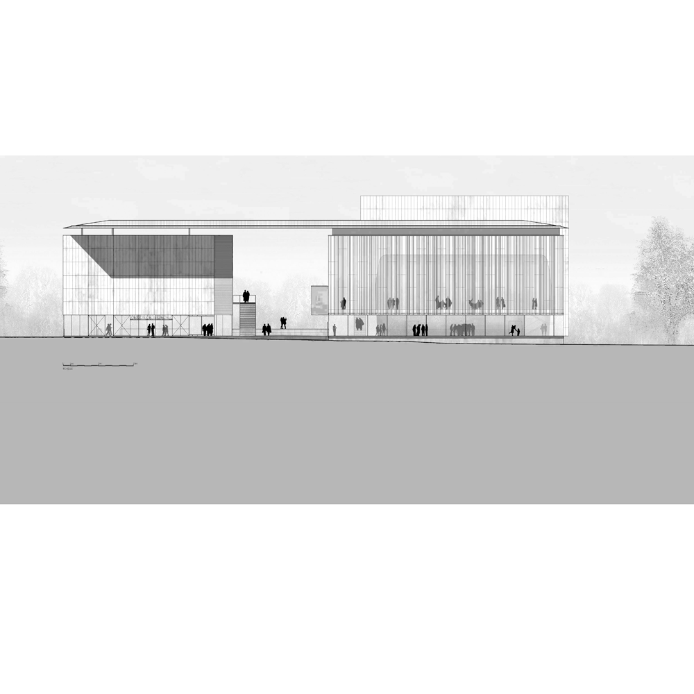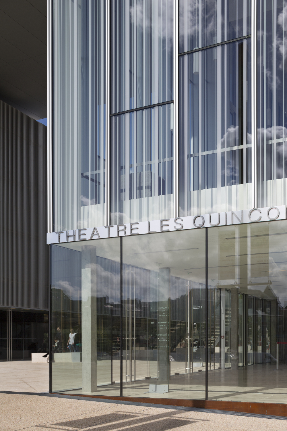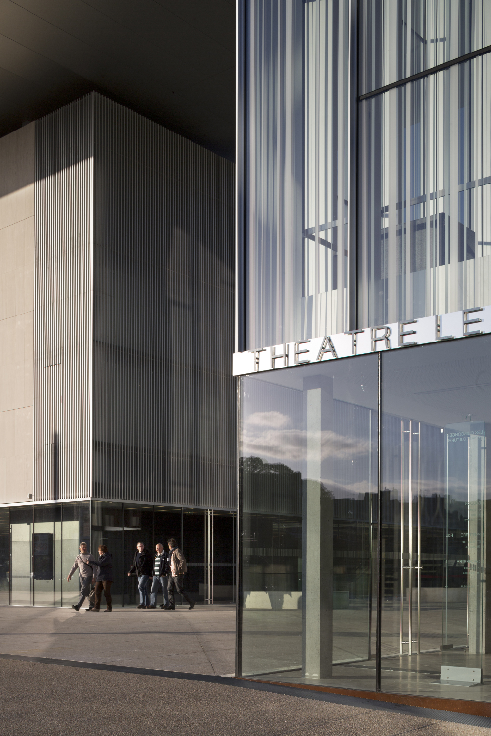 Le théâtre se présente comme une vitrine culturelle de la Ville. Ré-interprétation du rideau de scène, sa façade est conçue comme un grand rideau de verre constitué par l’alternance irrégulière de bandes opales, transparentes et translucides. A l’intérieur, la salle offre l’image d’un cocon chaleureux et enveloppant formé d’écailles en bois.