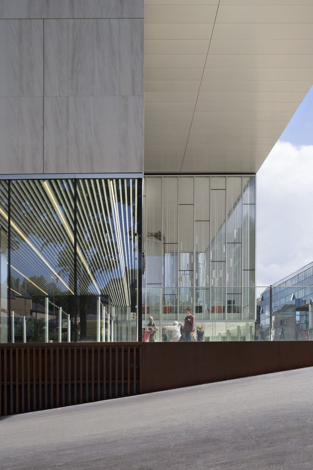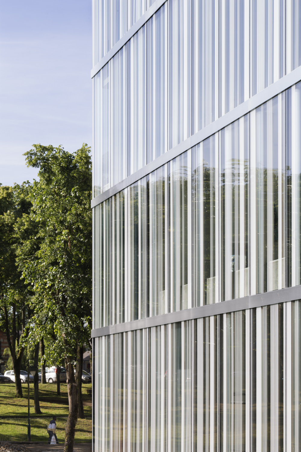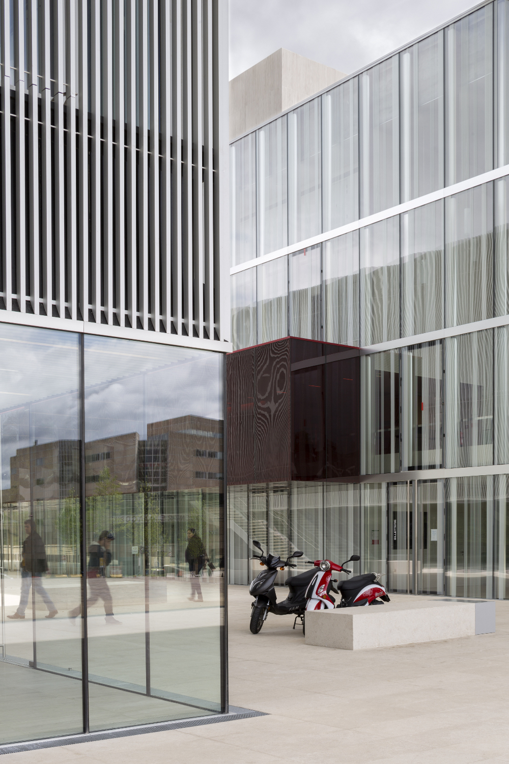 Le théâtre se présente comme une vitrine culturelle de la Ville. Ré-interprétation du rideau de scène, sa façade est conçue comme un grand rideau de verre constitué par l’alternance irrégulière de bandes opales, transparentes et translucides. A l’intérieur, la salle offre l’image d’un cocon chaleureux et enveloppant formé d’écailles en bois.