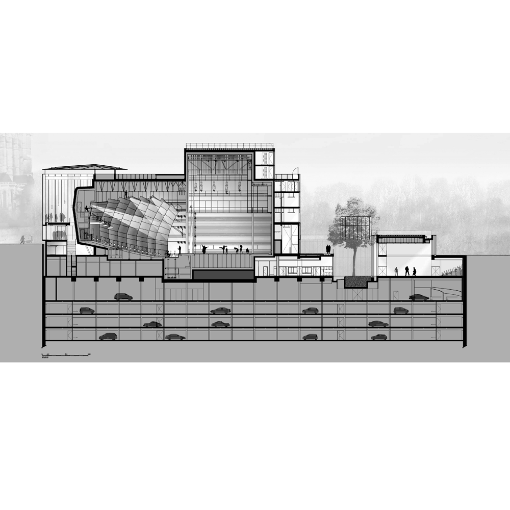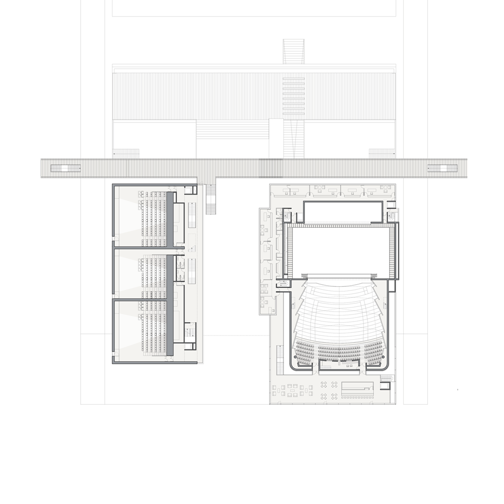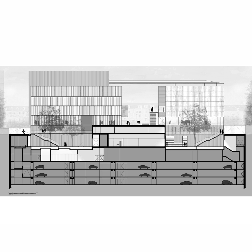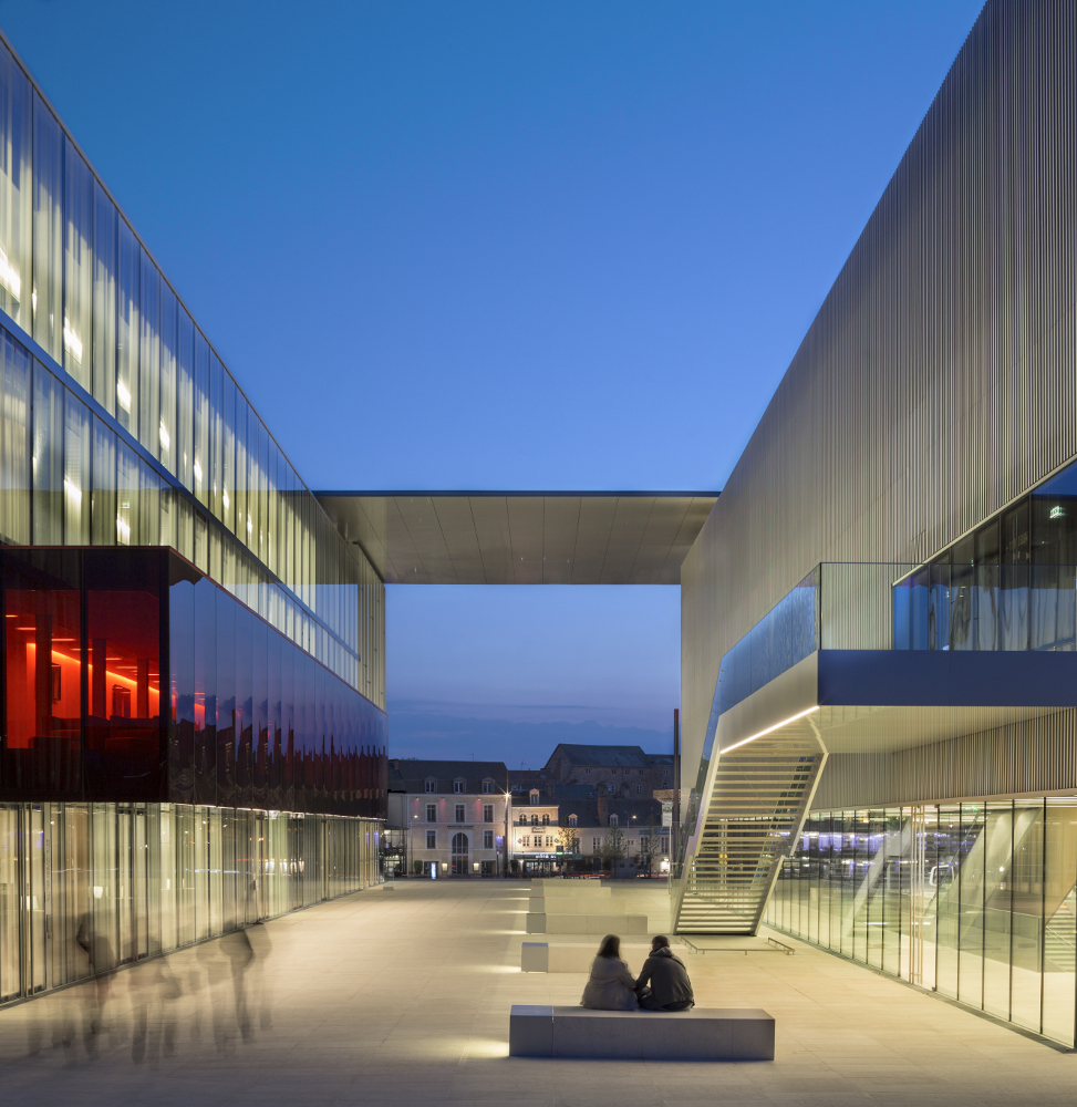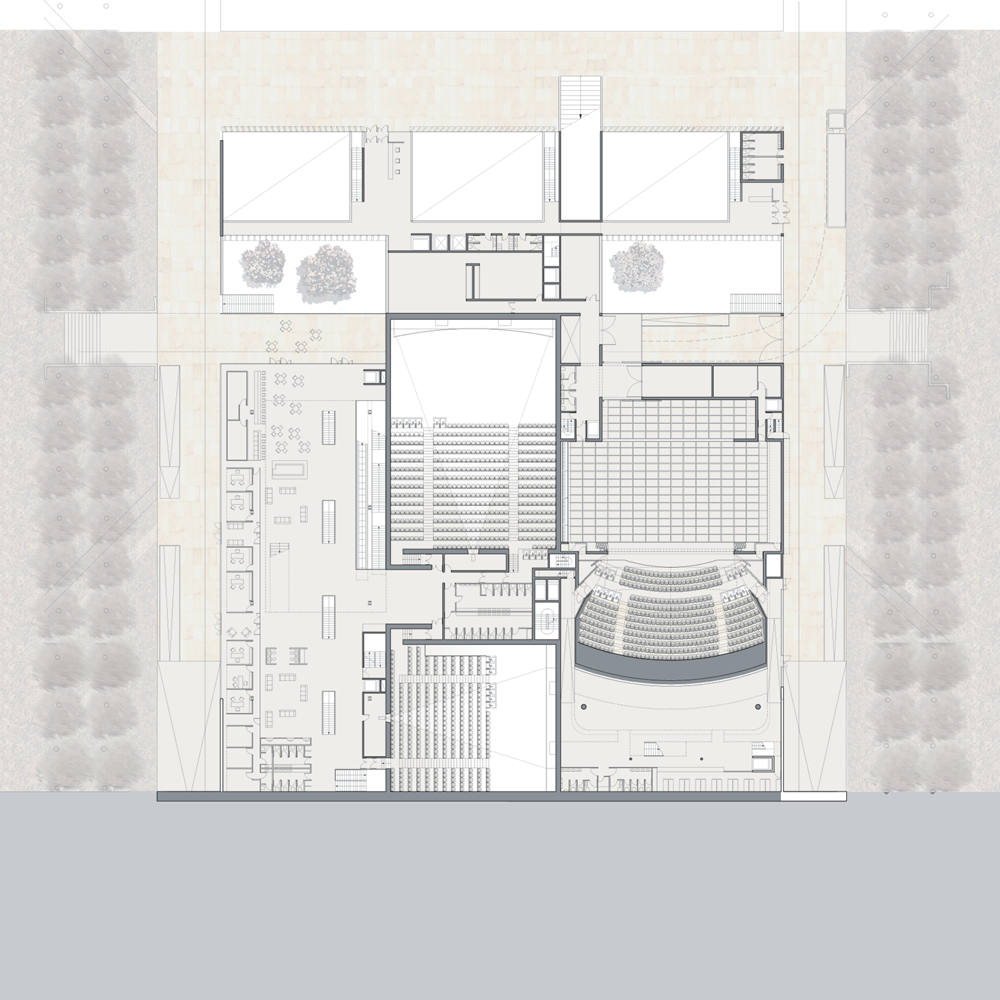 en prolongeant la ville au cœur du projet. Un parvis central entre les cinémas et le théâtre offre un véritable espace animé par la synergie des programmes qui l’entourent.