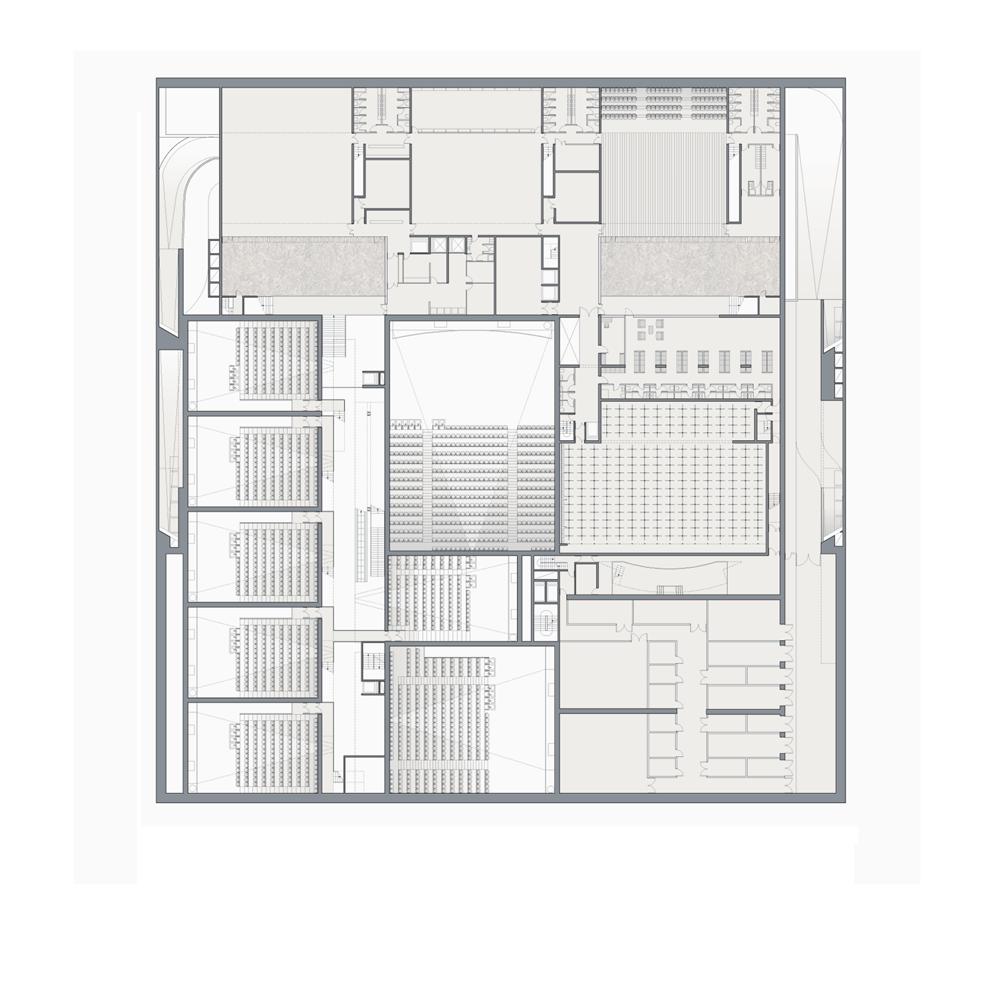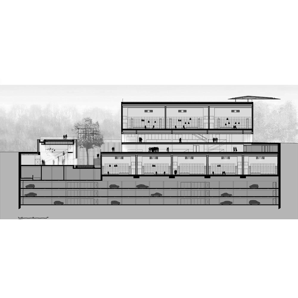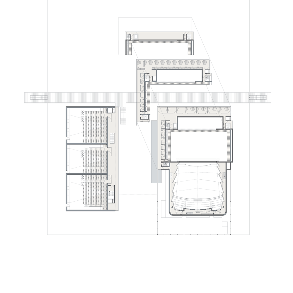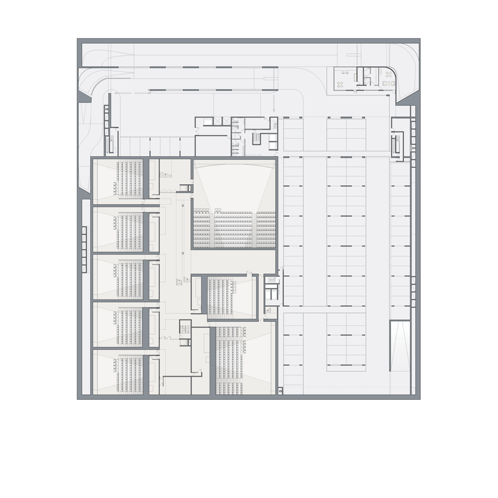 en prolongeant la ville au cœur du projet. Un parvis central entre les cinémas et le théâtre offre un véritable espace animé par la synergie des programmes qui l’entourent.