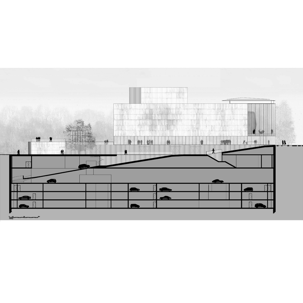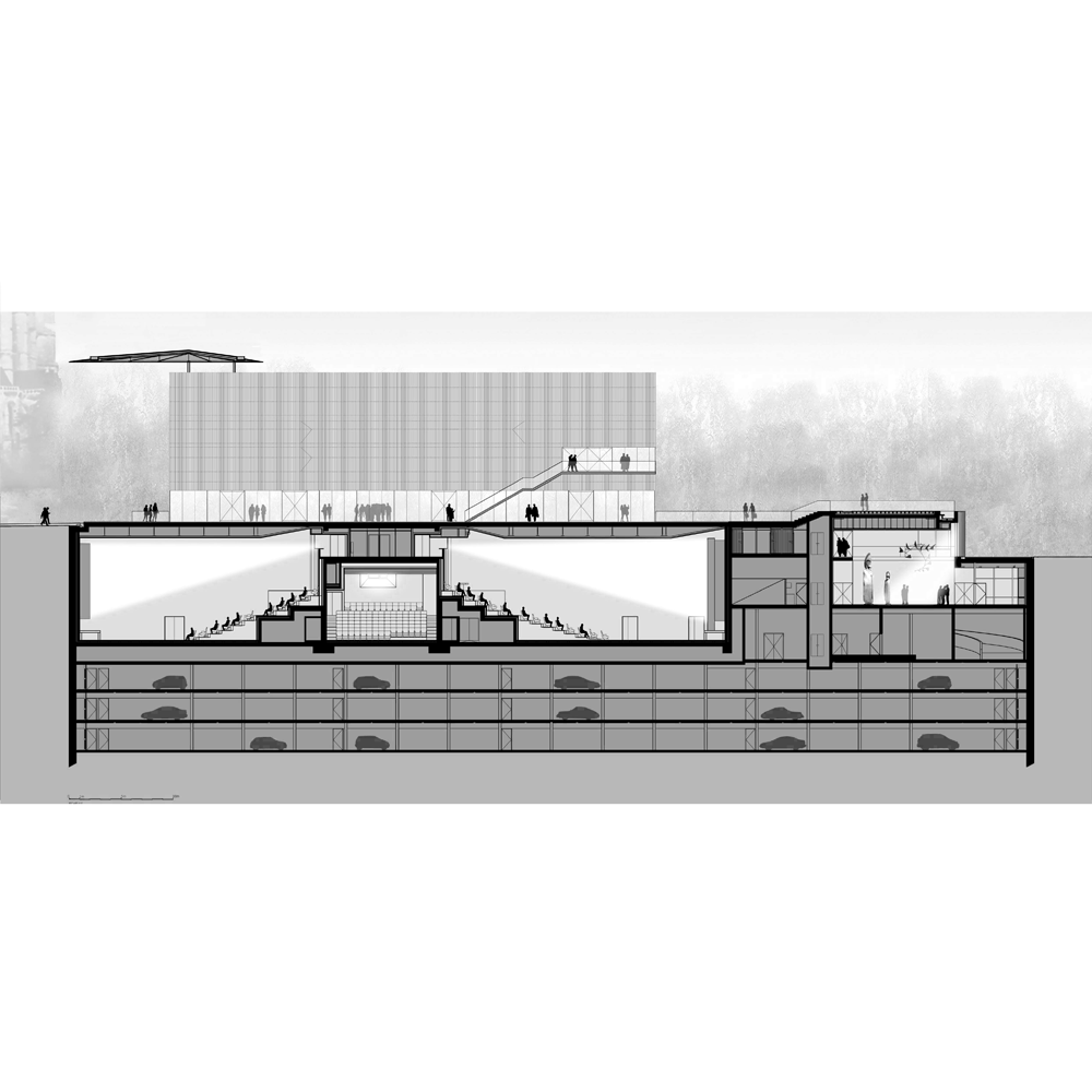 A l’inverse, le programme du cinéma se développe, à l’abri des regards, tel un iceberg sous le niveau de la place. La partie émergente, comme un bloc en pierre soulevé en tension avec le sol, libère une transparence complète vers l’esplanade des Quinconces.