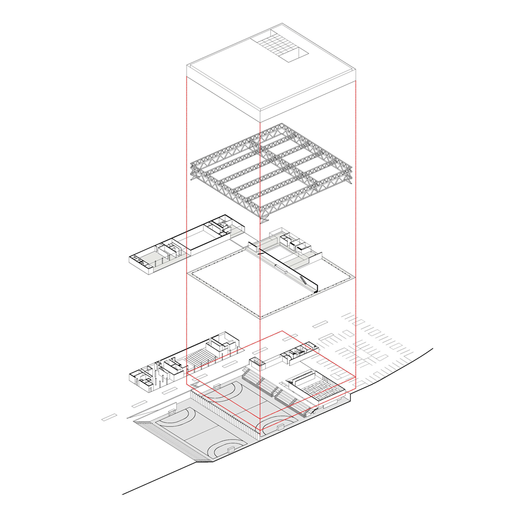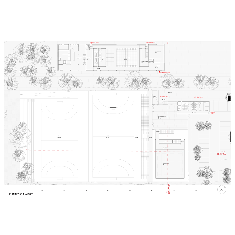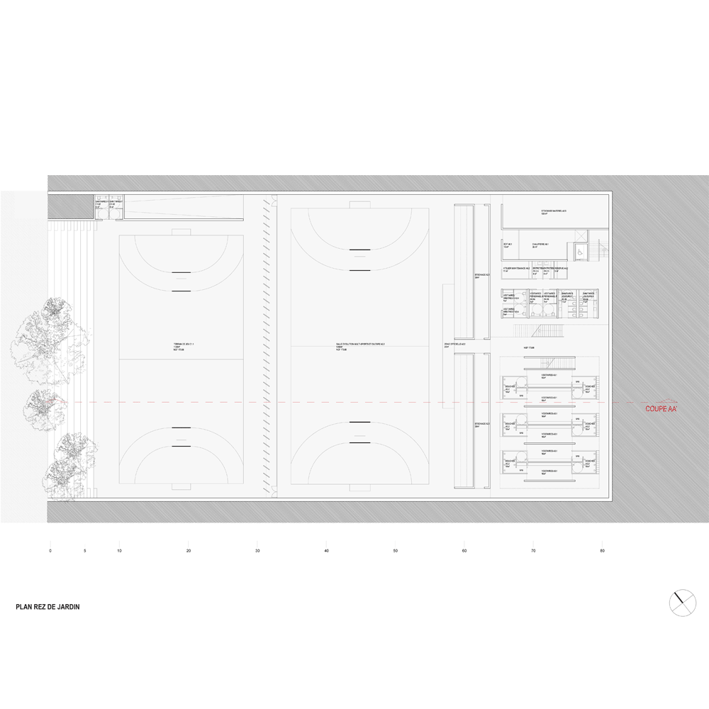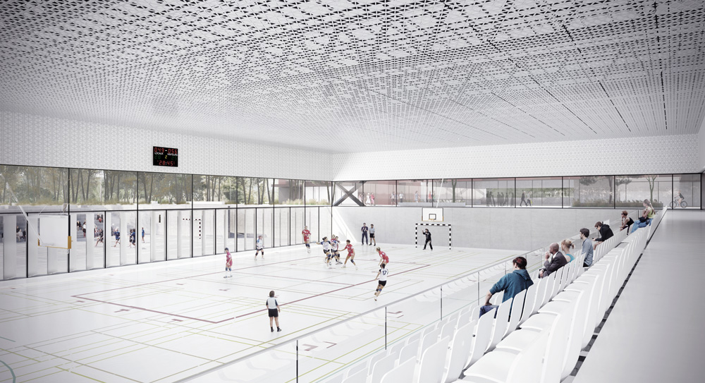 La forme unitaire du projet "s’affranchit" de la variété typologique environnante et affirme ainsi la dignité de l’équipement public. Cette unité confère également une forme homogène au plateau sportif qu’il accueille et permet ainsi à ce dernier de fonctionner comme un ensemble autonome, naturellement clos et distinct des espaces publics environnants.