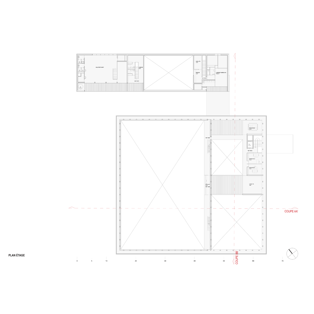 – Un décalage Est-Ouest, créé entre les deux corps de bâtiment, permet, au Nord-Est, d’adresser frontalement le projet face au centre-ville, tout en libérant, depuis la terrasse du restaurant, la vue et le soleil.