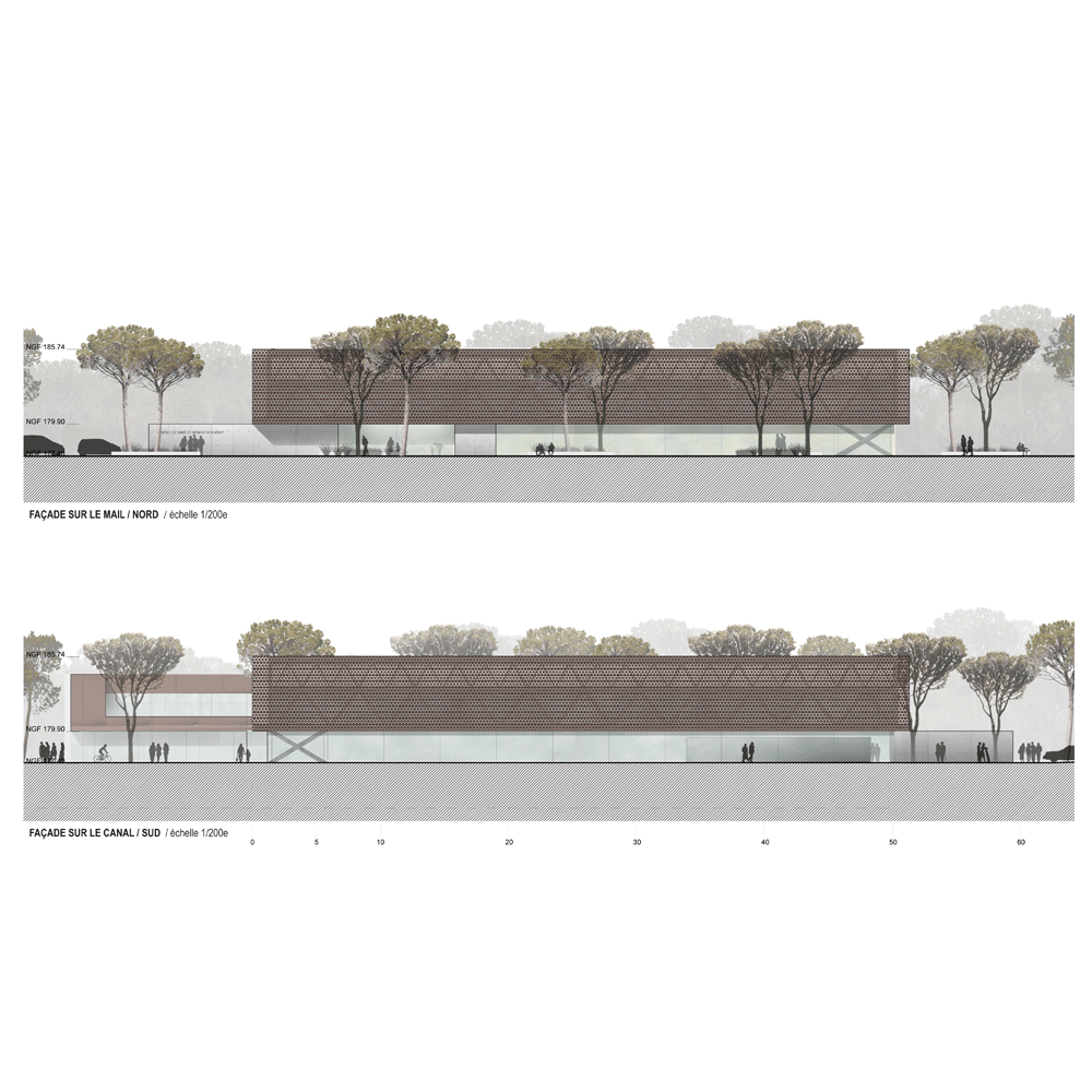 Le bâtiment offre une perméabilité visuelle sur toute sa périphérie en joignant les structures urbaines principales (canal, alignement d’arbres, salle M. Pagnol, future place publique) par le vide extérieur qui se prolonge sous la toiture jusqu’au cœur du projet.