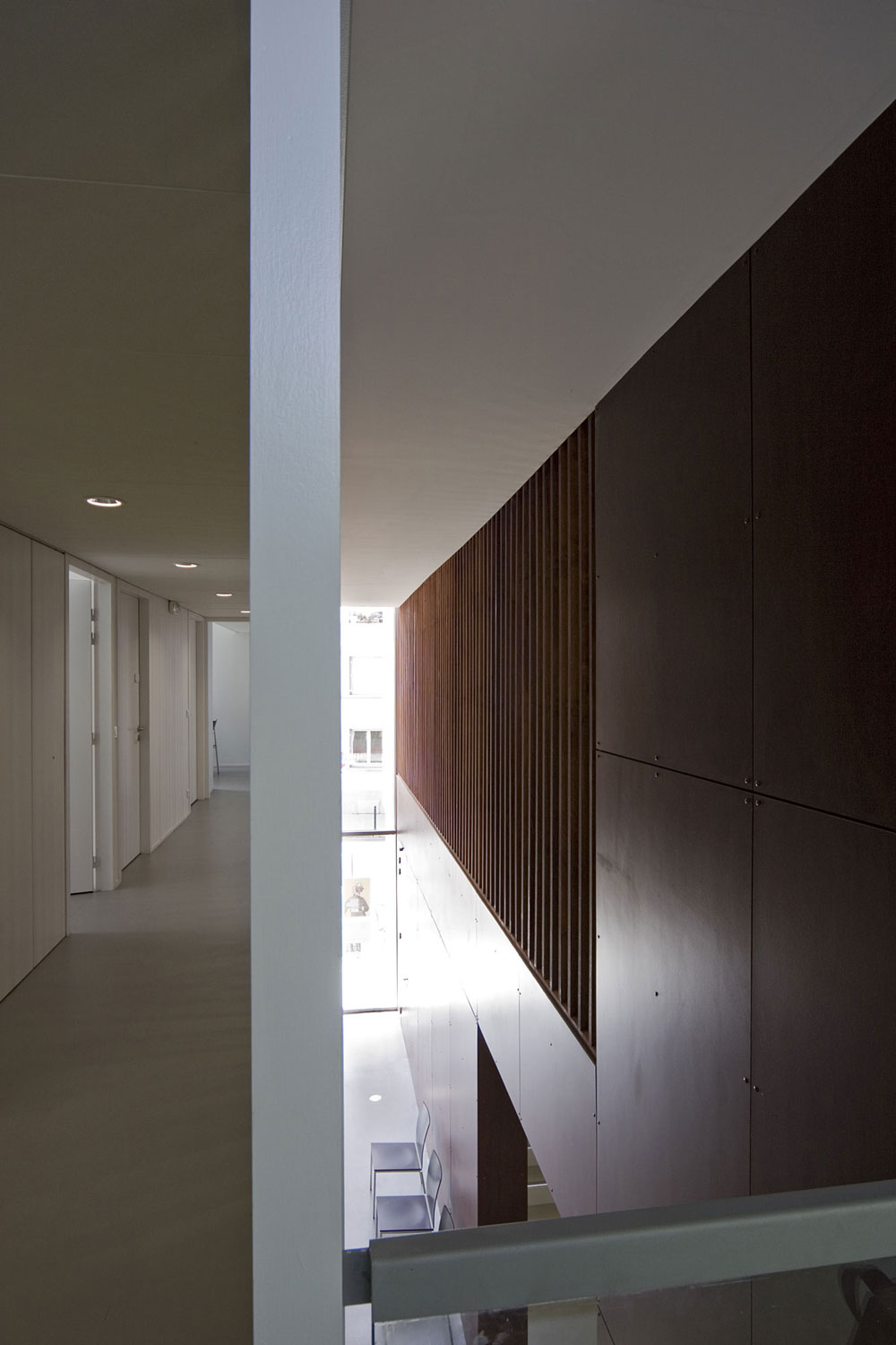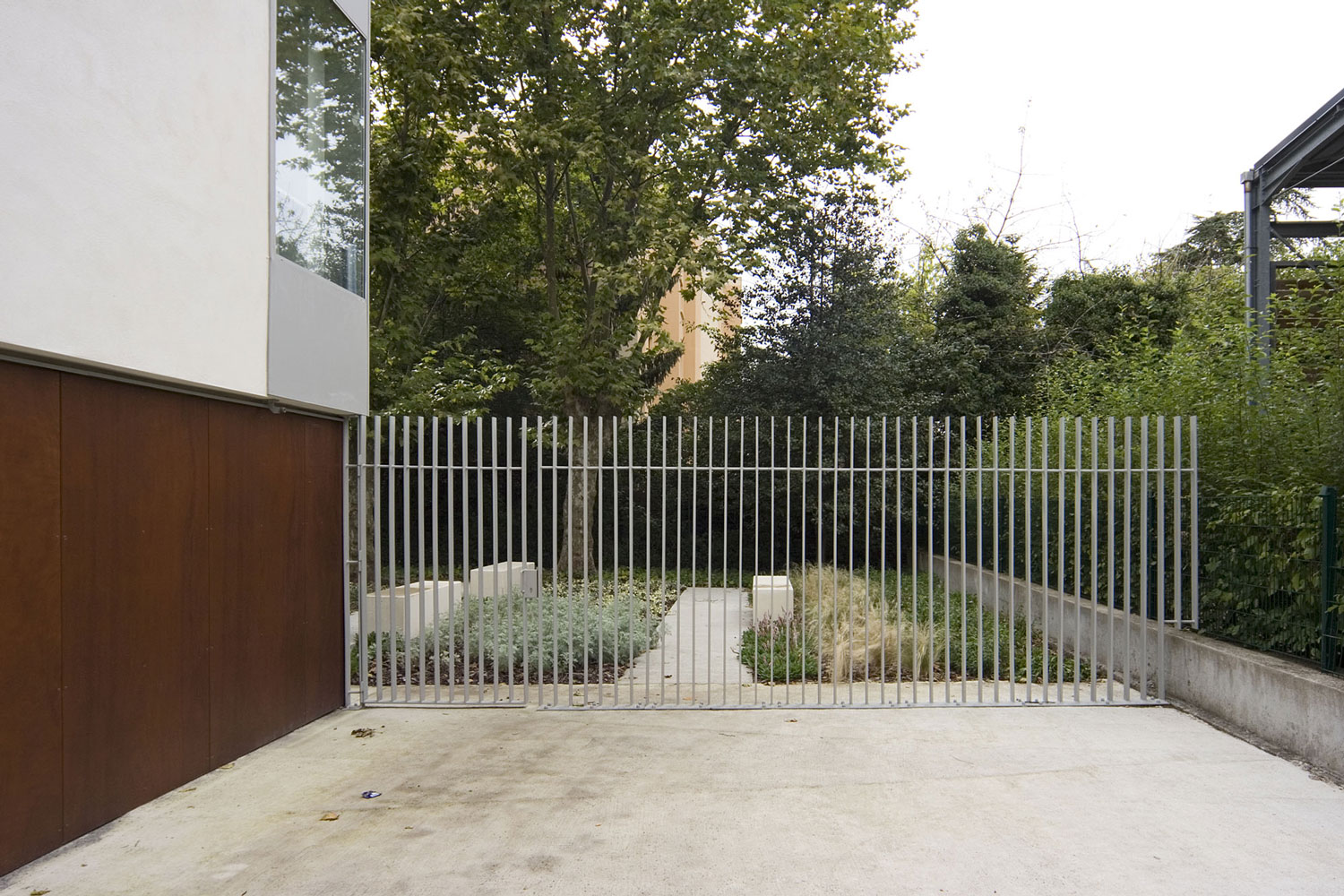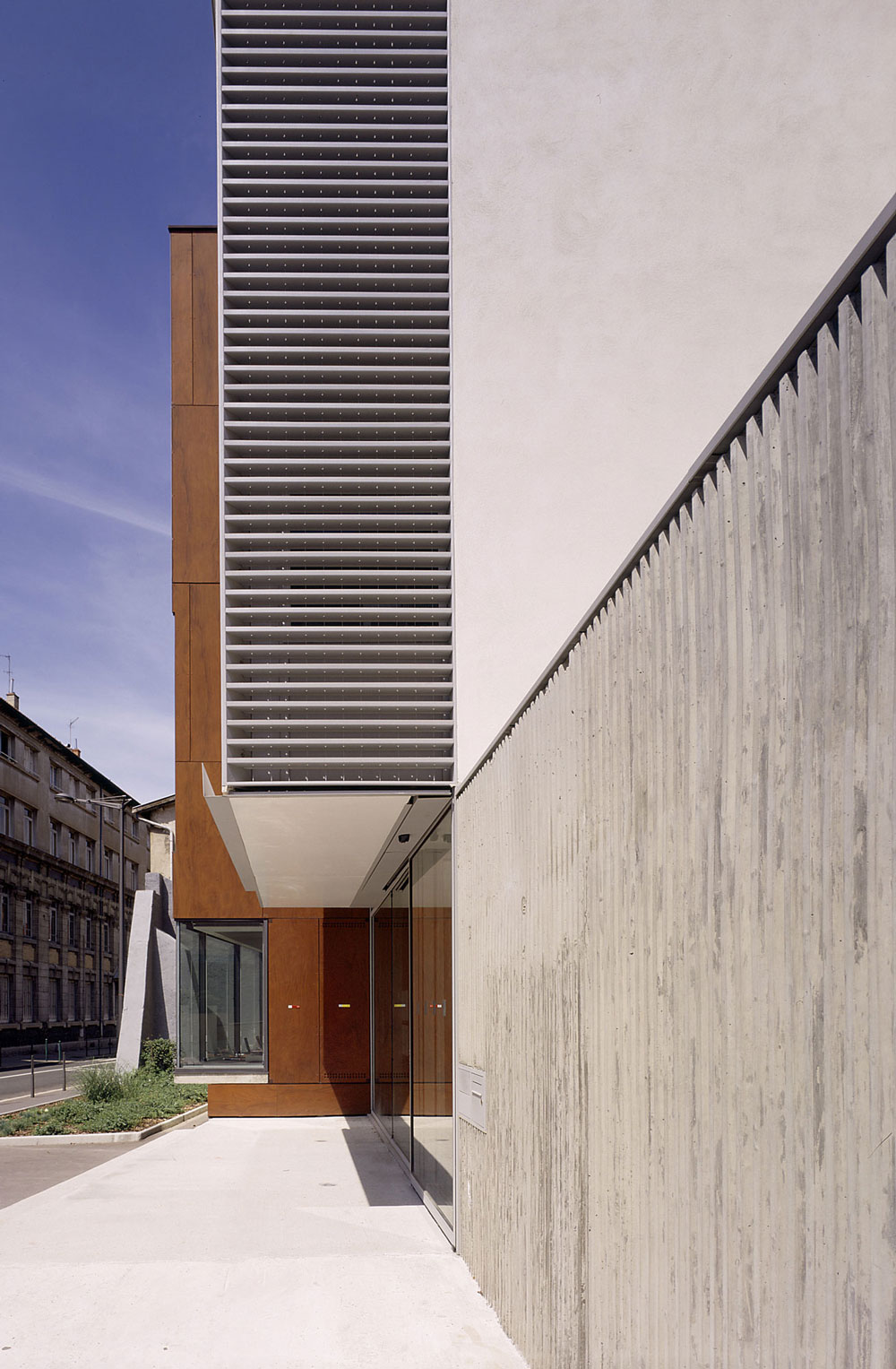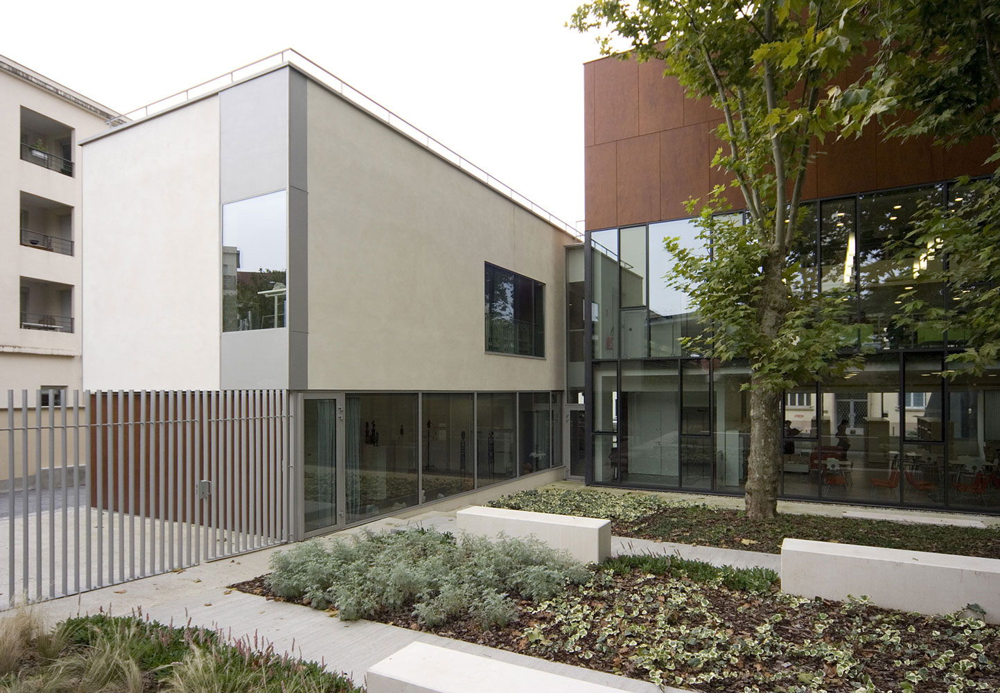 Un volume bas et étroit accueille les services et articule le projet avec le contexte faubourien de la venelle.