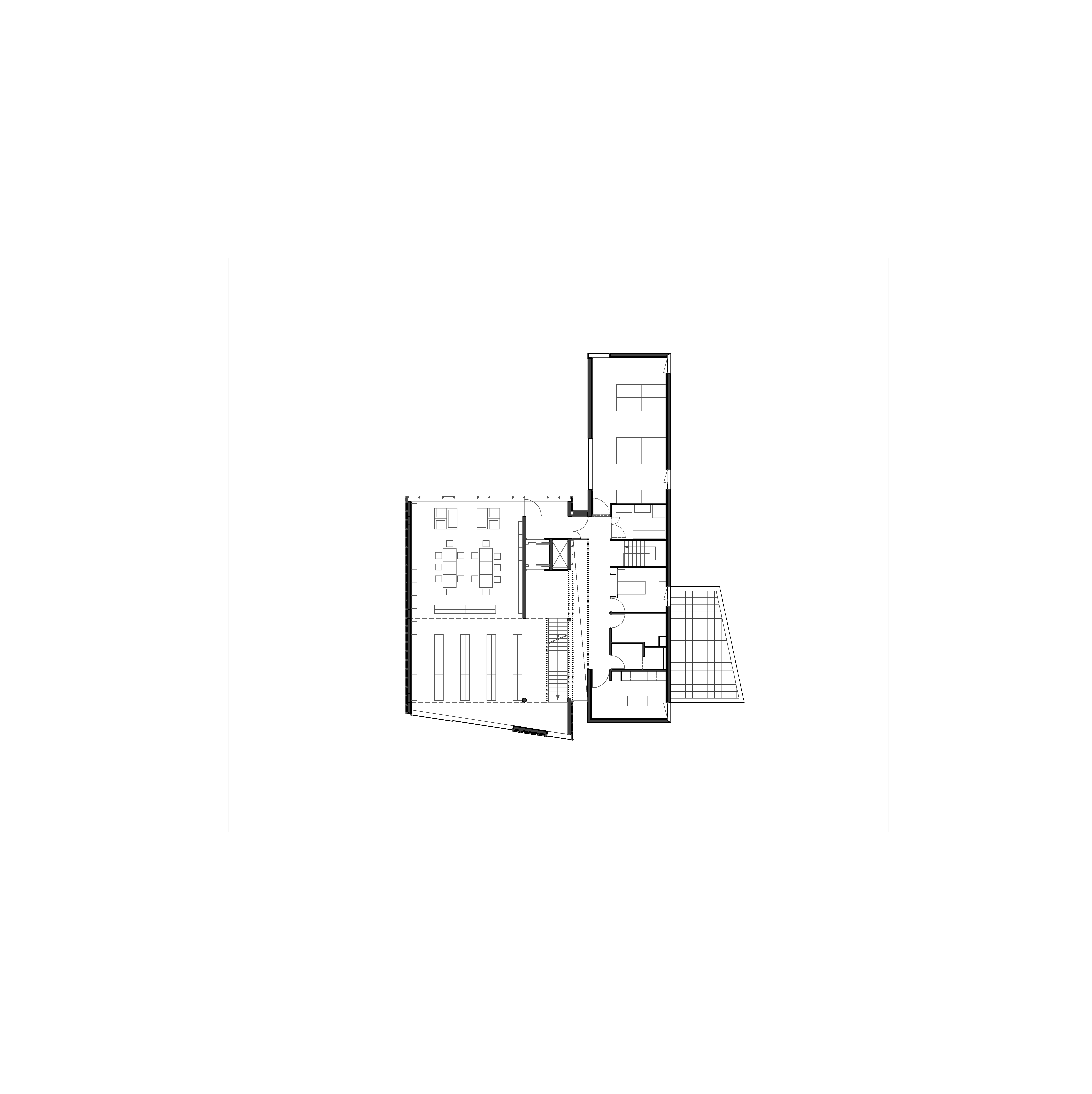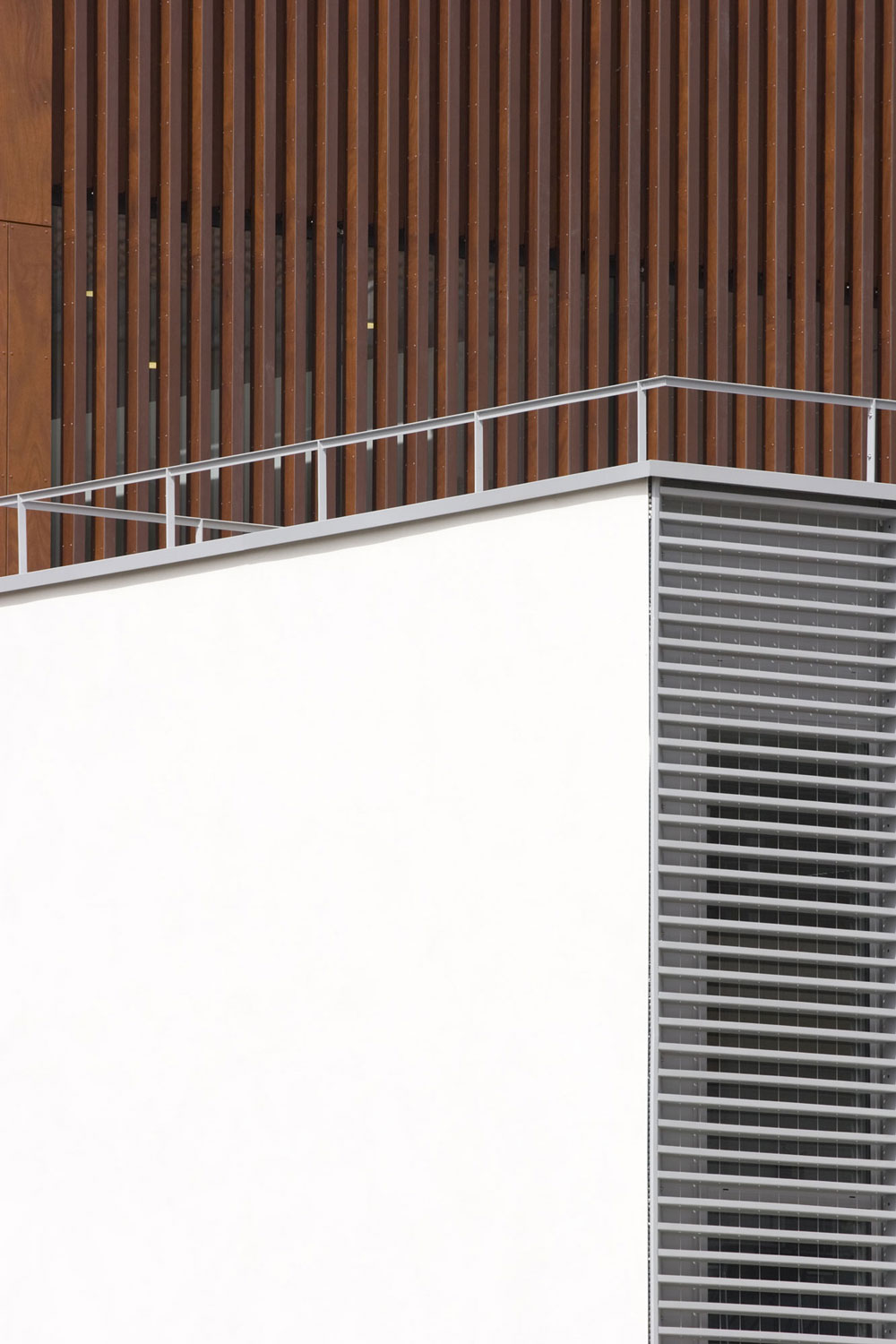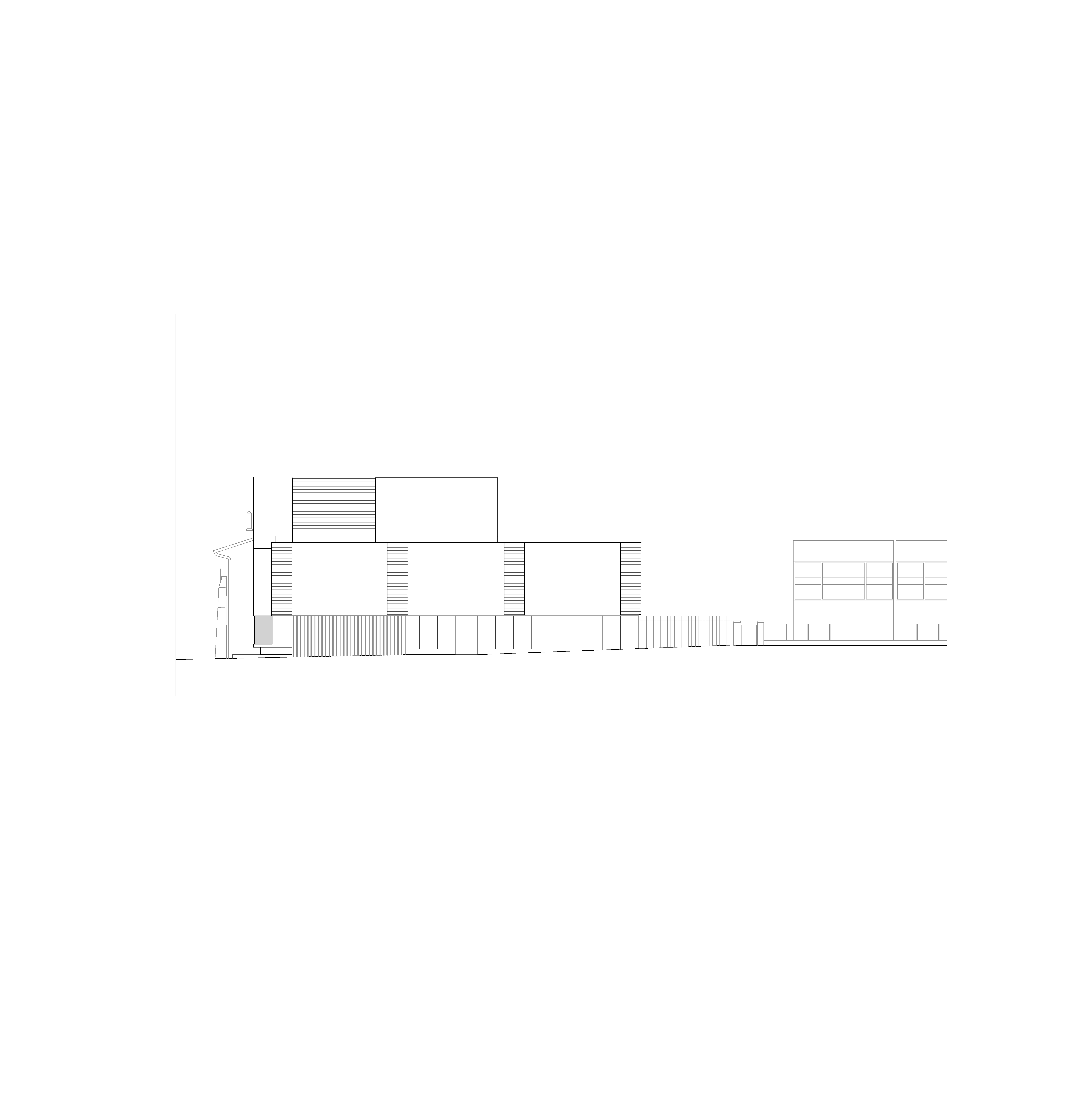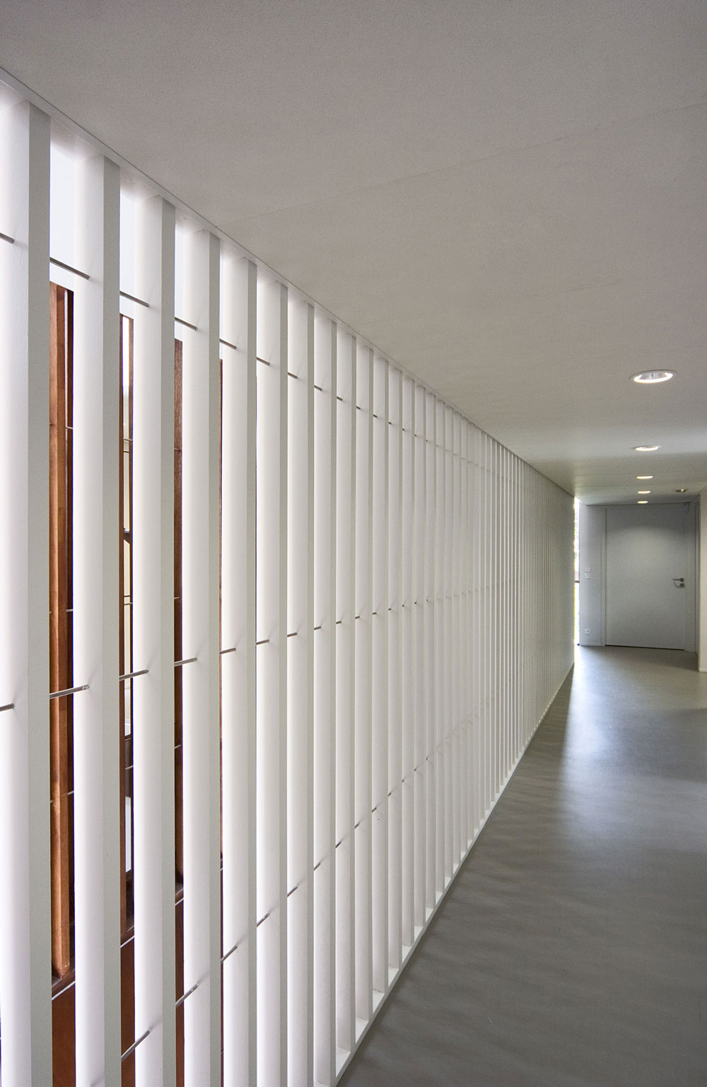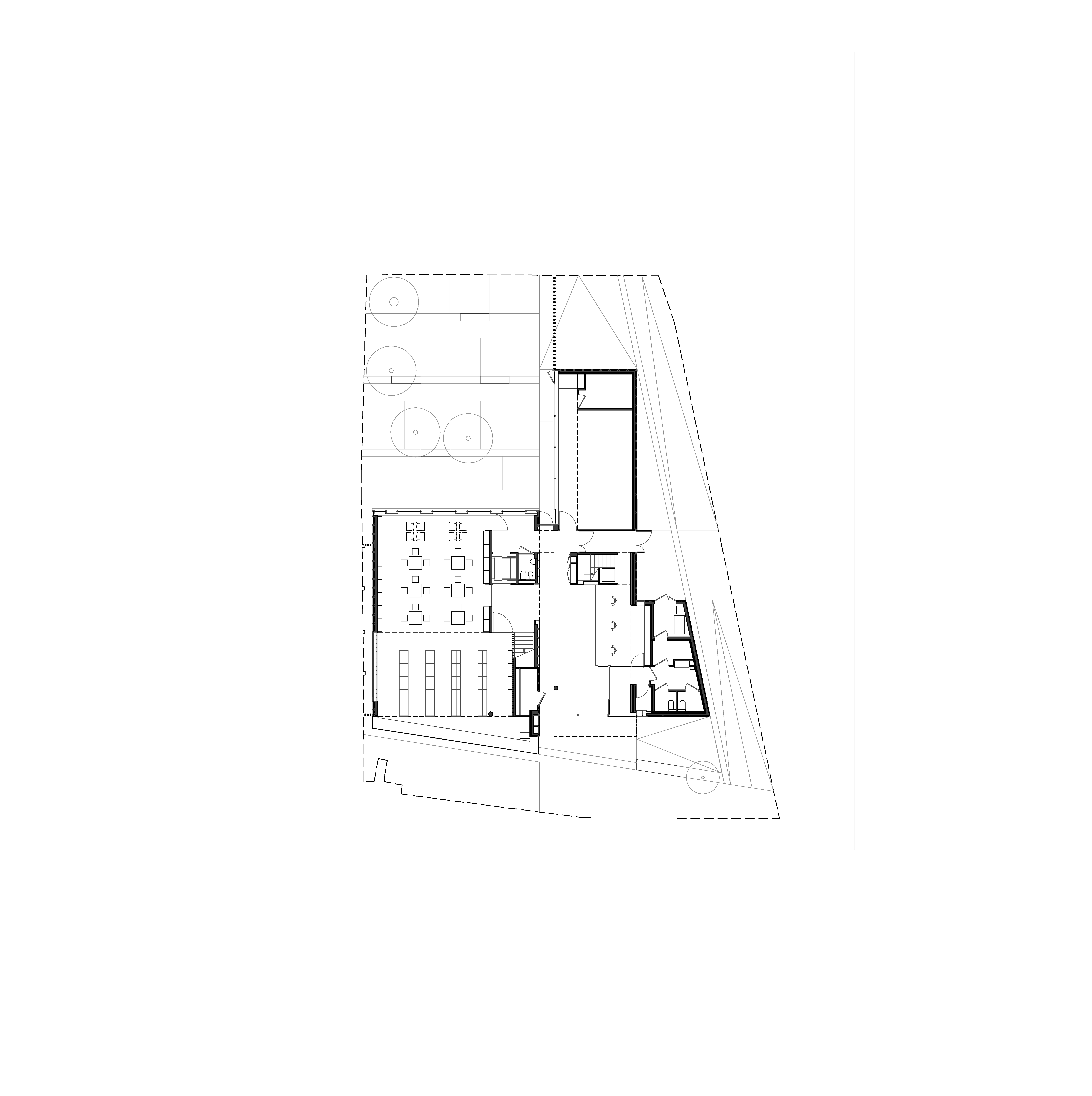Un volume bas et étroit accueille les services et articule le projet avec le contexte faubourien de la venelle.