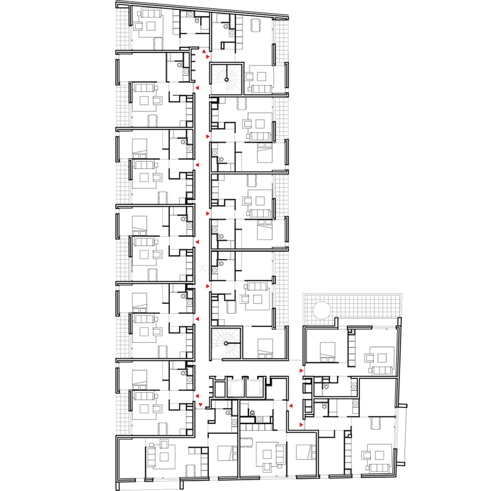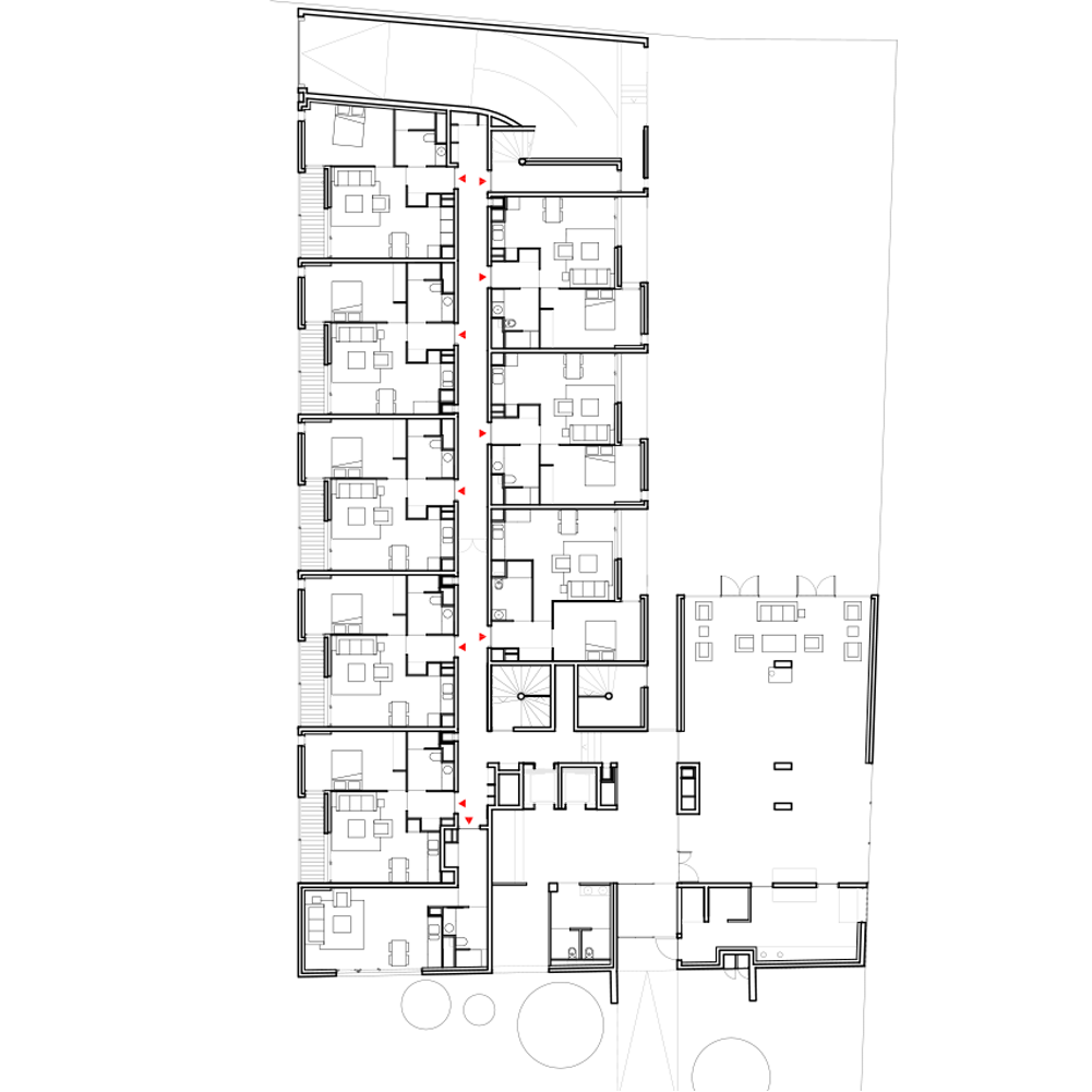 – le rez-de-chaussée accueille des espaces de services dédiés uniquement aux résidents et à la gestion du bâtiment : le hall, restaurant, l’espace d’accueil, bureau. Le sous-sol accueille, lui, le reste des espaces de services : les locaux de tri sélectif, le local entretien, la chaufferie, les locaux techniques (eau, TGBT, FT), ainsi que l’espace de réserve et un atelier.