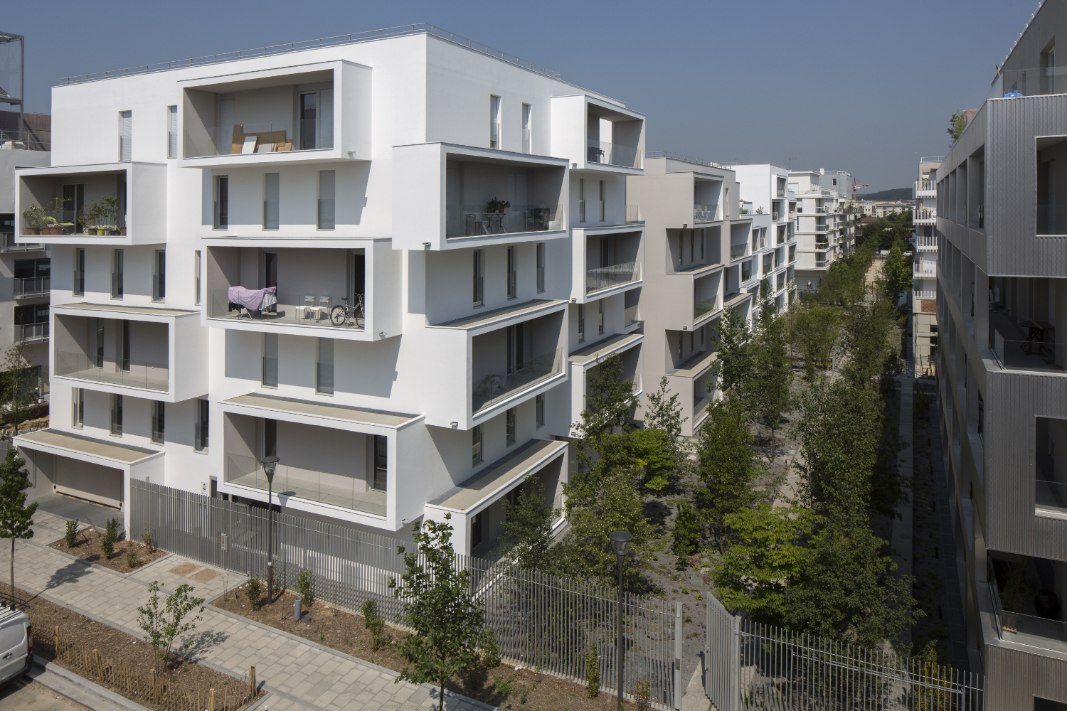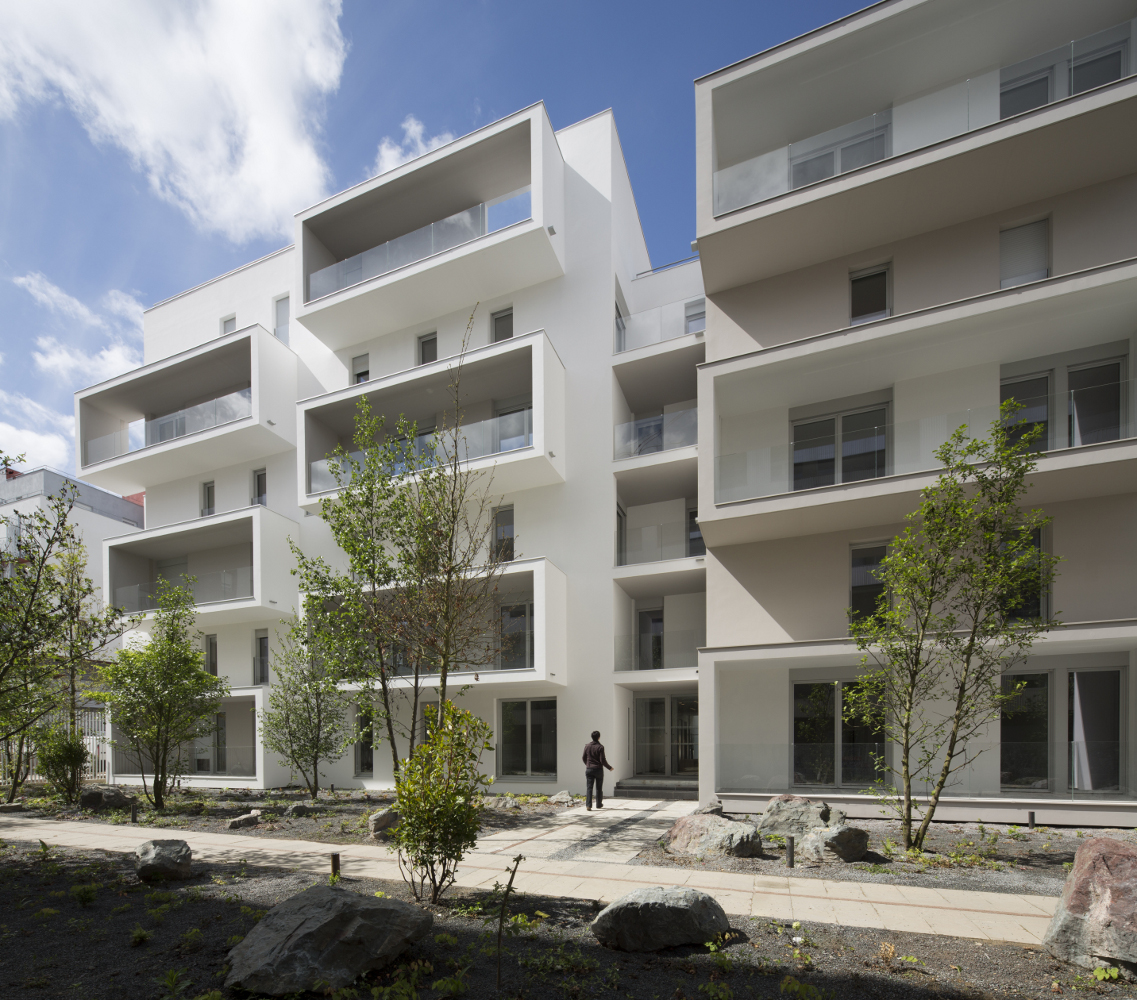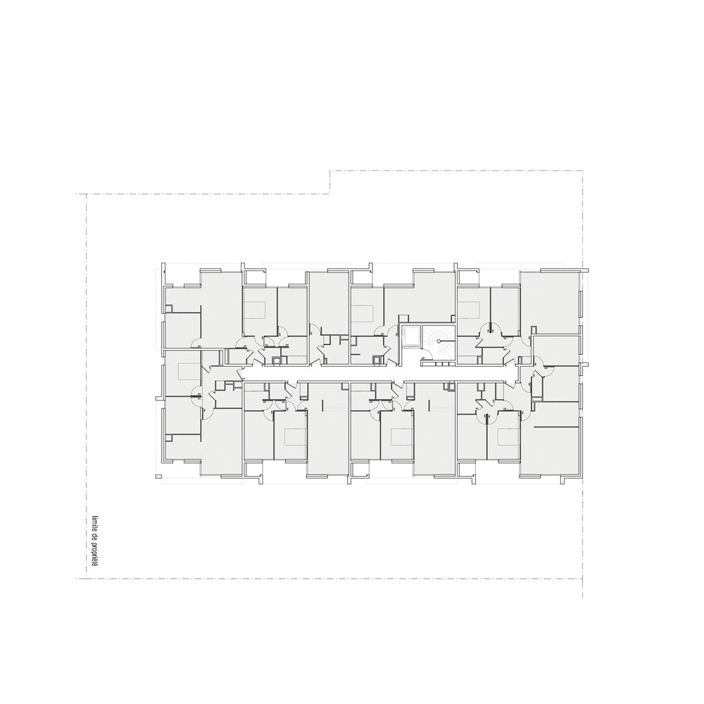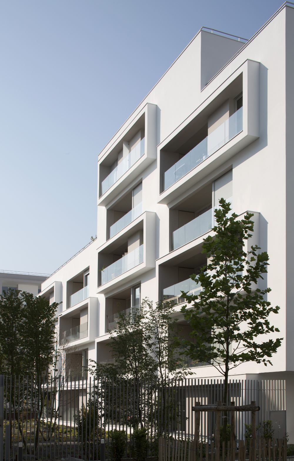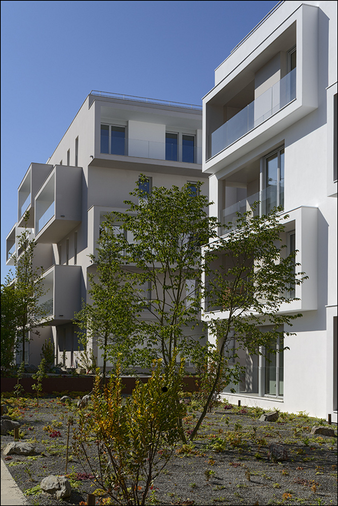le deuxième comporte deux plots ménageant une faille centrale offrant une transparence perpendiculaire au mail et un accès direct des habitants vers le jardin. la façade révèle la situation d’angle des logements par des porte-à-faux placés en quinconce sur chacune des façades. les logements s’orientent ainsi sur toutes les façades du projet. ces boites prolongent chaque logement par un espace extérieur isolé projeté vers la frondaison des arbres. chacun de ces cadres exprime la modénature du bâti par une échelle généreuse distincte de celle des baies logements.