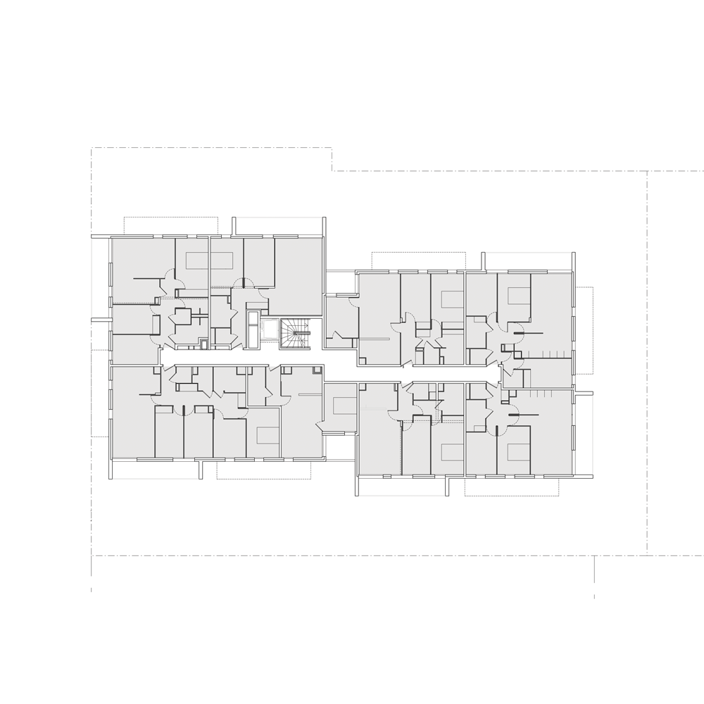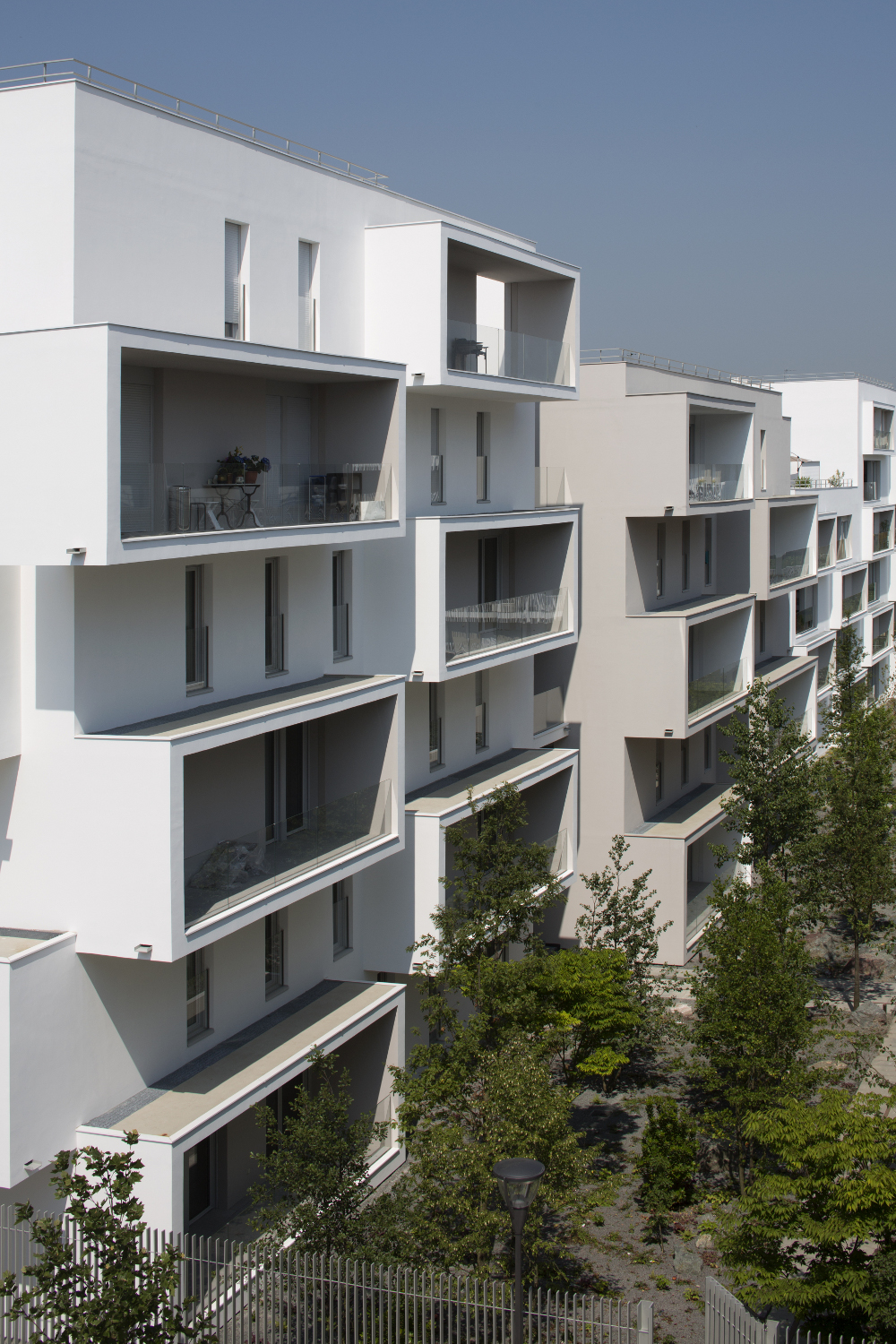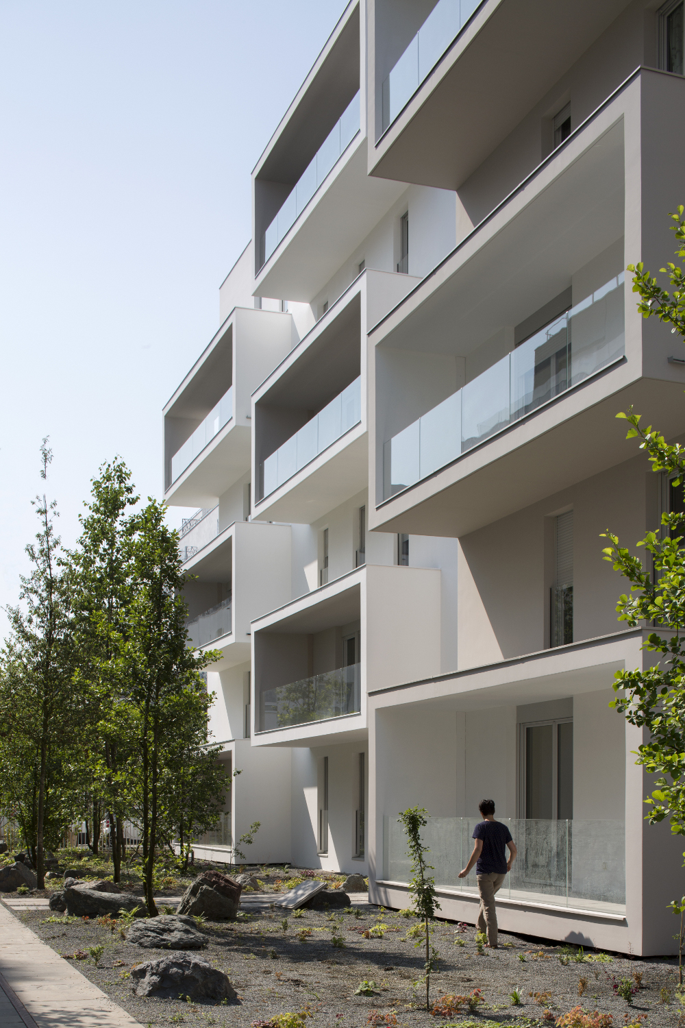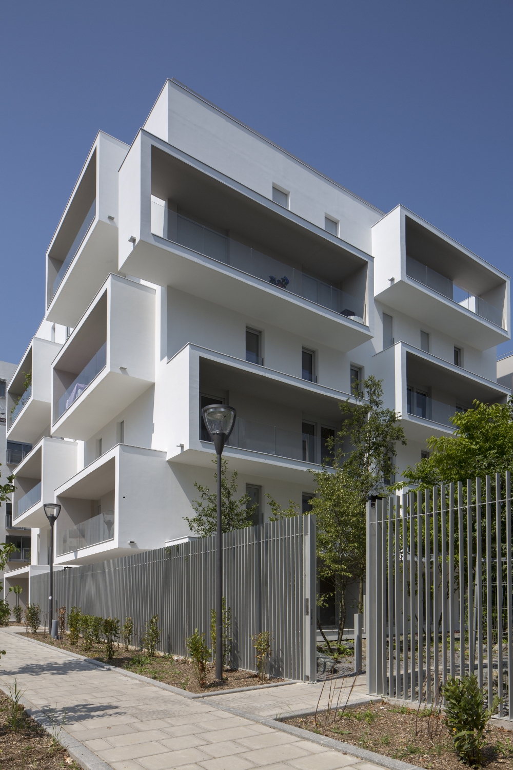 le deuxième comporte deux plots ménageant une faille centrale offrant une transparence perpendiculaire au mail et un accès direct des habitants vers le jardin. la façade révèle la situation d’angle des logements par des porte-à-faux placés en quinconce sur chacune des façades. les logements s’orientent ainsi sur toutes les façades du projet. ces boites prolongent chaque logement par un espace extérieur isolé projeté vers la frondaison des arbres. chacun de ces cadres exprime la modénature du bâti par une échelle généreuse distincte de celle des baies logements.