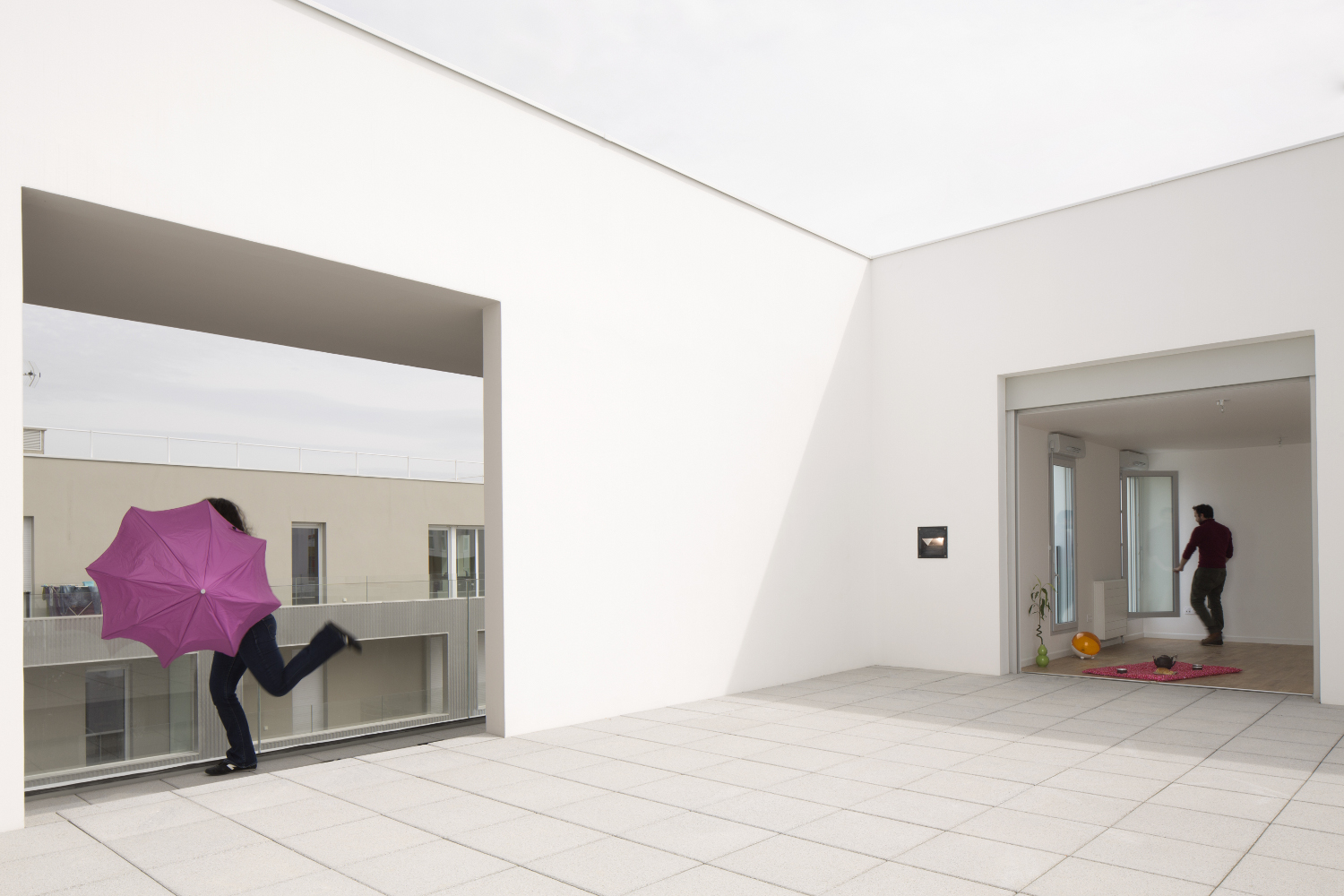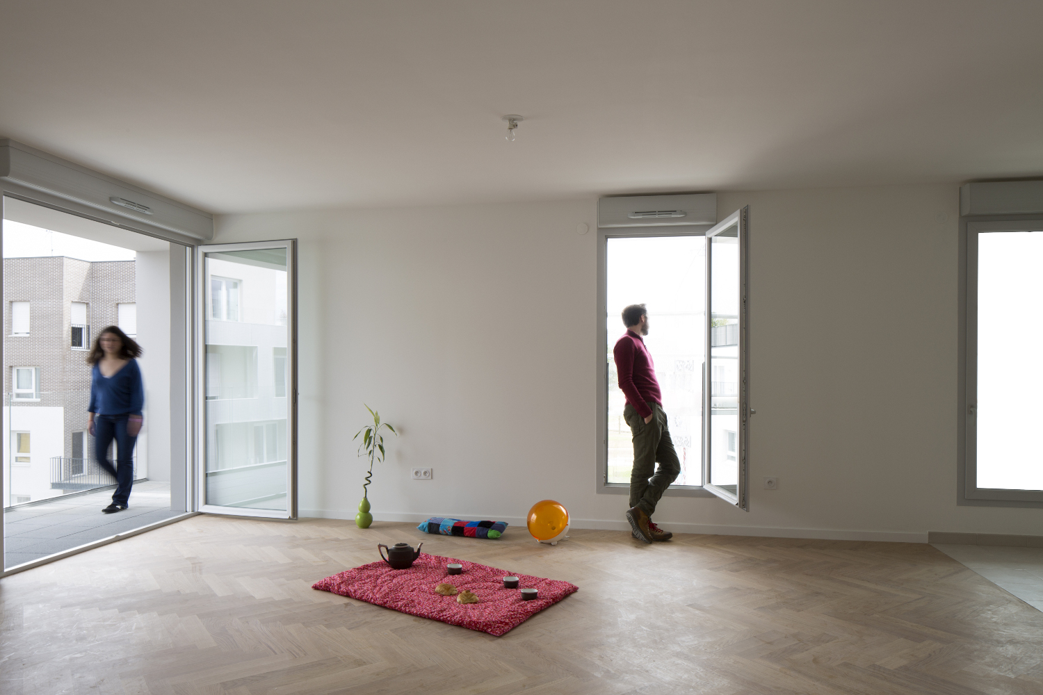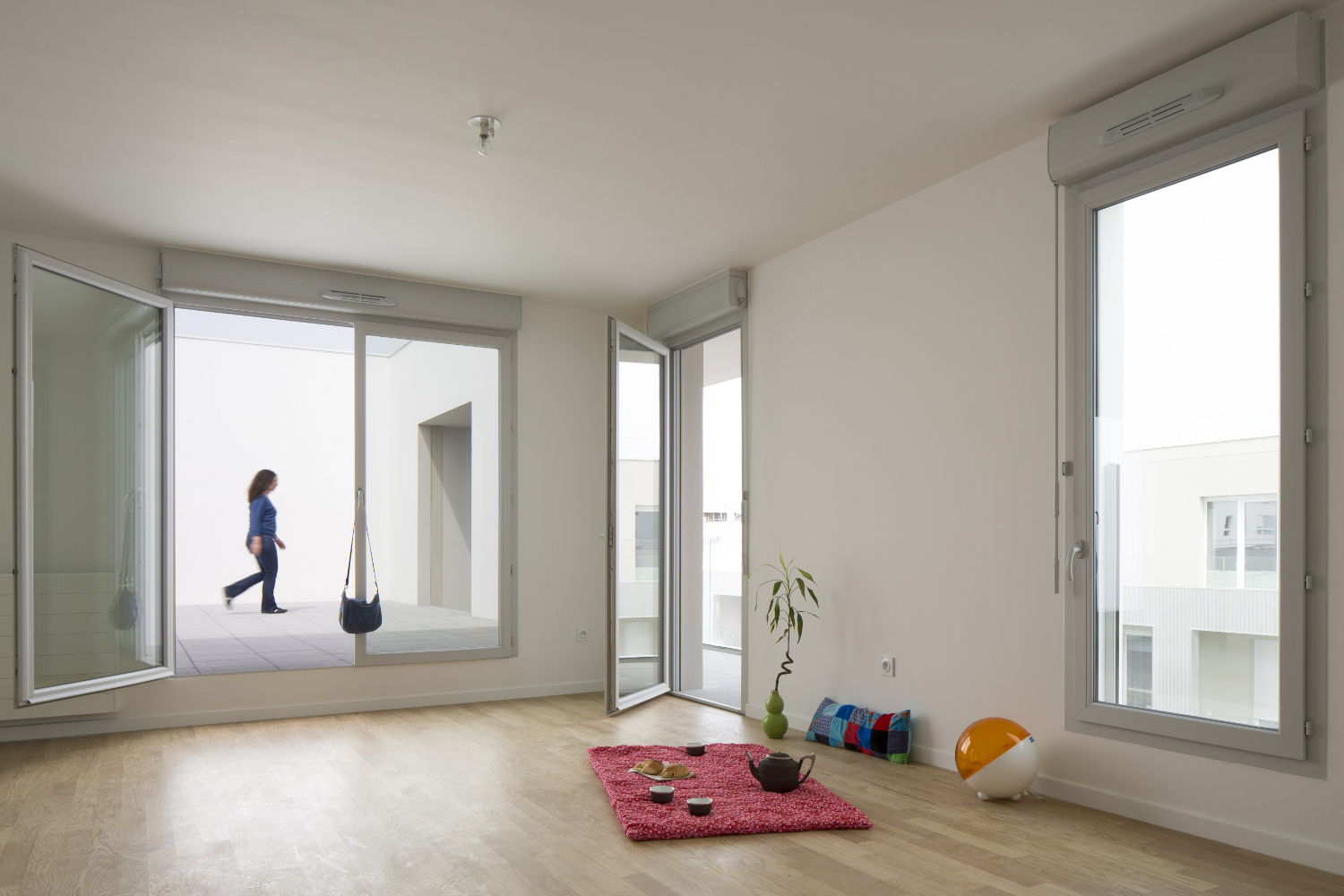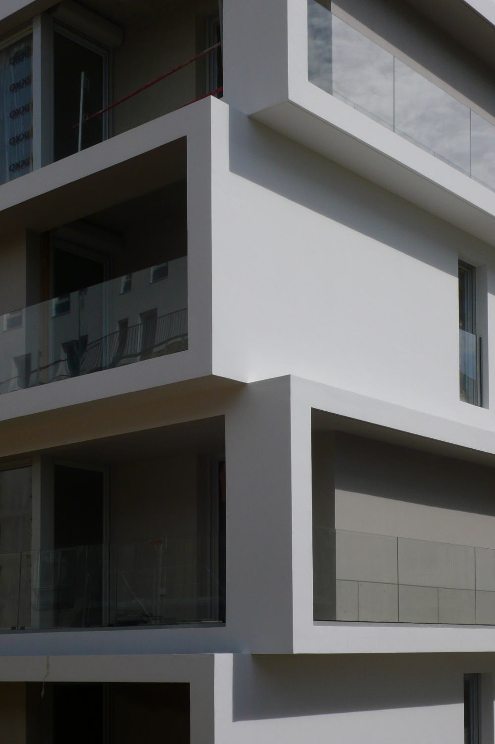 le deuxième comporte deux plots ménageant une faille centrale offrant une transparence perpendiculaire au mail et un accès direct des habitants vers le jardin. la façade révèle la situation d’angle des logements par des porte-à-faux placés en quinconce sur chacune des façades. les logements s’orientent ainsi sur toutes les façades du projet. ces boites prolongent chaque logement par un espace extérieur isolé projeté vers la frondaison des arbres. chacun de ces cadres exprime la modénature du bâti par une échelle généreuse distincte de celle des baies logements.