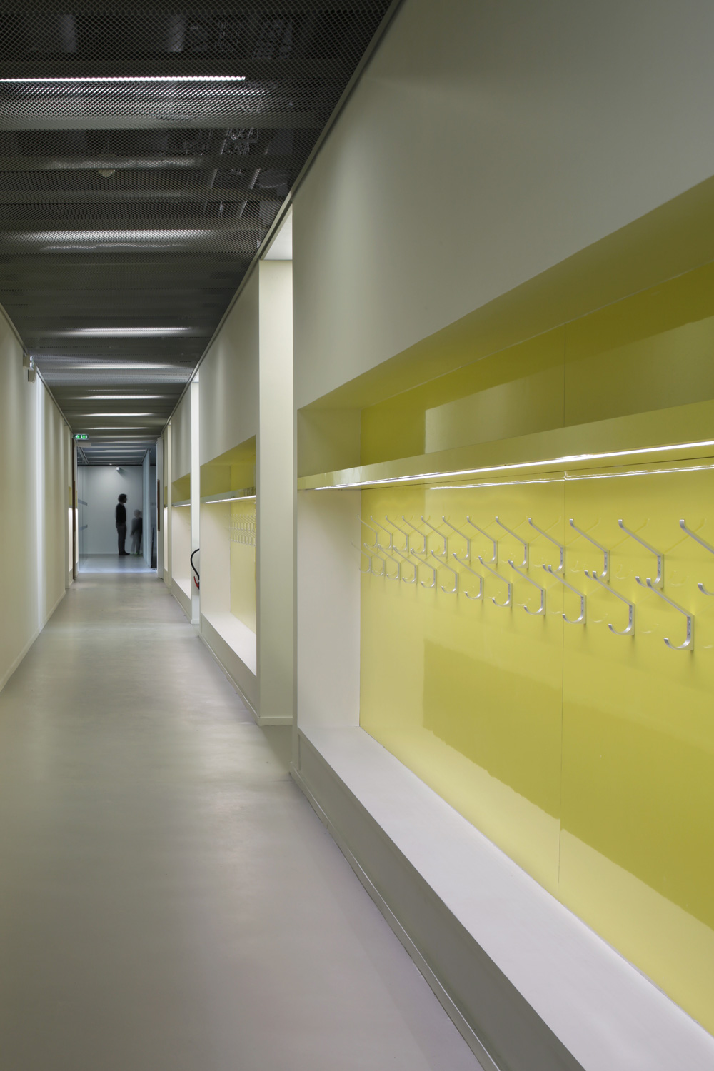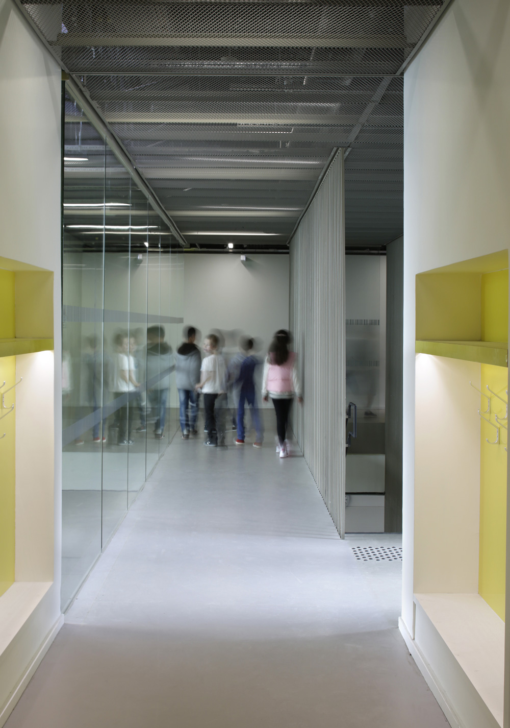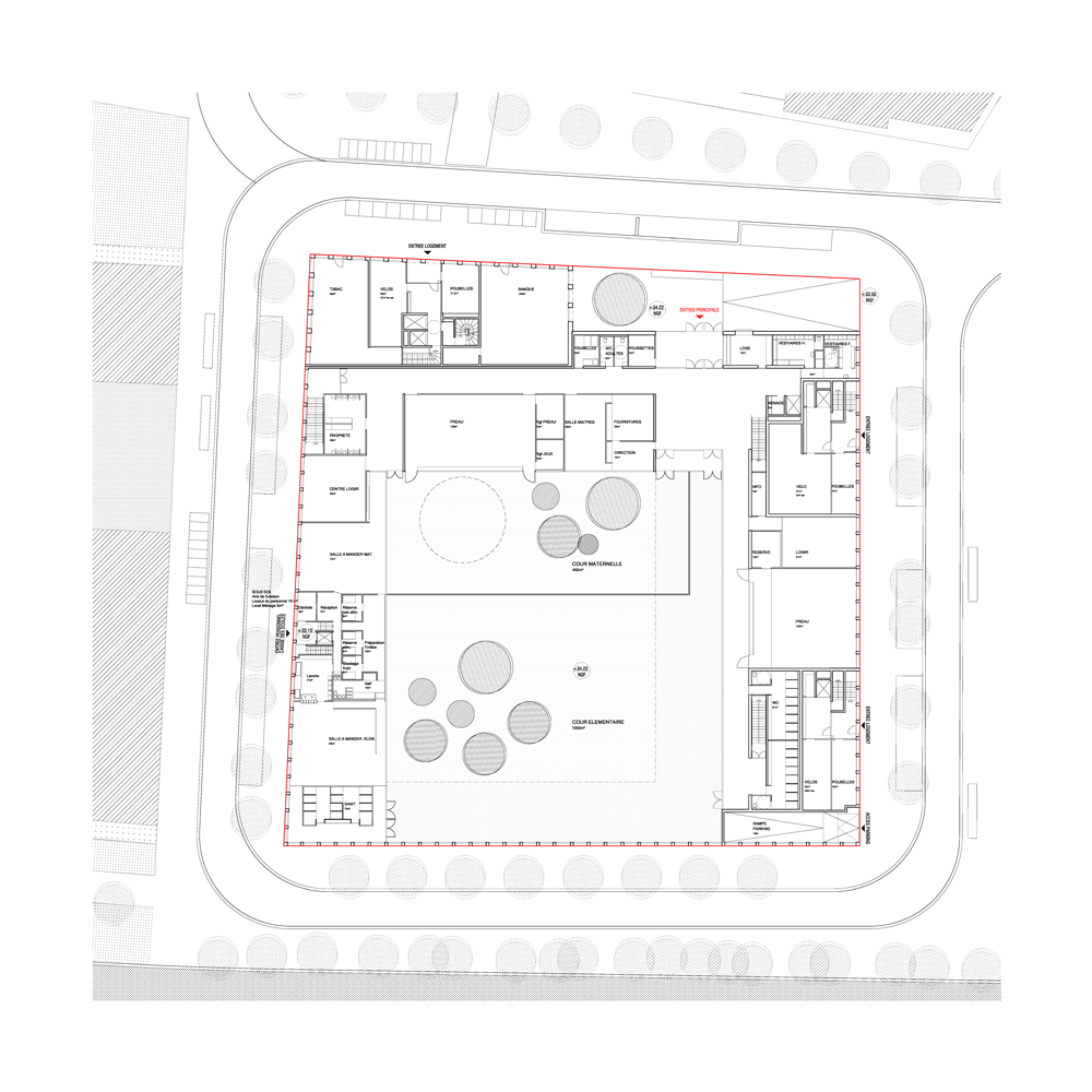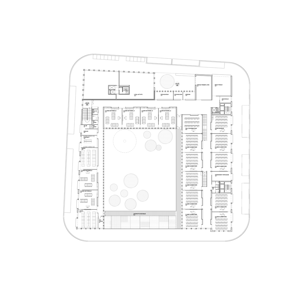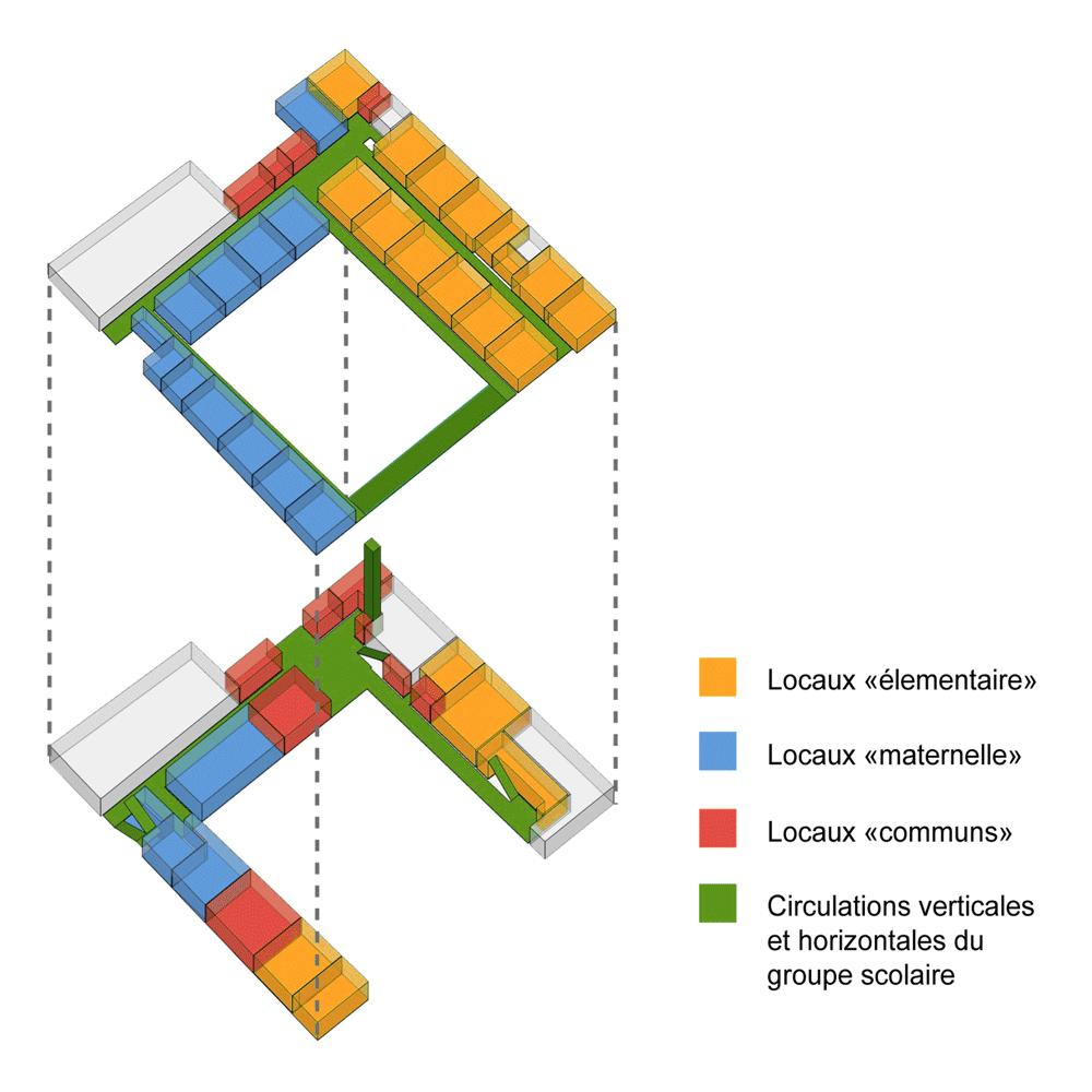 Le programme prend place dans un u encadrant la cour sur deux niveaux. Au niveau supérieur sont prévues les salles de classes et les programmes spécifiques (assistante sociale, rééducation, médecin etc.) tandis qu’au rez-de-chaussée sont regroupés l’ensemble des éléments communs à chacune des écoles et devant être en relation étroite avec l’entrée et la cour (préau, centre de loisirs, salle des maitres, restauration etc).