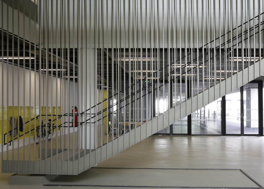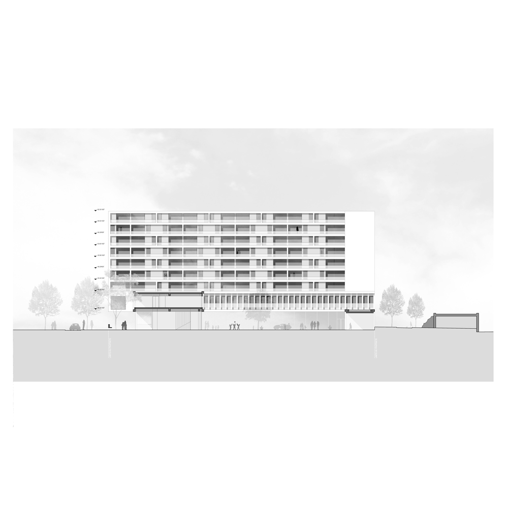 Trois halls permettent de distribuer les 125 logements du programme et de limiter ainsi la superposition des programmes avec l’équipement. Les deux bâtiments développent une façade sur le thème du quinconce, faisant disparaître l’échelle domestique de la baie au profit de motifs plus généreux.