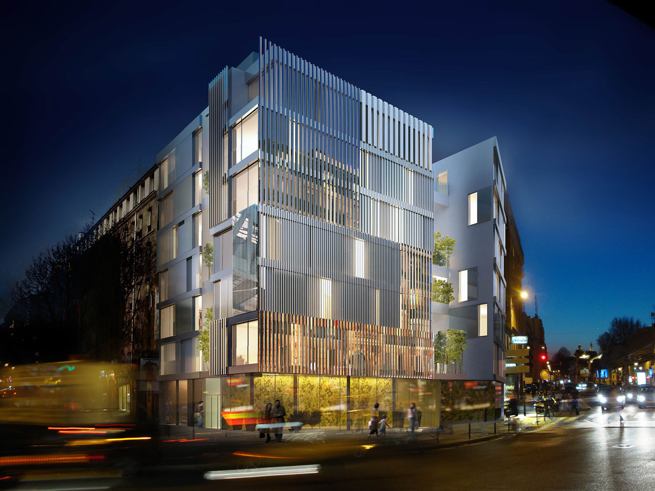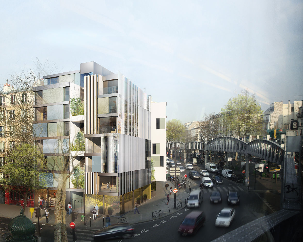 – b / deux volumes verticaux (R+ 6 et R+6 + attique), prolongeant les fronts bâtis existants, sont adossés respectivement sur le mitoyen du n° 149 du boulevard de la Villette et n° 265 de la rue du faubourg Saint Martin. Leur façade sur rue est constituée d’une série de panneaux verticaux en verre émaillé fixes ou mobiles séparés par des bandeaux horizontaux.