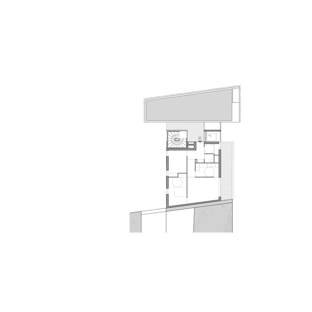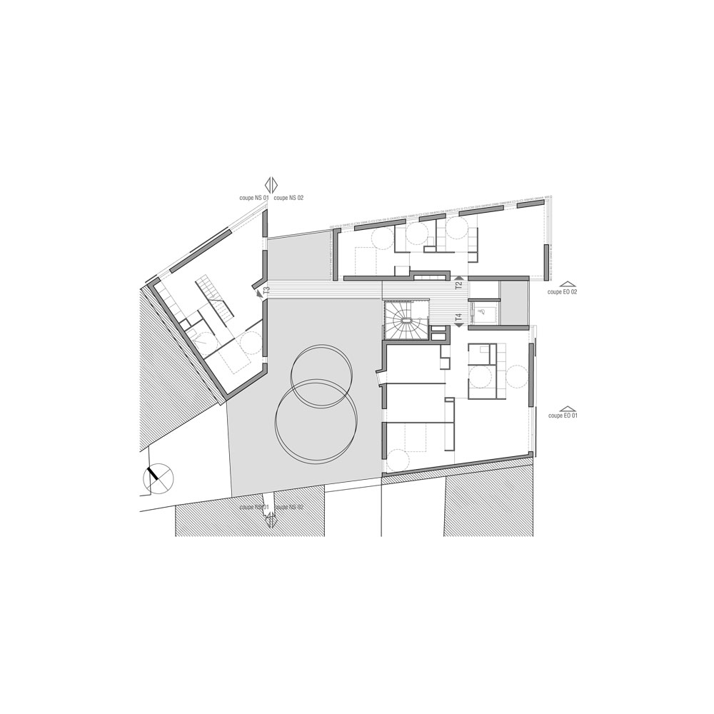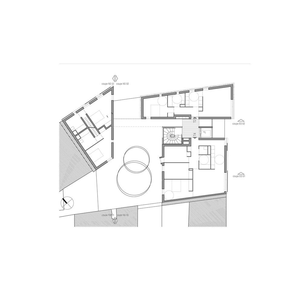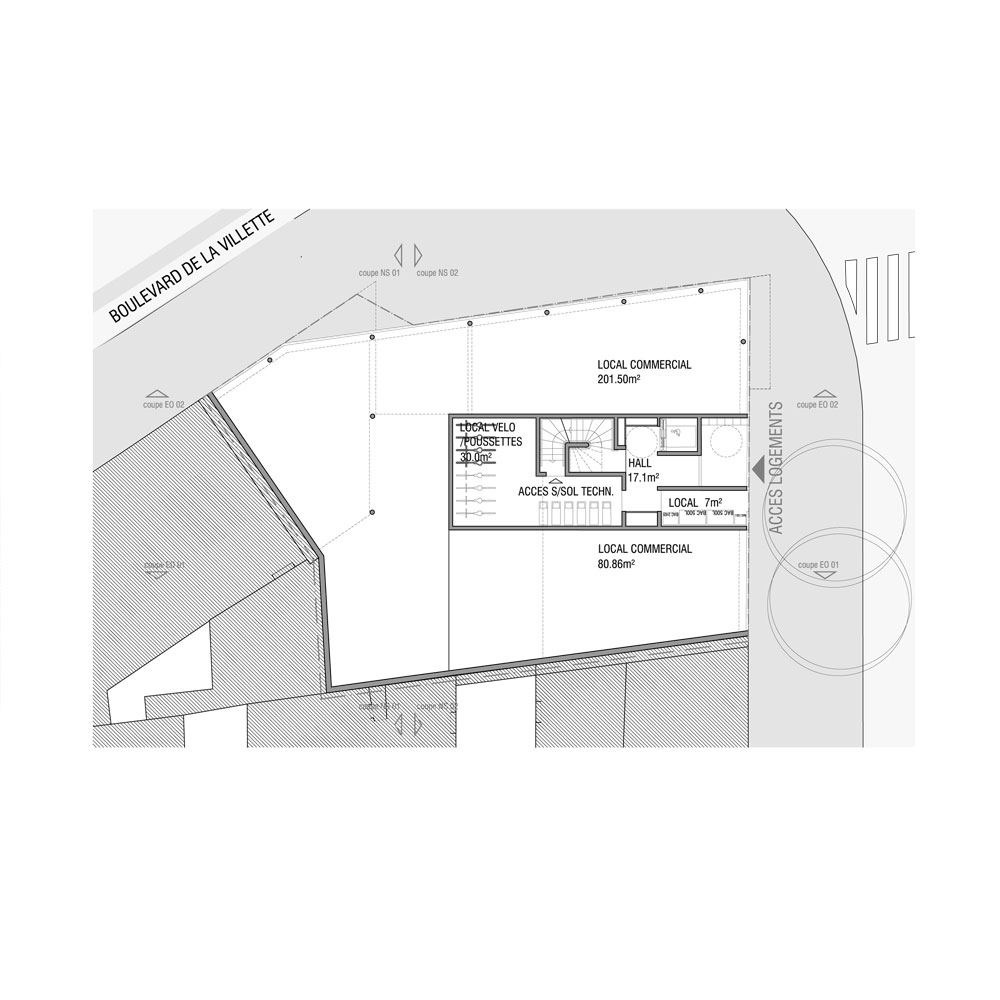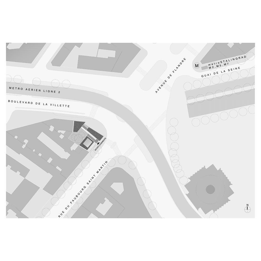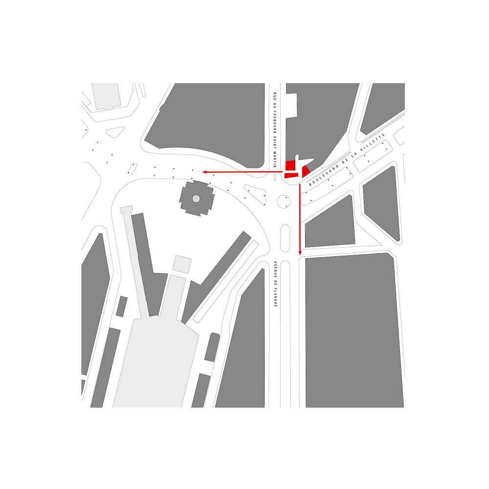 L’expression de l’angle est obtenue par un glissement latéral du bâti formant un léger porte-à-faux de 1m sur la rue du faubourg Saint Martin. Ce décalage adresse le projet vers le lointain, et l’esplanade de la rotonde de Ledoux.