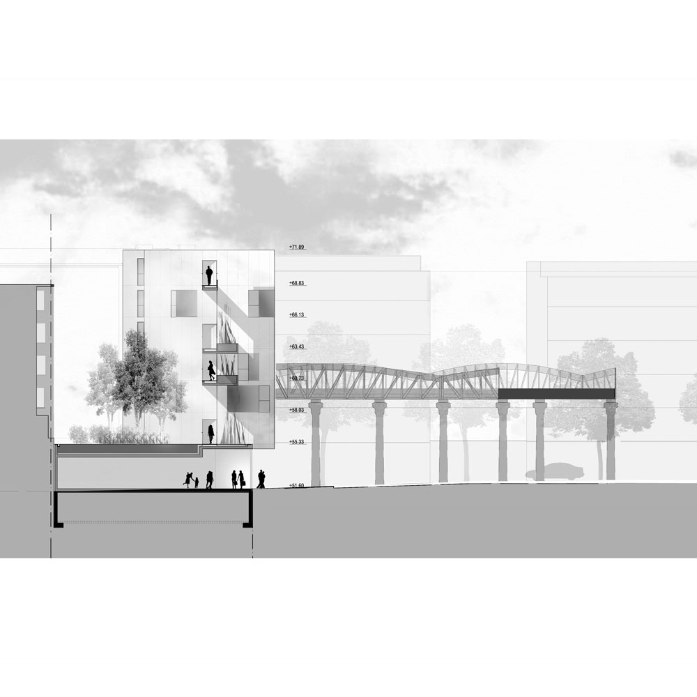 Le projet du futur immeuble de logements répond à ces 4 approches par l’assemblage de 4 corps de bâtiment : trois bâtiments autonomes reliés entre eux et "posés" un socle "commercial".