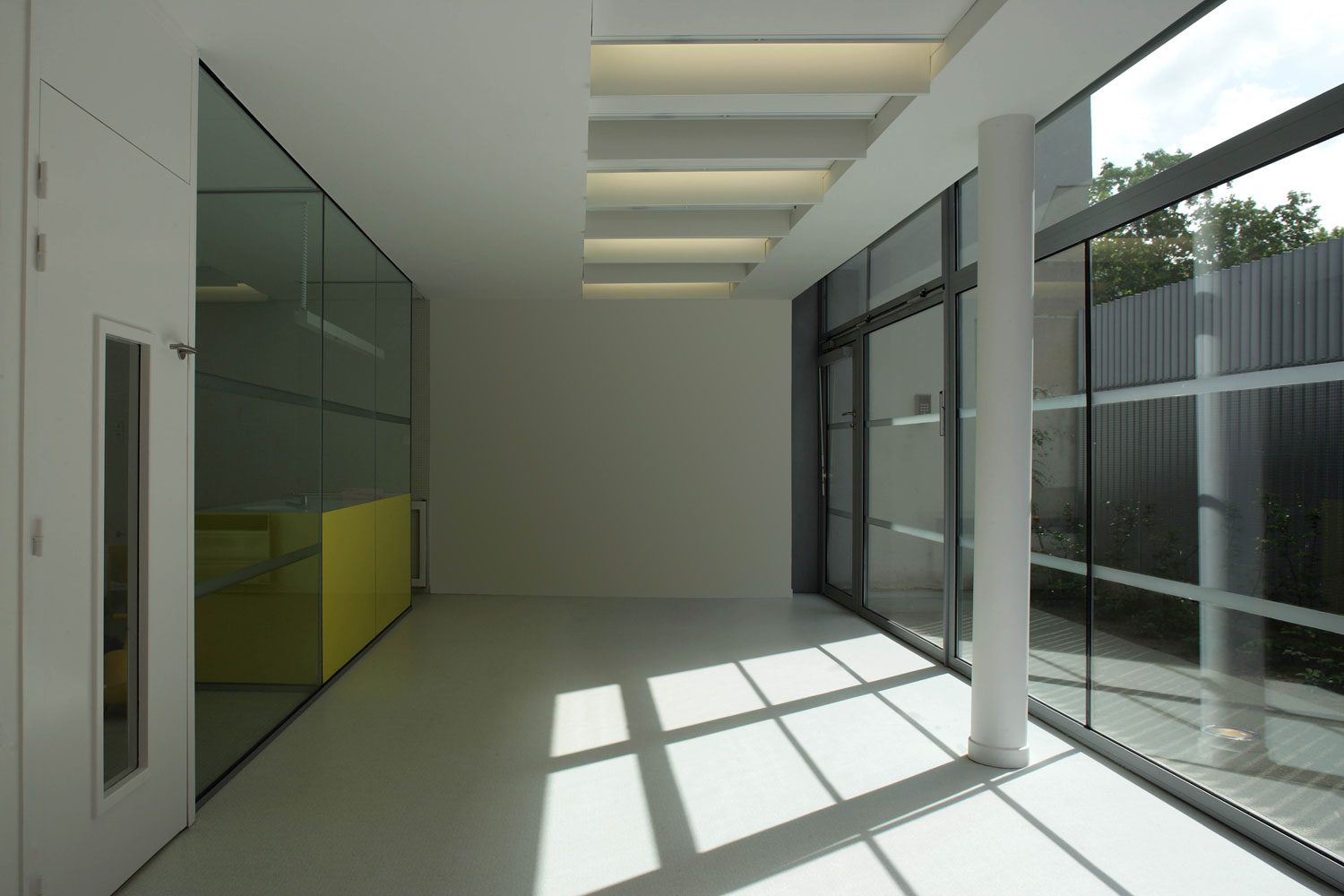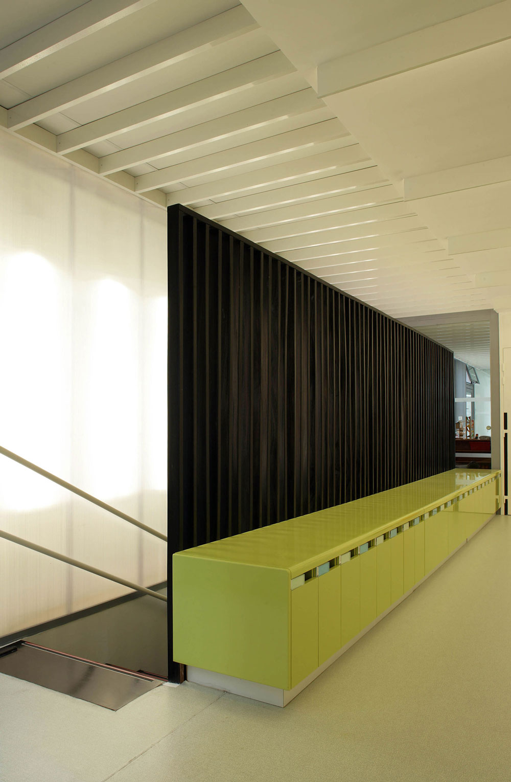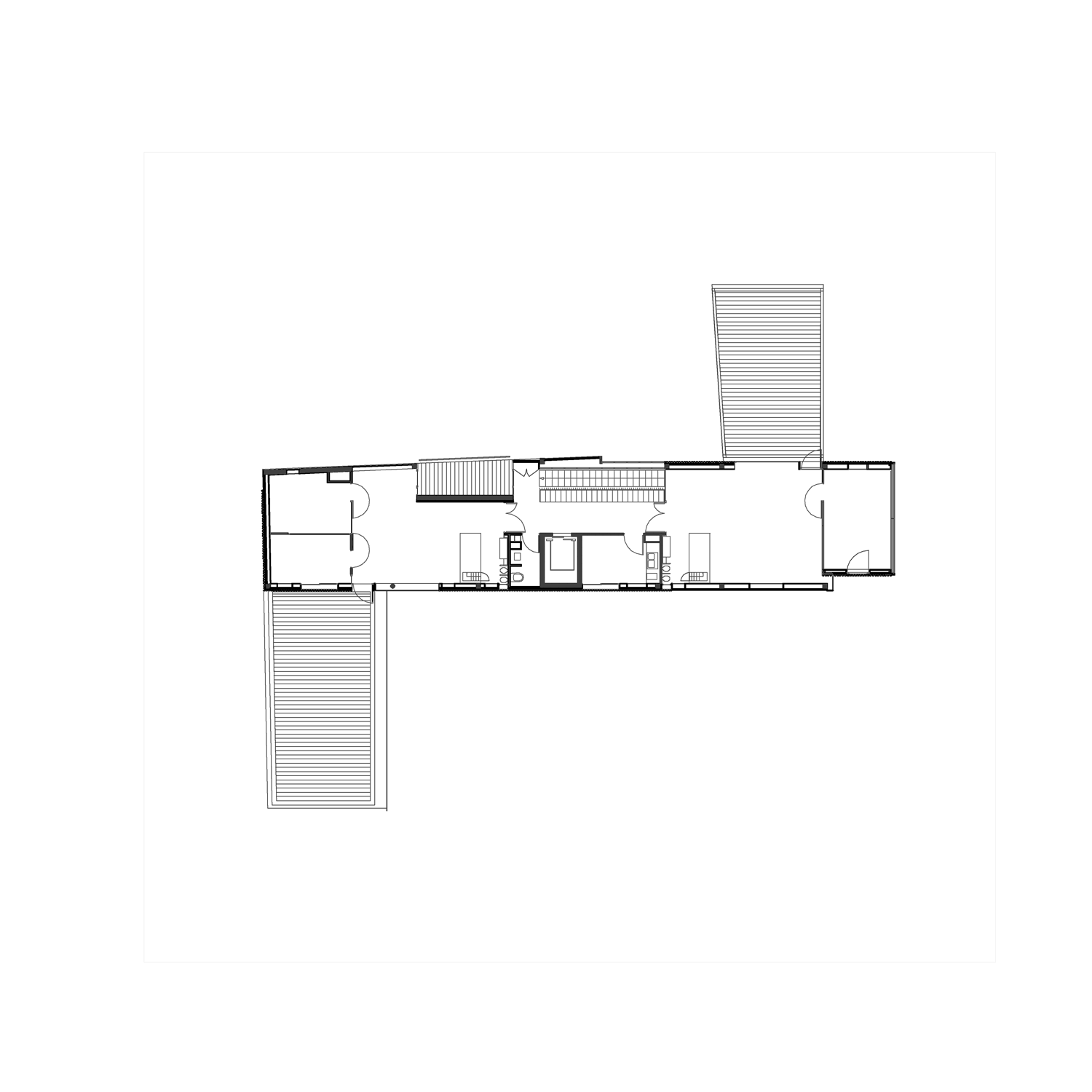 une organisation "en bâillonnette" permet d’articuler au rez-de-chaussée deux espaces d’éveil aux deux extrémités d’une bande de service. ces deux espaces offrent en toiture un prolongement extérieur aux deux autres espaces d’éveil crée à l’étage.