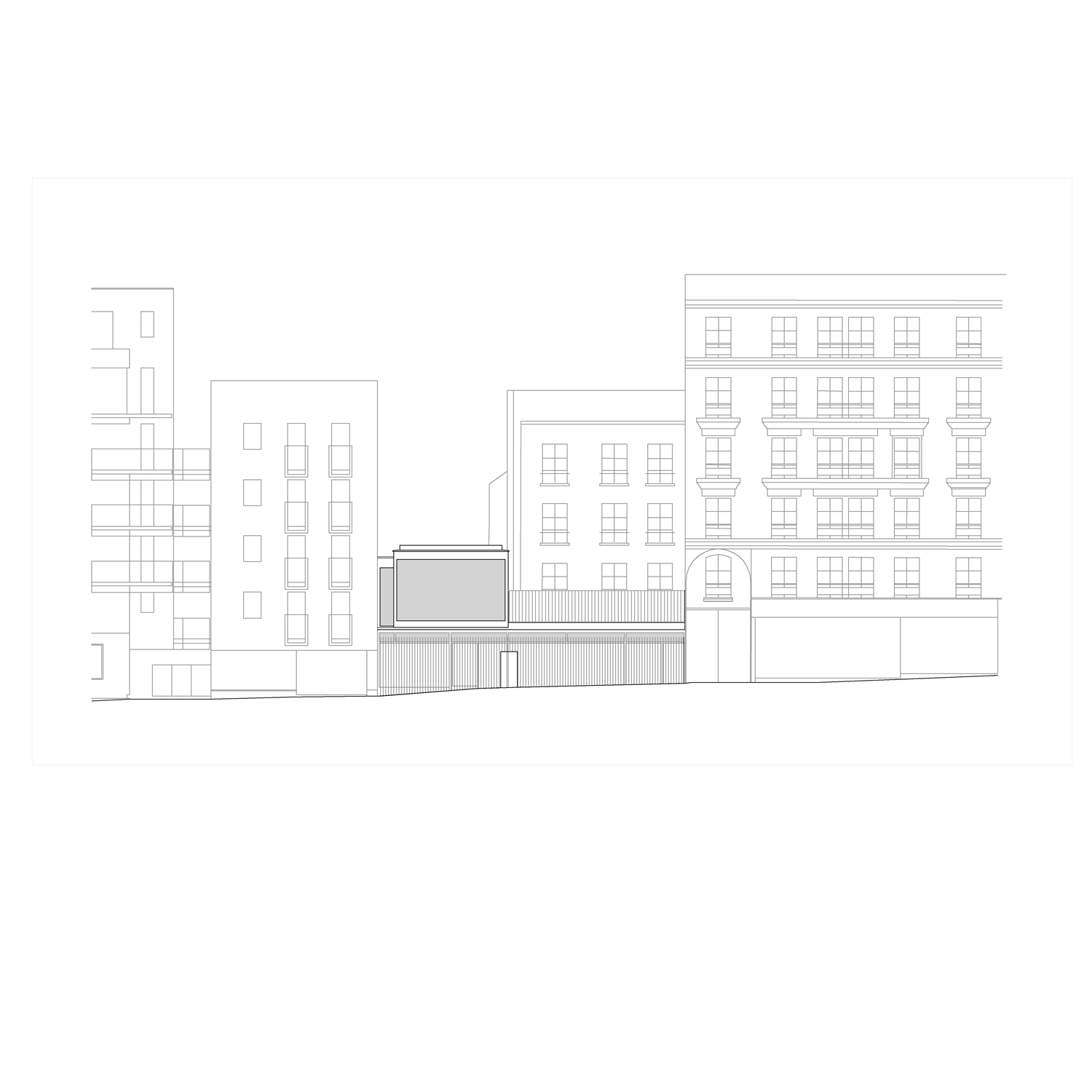le volume de l’étage, en porte à faux sur la façade en retrait le long de la rue, exprime le statut public du bâtiment tout en offrant une réponse adaptée à l’inévitable rupture d’échelle avec les immeubles voisins.