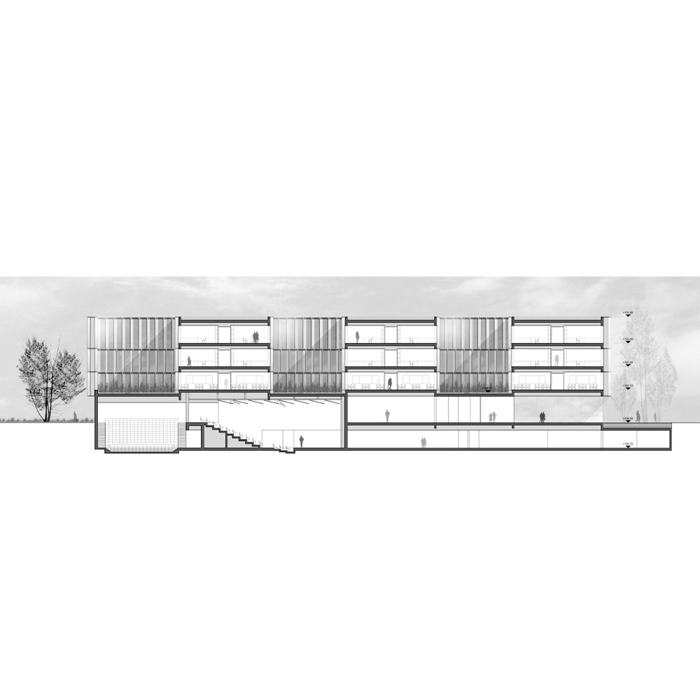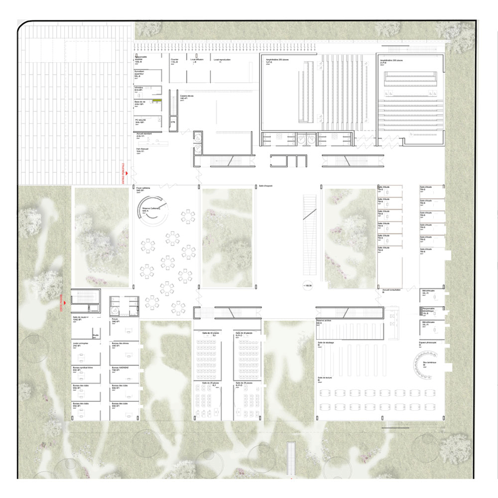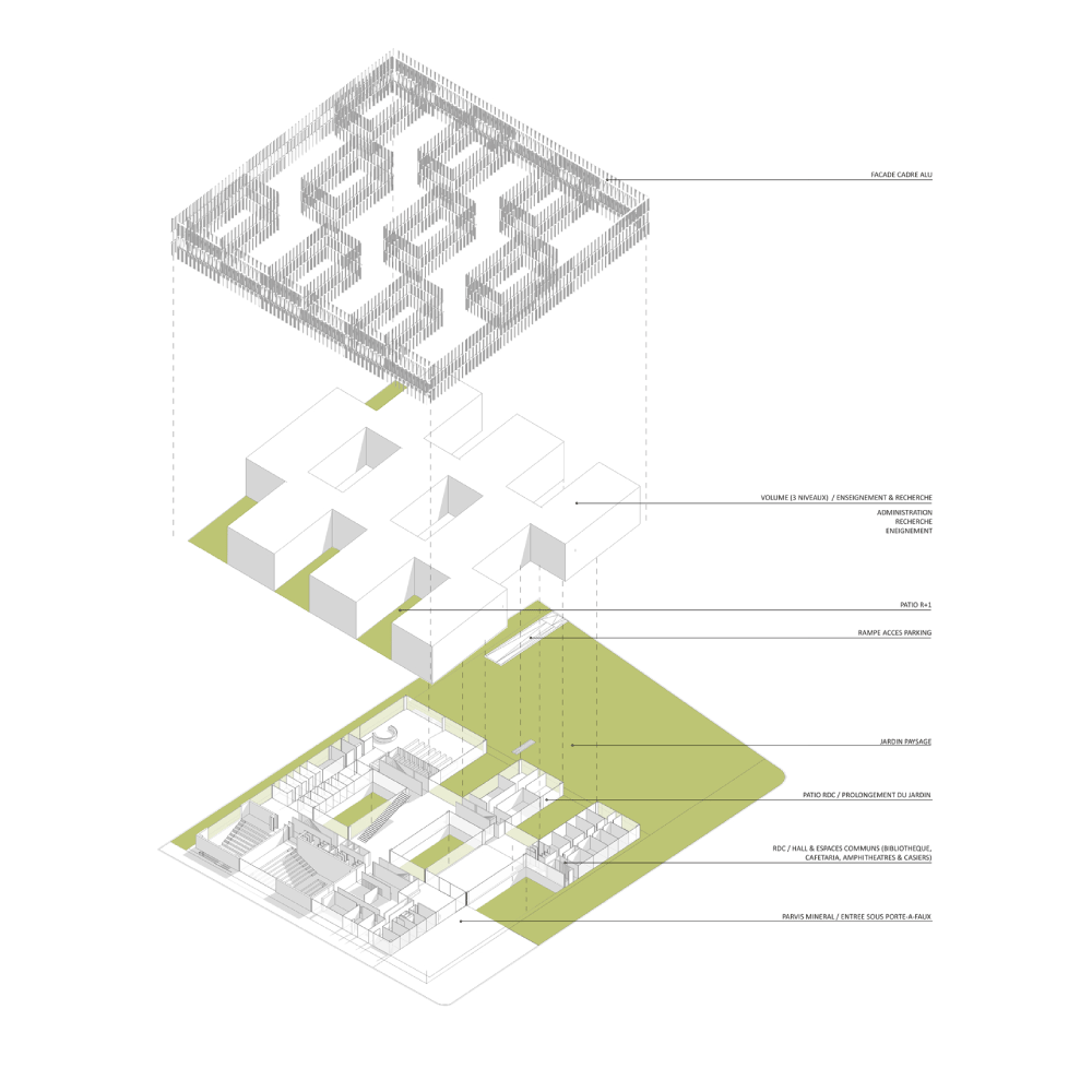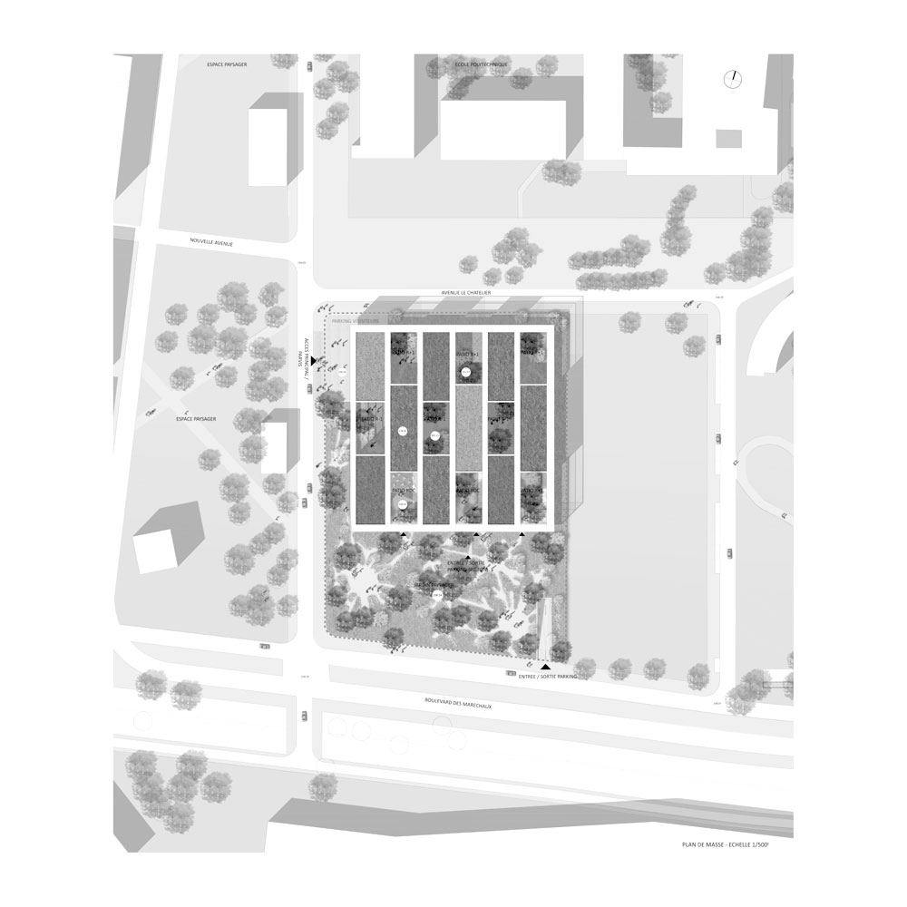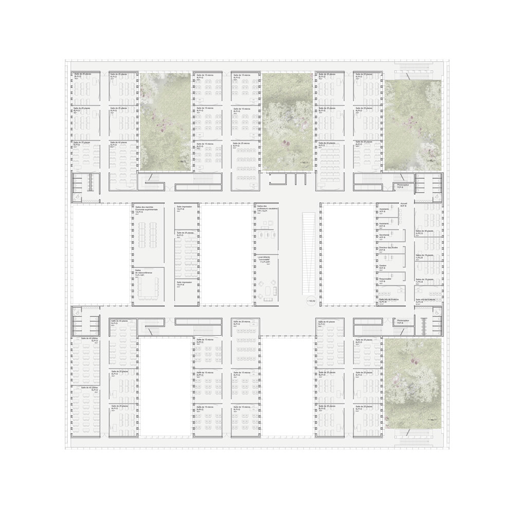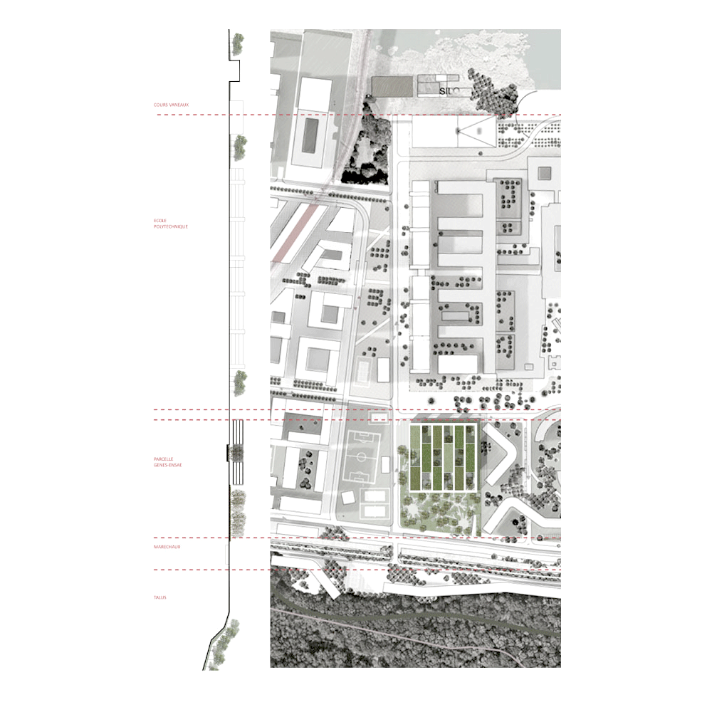Le long de ces deux directions, le projet établi "à distance" un point d’arrêt au principe linaire de l’école polytechnique, ainsi qu’à celui des éléments de formes libres placés à la lisière du plateau.