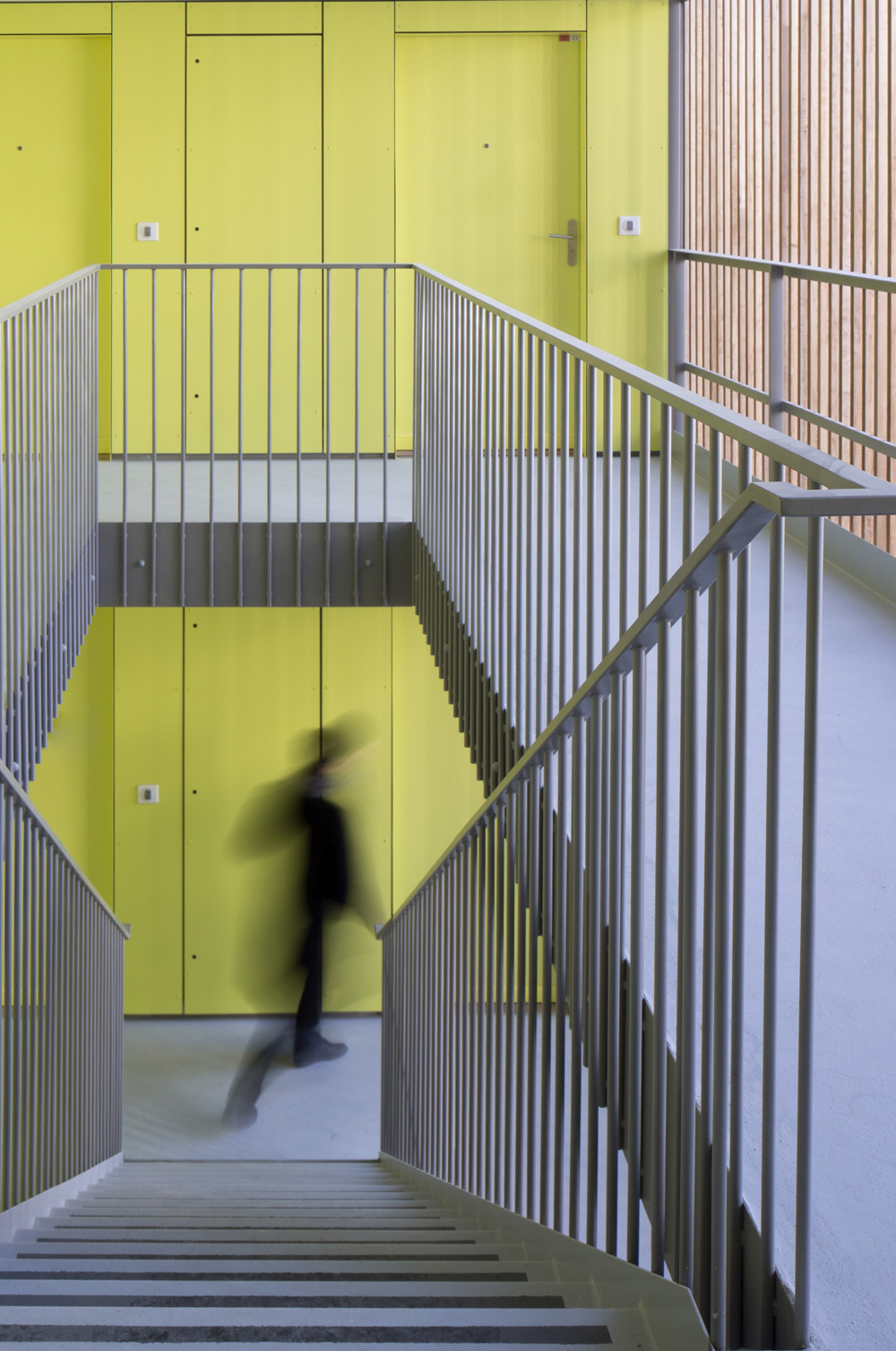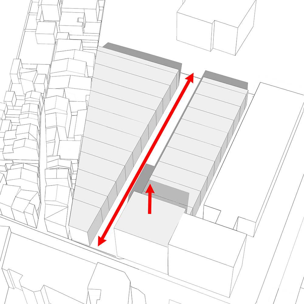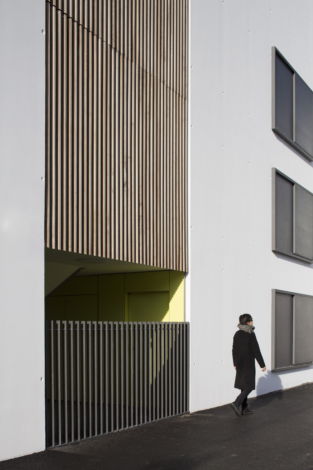 Les deux bâtiments sont constitués de petits volumes juxtaposés et décalés, suivant une trame Nord/Sud formant un