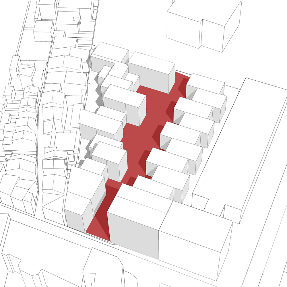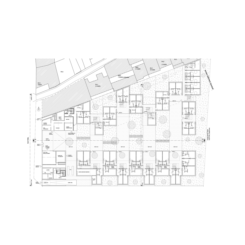 Le projet répond à ces trois approches par l’expression simple de deux corps de bâtiments bordant, l’un au Nord, l’autre au Sud, une allée de desserte ouverte sur la rue Pinel, du type de la “villa” parisienne et qui ouvre la vue depuis la rue sur toute la profondeur de la parcelle, vers l’Hôpital et les feuillages du Parc de la Légion d’Honneur.