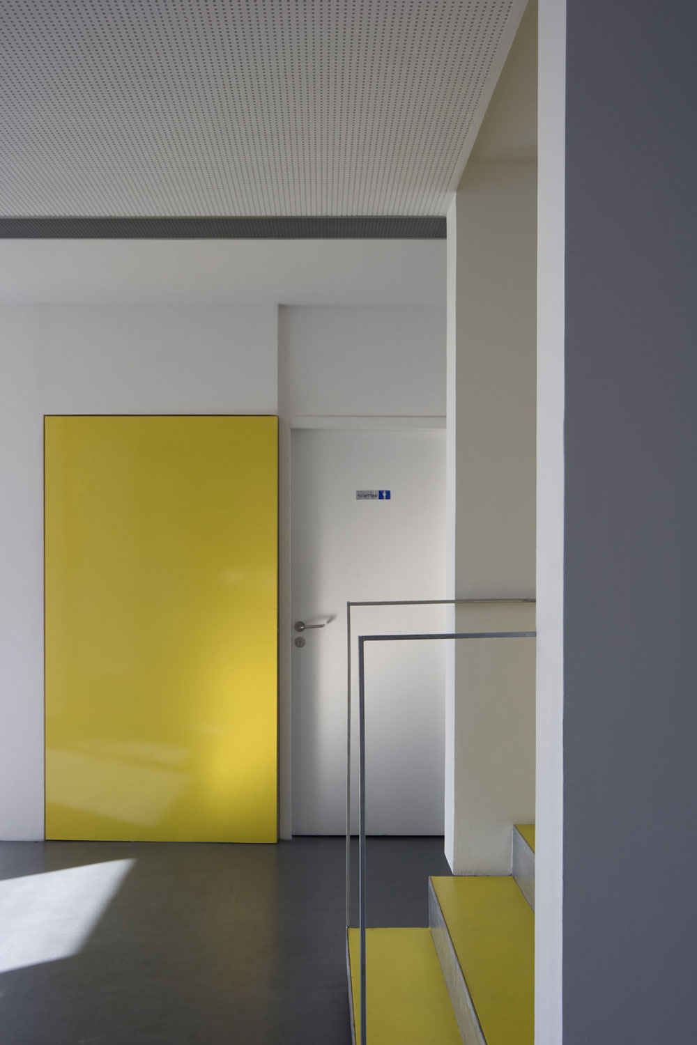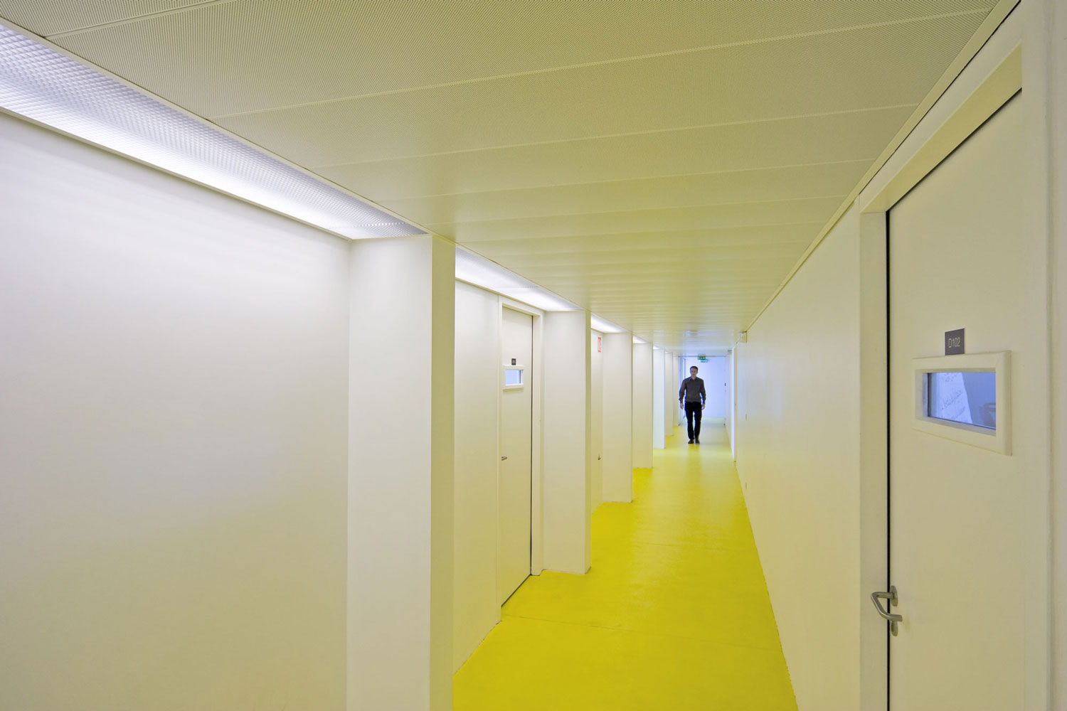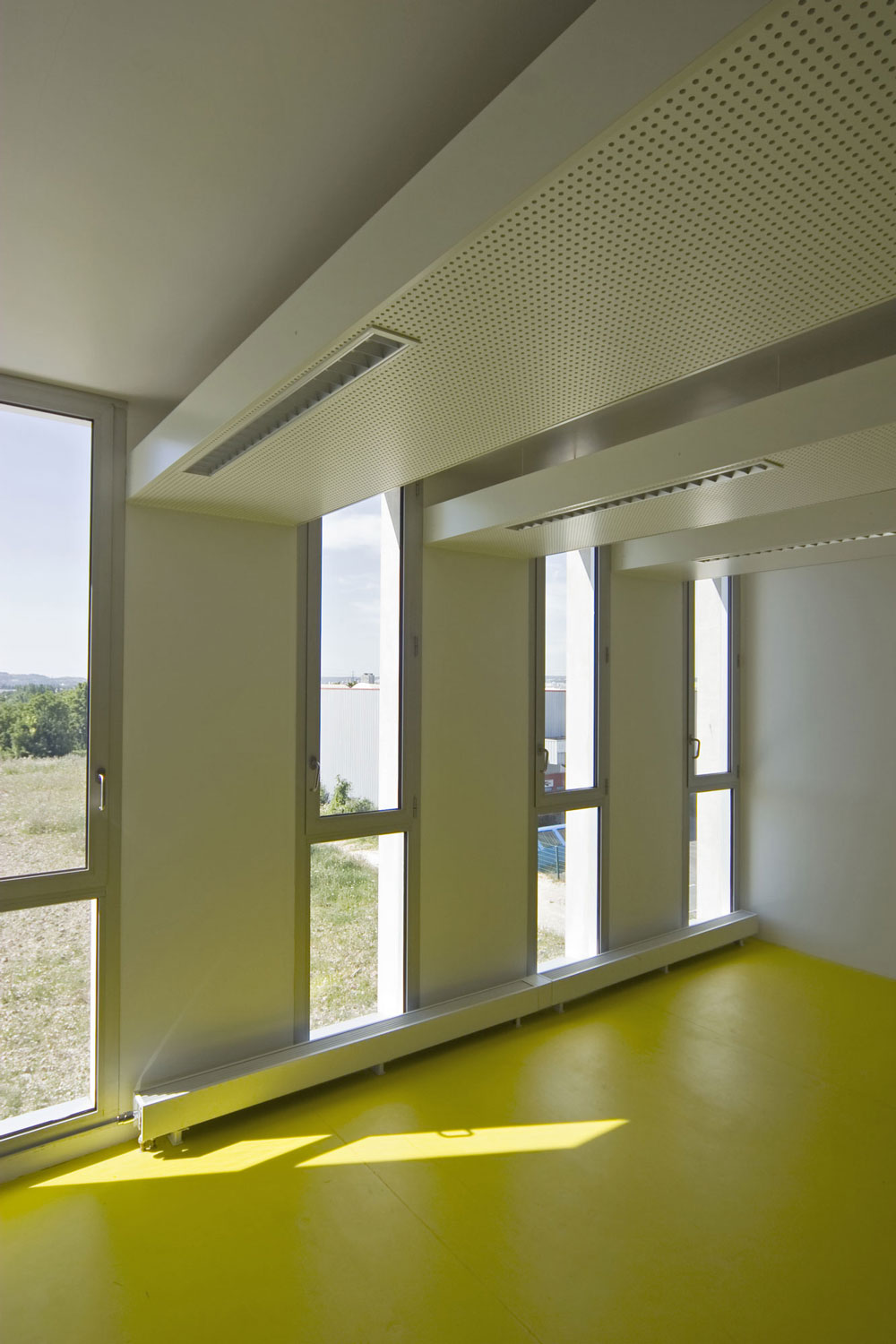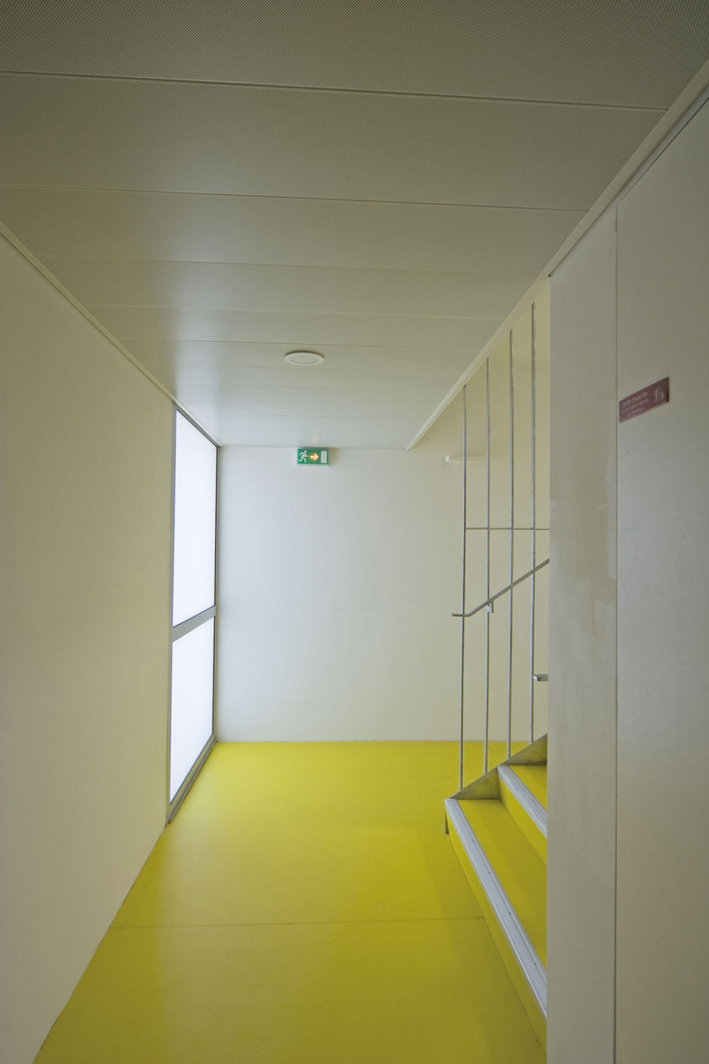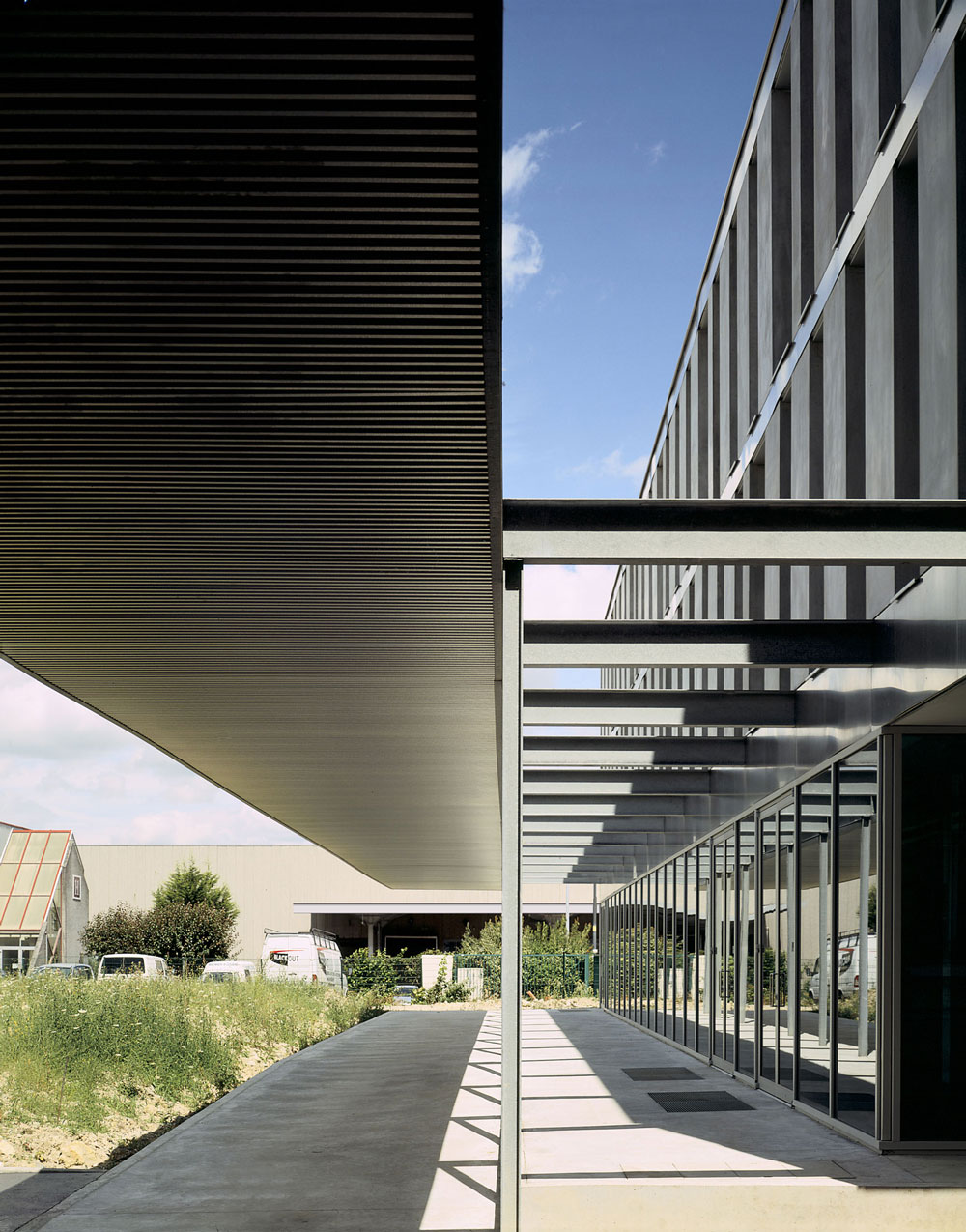 – vers la ville, le projet engage un dialogue plus riche et protecteur, répondant à une situation plus complexe. Cette complexité favorise une expression animée le long de l’espace public alternant l’ouverture des lieux de circulation en verre profilés transparents (réglit), la façade en pare-soleil, ou encore l’opacité verticale