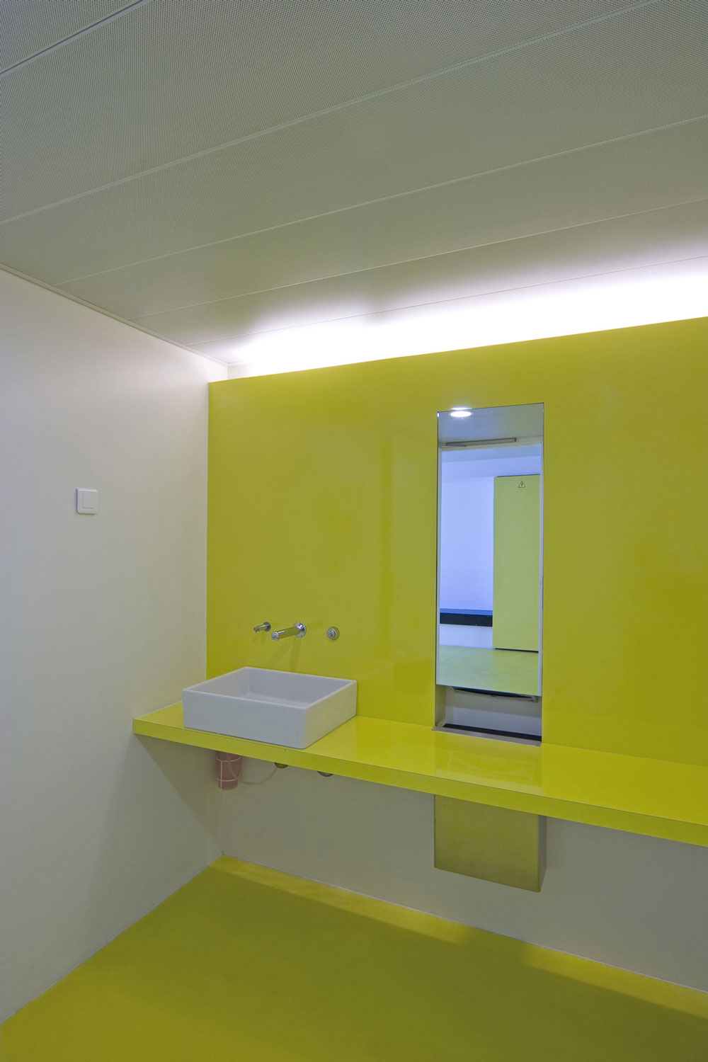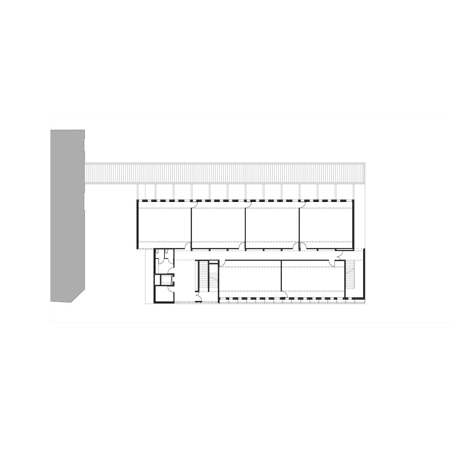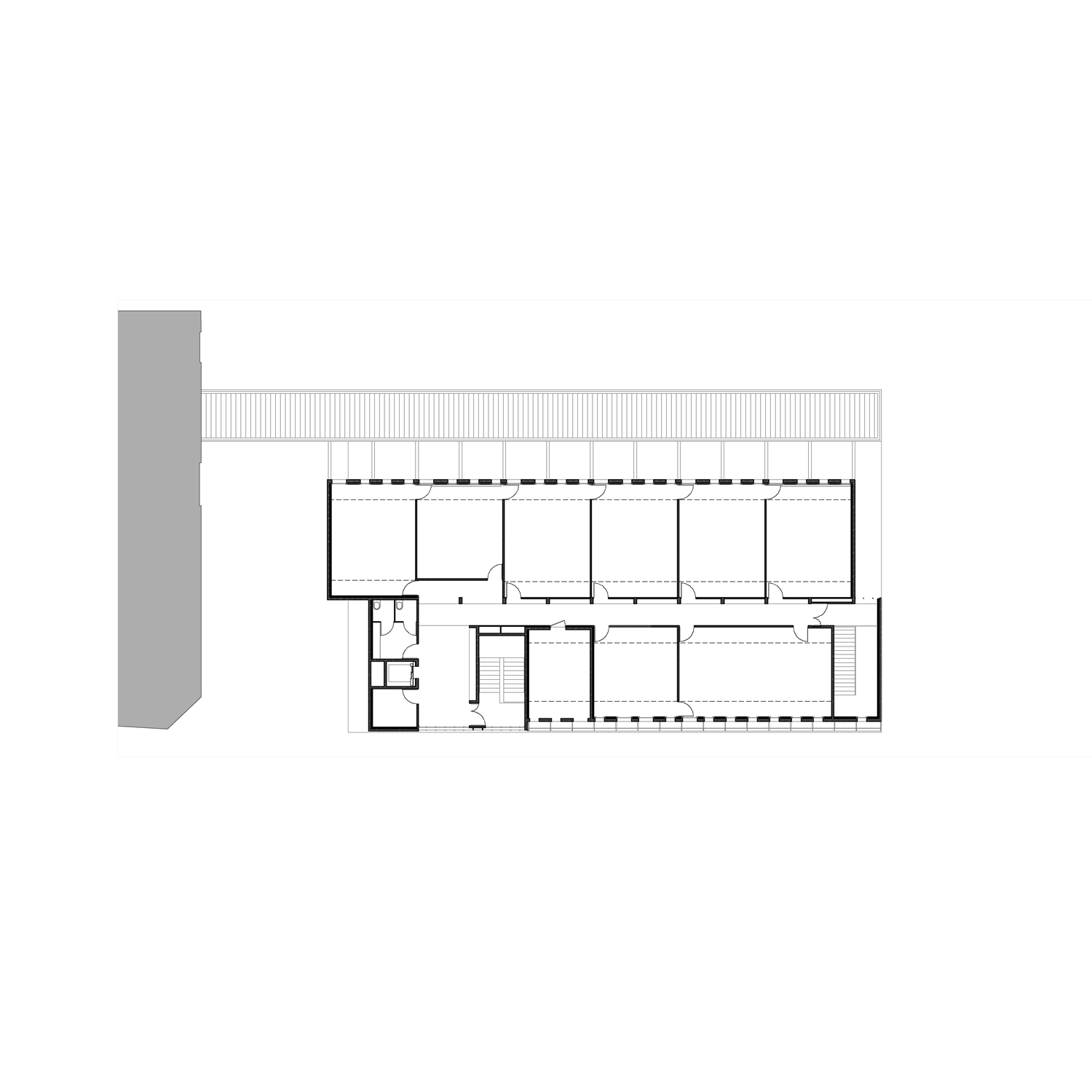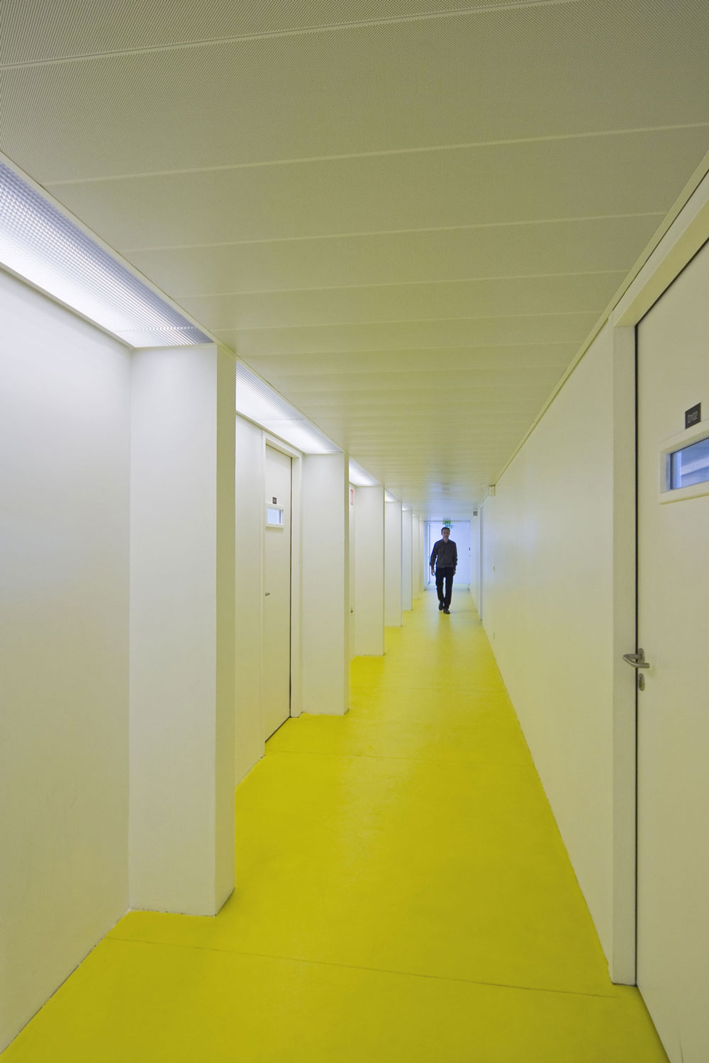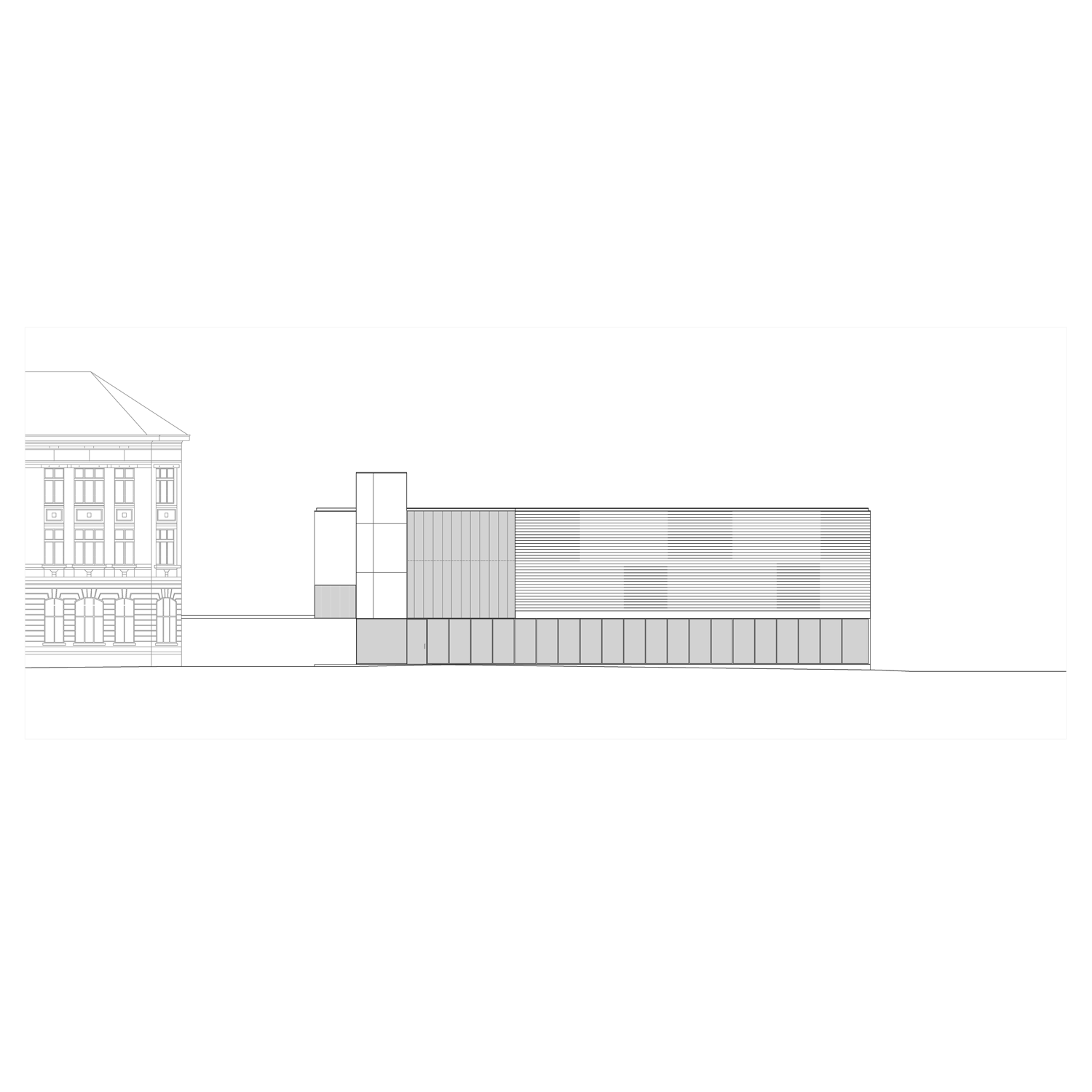 – vers la ville, le projet engage un dialogue plus riche et protecteur, répondant à une situation plus complexe. Cette complexité favorise une expression animée le long de l’espace public alternant l’ouverture des lieux de circulation en verre profilés transparents (réglit), la façade en pare-soleil, ou encore l’opacité verticale