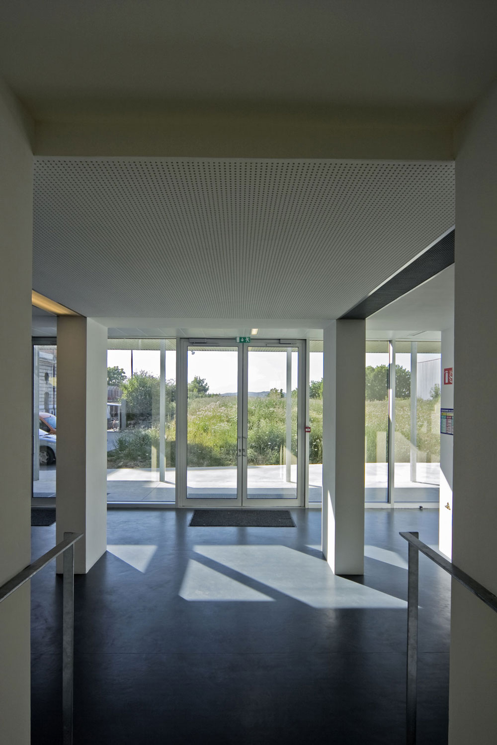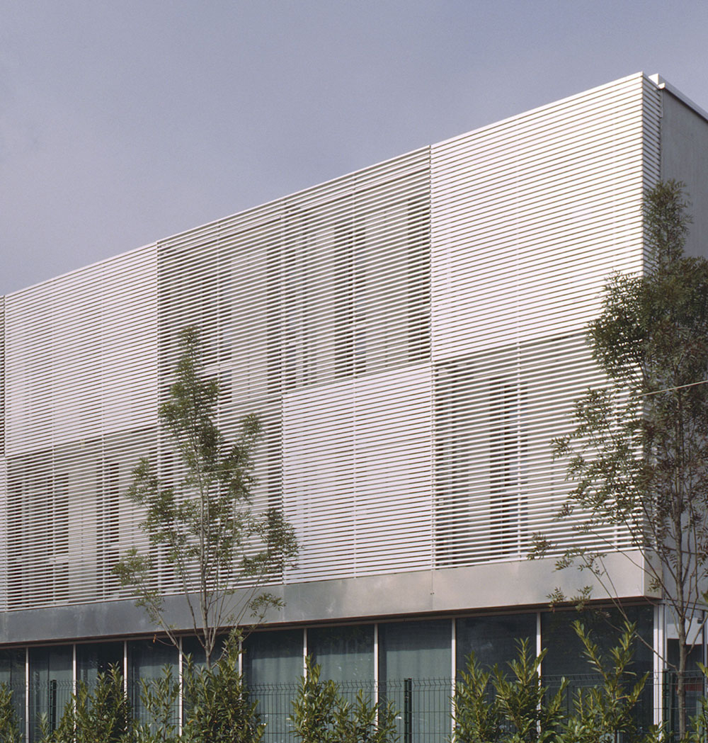 longueur complète de la façade. La présence d’aérateurs verticaux scande l’unité globale de la façade en étage, tandis qu’au rez-de-chaussée, le hall bénéficie d’une large transparence vers l’horizon lointain.