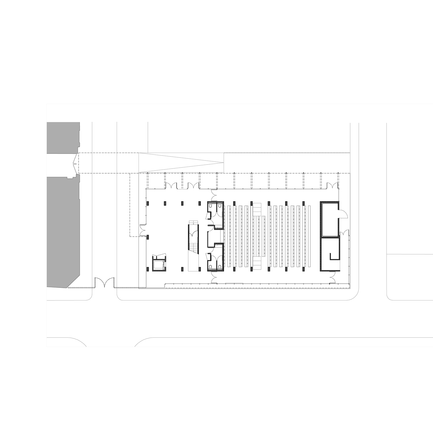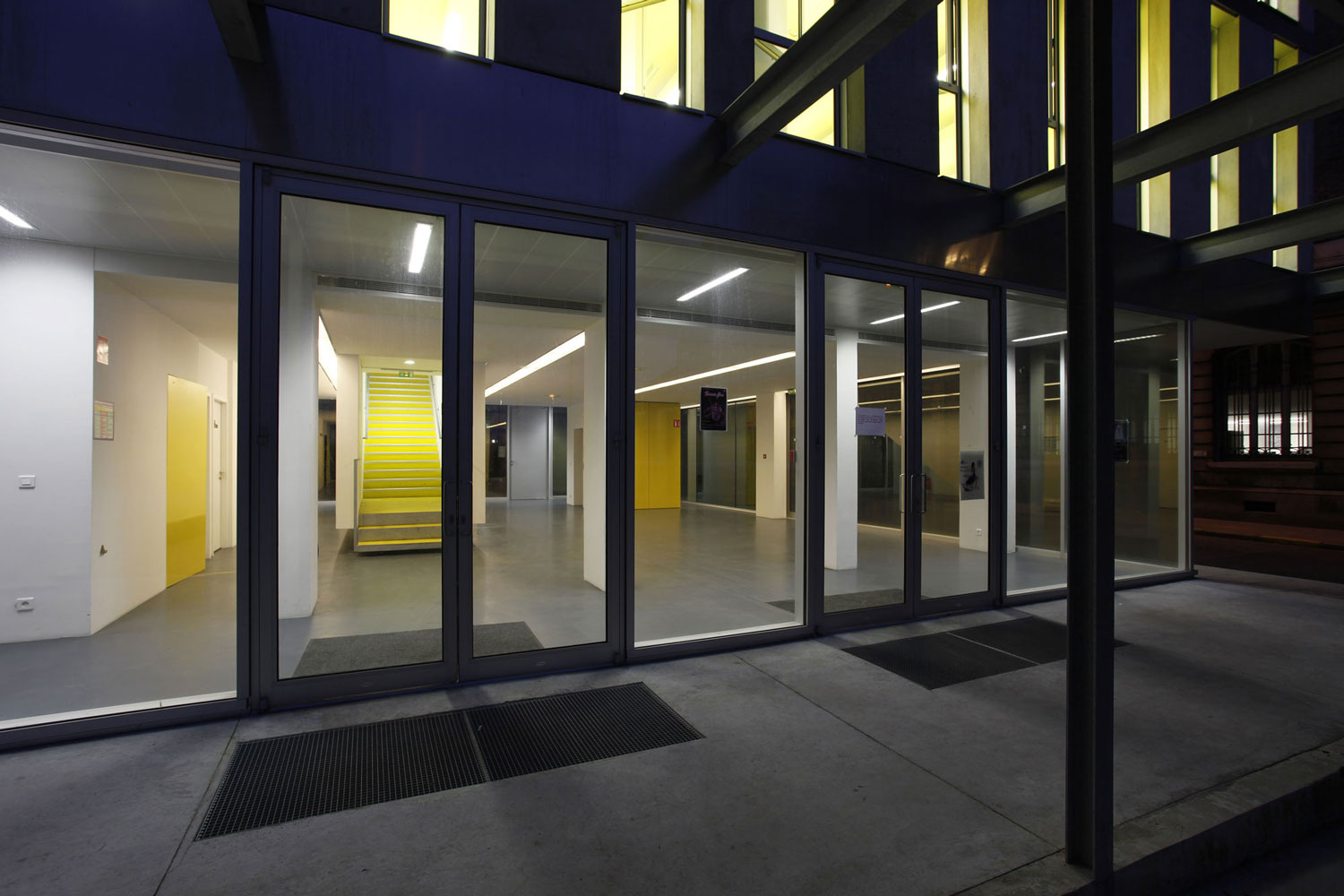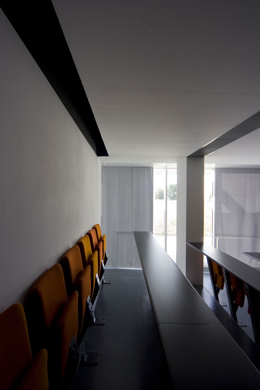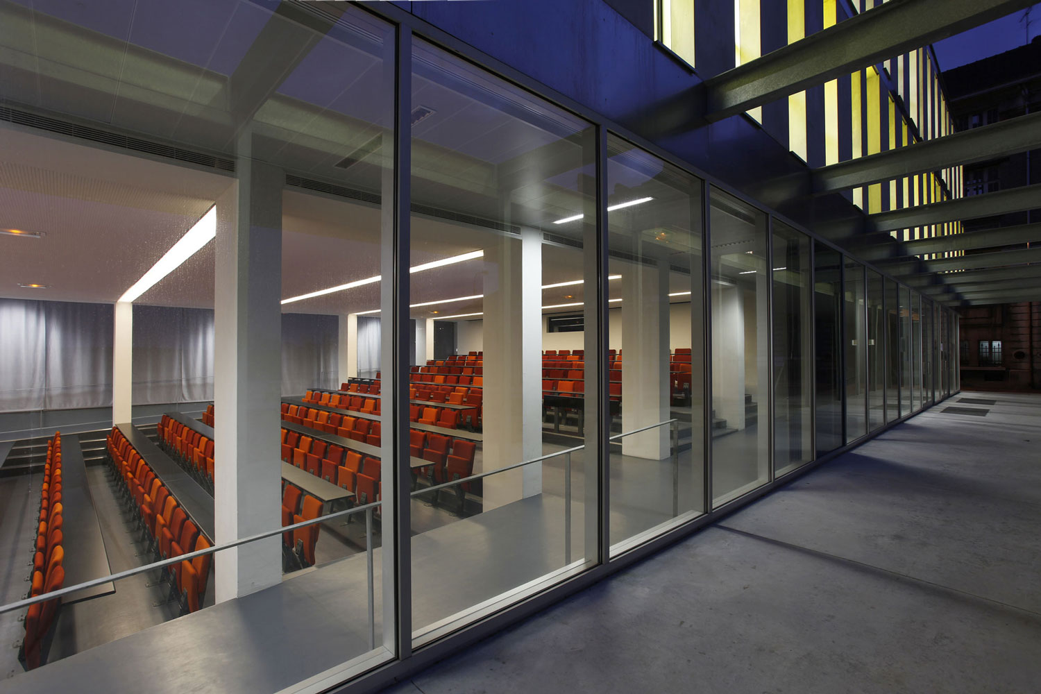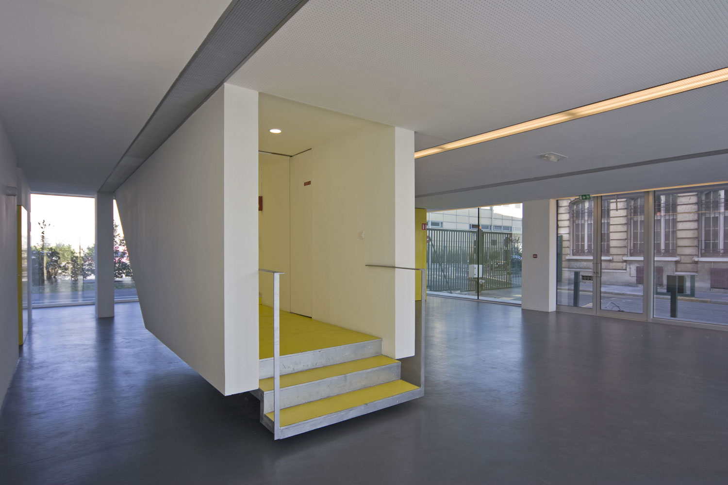 l’amphithéâtre vers le jardin par la constitution d’une épaisseur de circulation intérieure. Cette épaisseur offre l’opportunité d’un jeu sur la signalétique de l’établissement dont le nom est marqué en grande lettre sur les panneaux d’occultation intérieure de l’amphithéâtre.