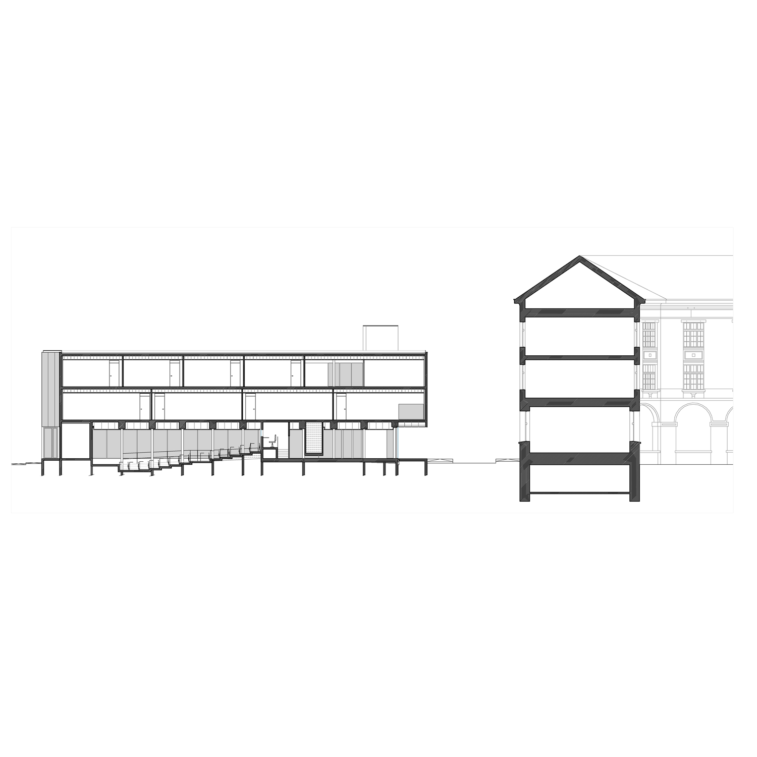 unitaire le long de la rue préservant les conditions d’une intervention ultérieure pour la construction d’une extension. Soulignant la dualité des deux situations urbaines issue du contraste entre le contexte bâti au Sud et l’horizon dégagé vers la Seine au Nord, le projet se scinde en deux volumes adossés offrant chacun une expression spécifique :