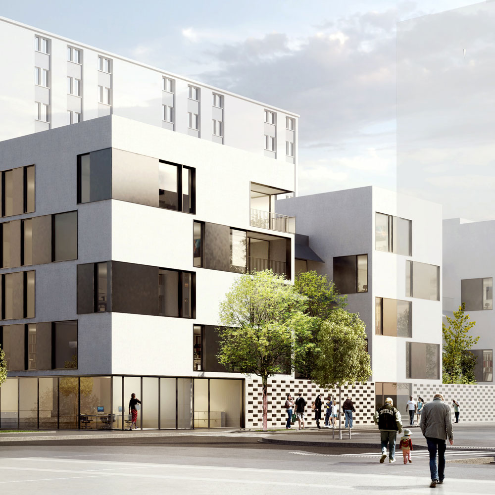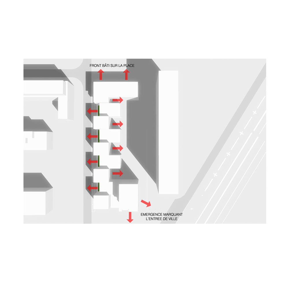 Ces principes prennent forme au travers de la constitution d’un immeuble épais constitué de "plots" (r+3 et r+4) décalés en quinconce, flanqué au Nord d’une volume horizontal (r+4)« tenant » l’espace public et au Sud d’une verticale (r+6) visible de toute part.