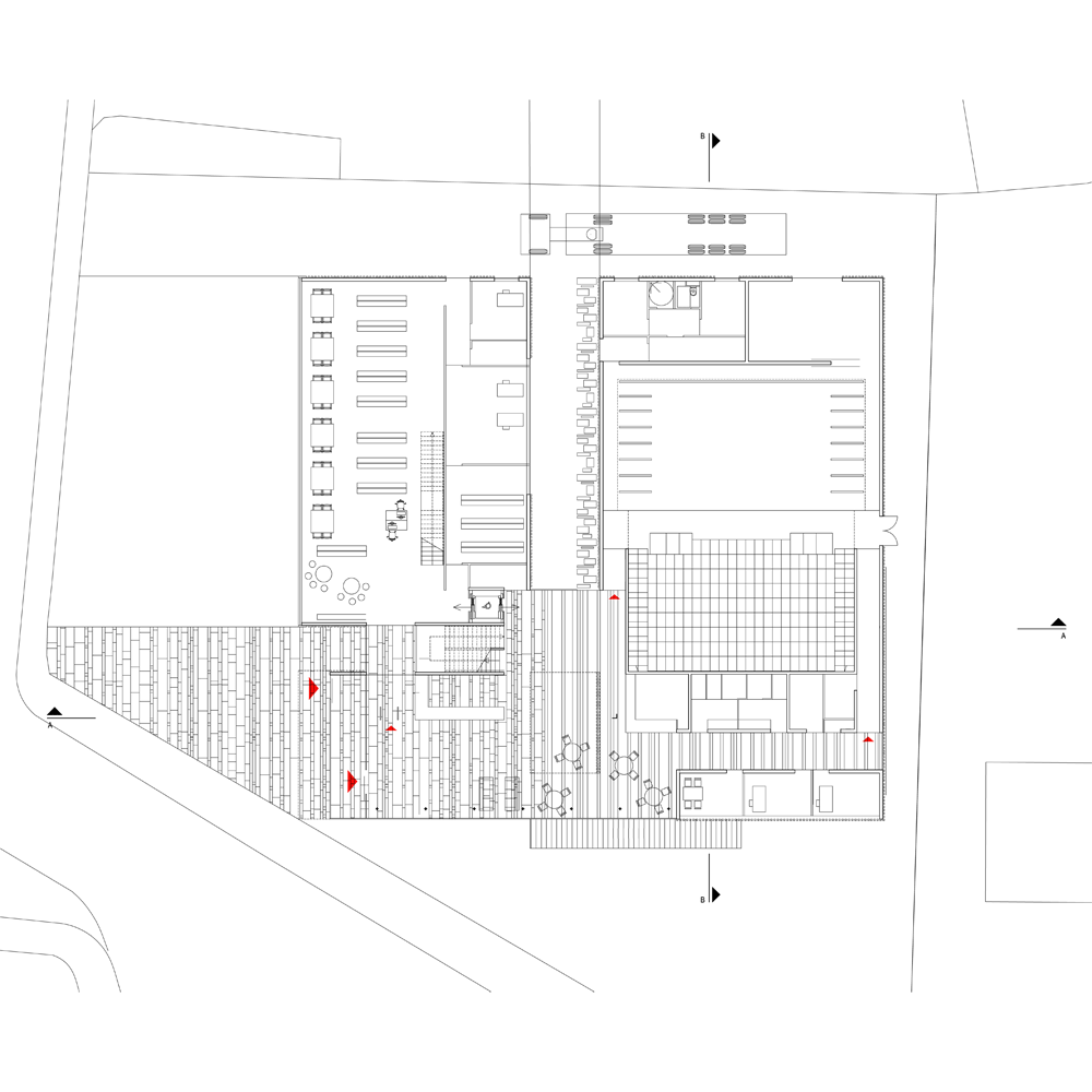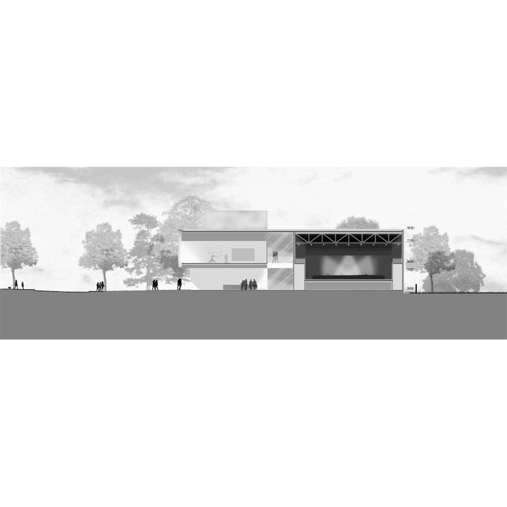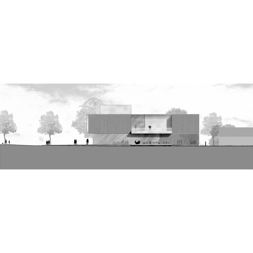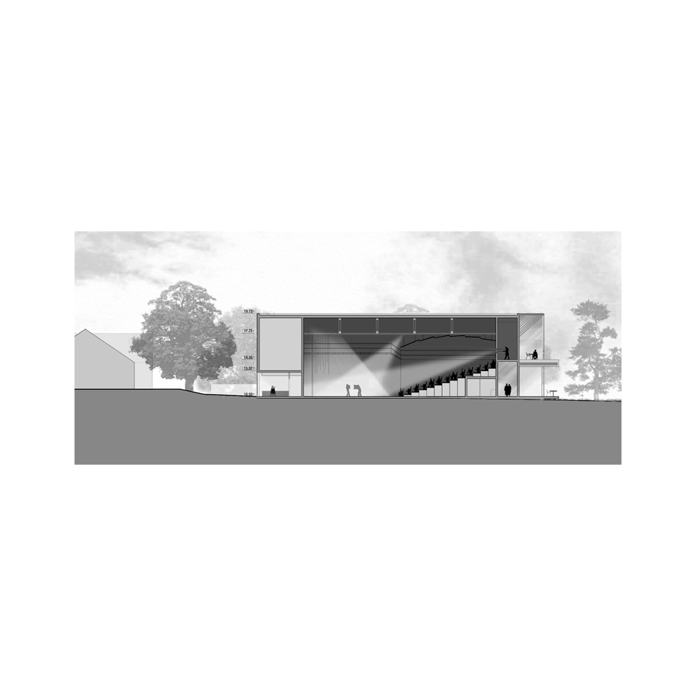 Le dispositif du tasseautage extérieur apporte également une réponse aux exigences en matière de confort d’été et de protection solaire des façades vitrées (notamment pour la médiathèque et les bureaux) tout en conférant une matérialité qualitative et respectueuse de l’environnement naturel proche au volume opaque de la salle de spectacle.