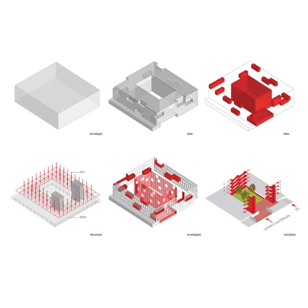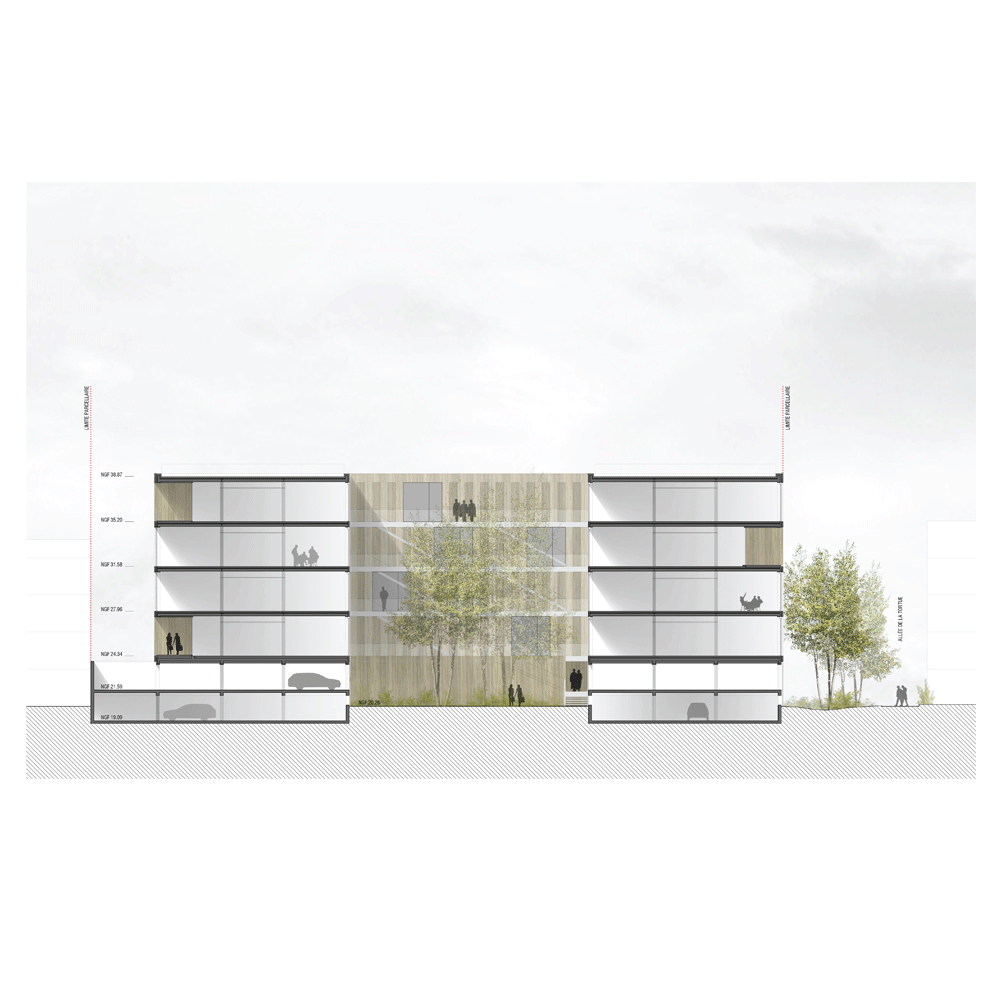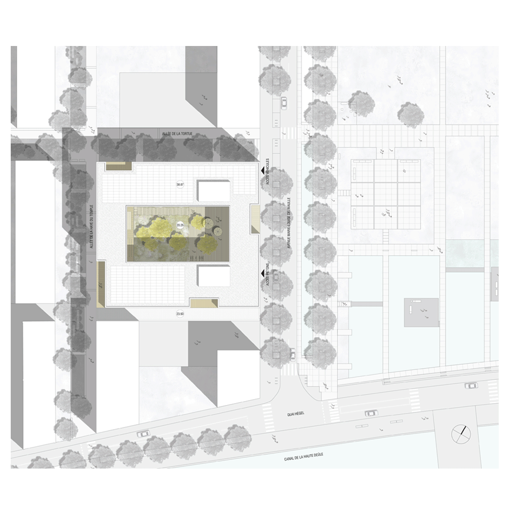 Les pleins s’assemblent autour des espaces du jardin central symbolisant le lieu d’une appropriation collective symbolique. Ce dernier également accessible en façade Sud depuis le parking silo permet de desservir les deux halls par une « entrée du personnel »