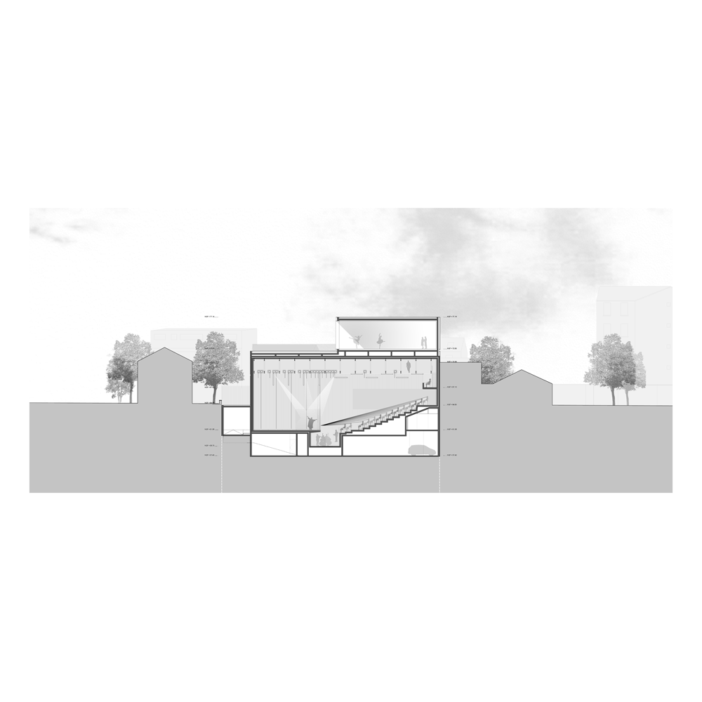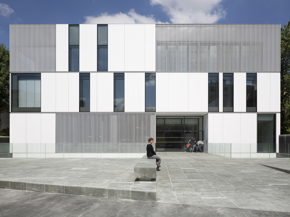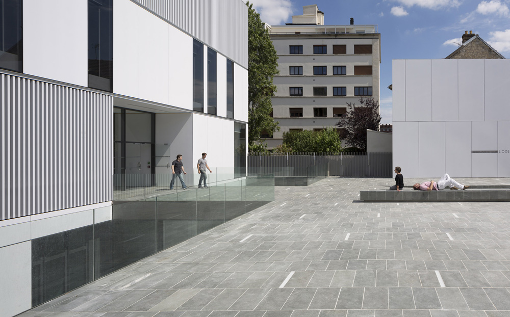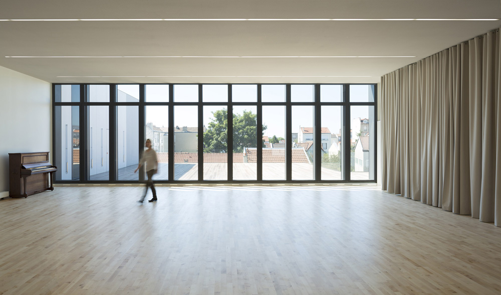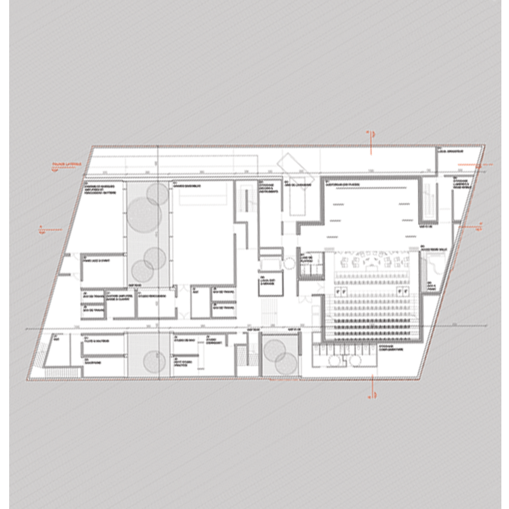 le principe architectural du bâtiment s’organise sur le thème d’un prisme unitaire dont les limites réelles suggèrent l’enveloppe virtuelle des éléments soustraits. chacun de ces vides créés (patios, cour latérale, toiture de la l’espace scénique) offre les conditions d’un éclairement naturel spécifique à tous les niveaux (danse au r+2, tutti/musique ancienne au r+1, hall au rez-de-chaussée, grand ensemble au r-1). ils expriment et décomposent l’unité du prisme en unités fonctionnelles depuis le plan de toiture jusqu’au traitement de la façade.