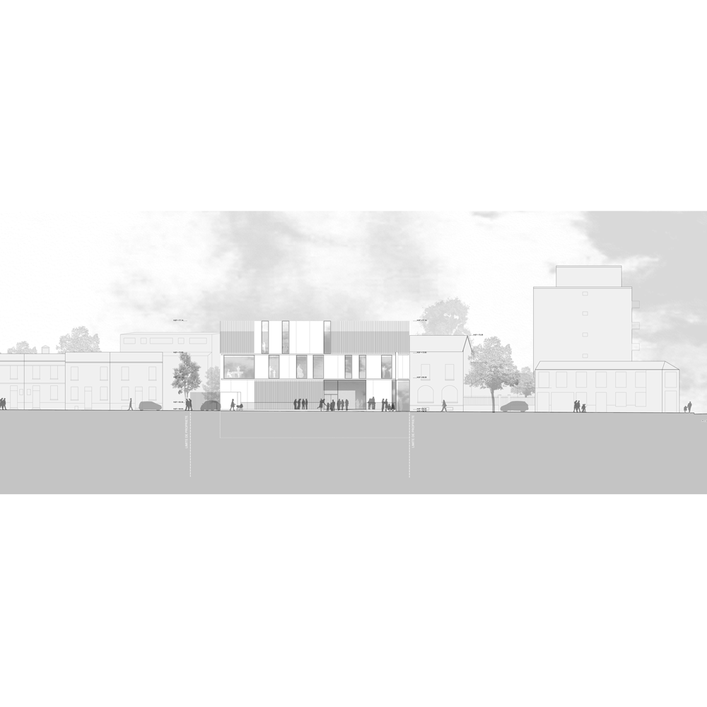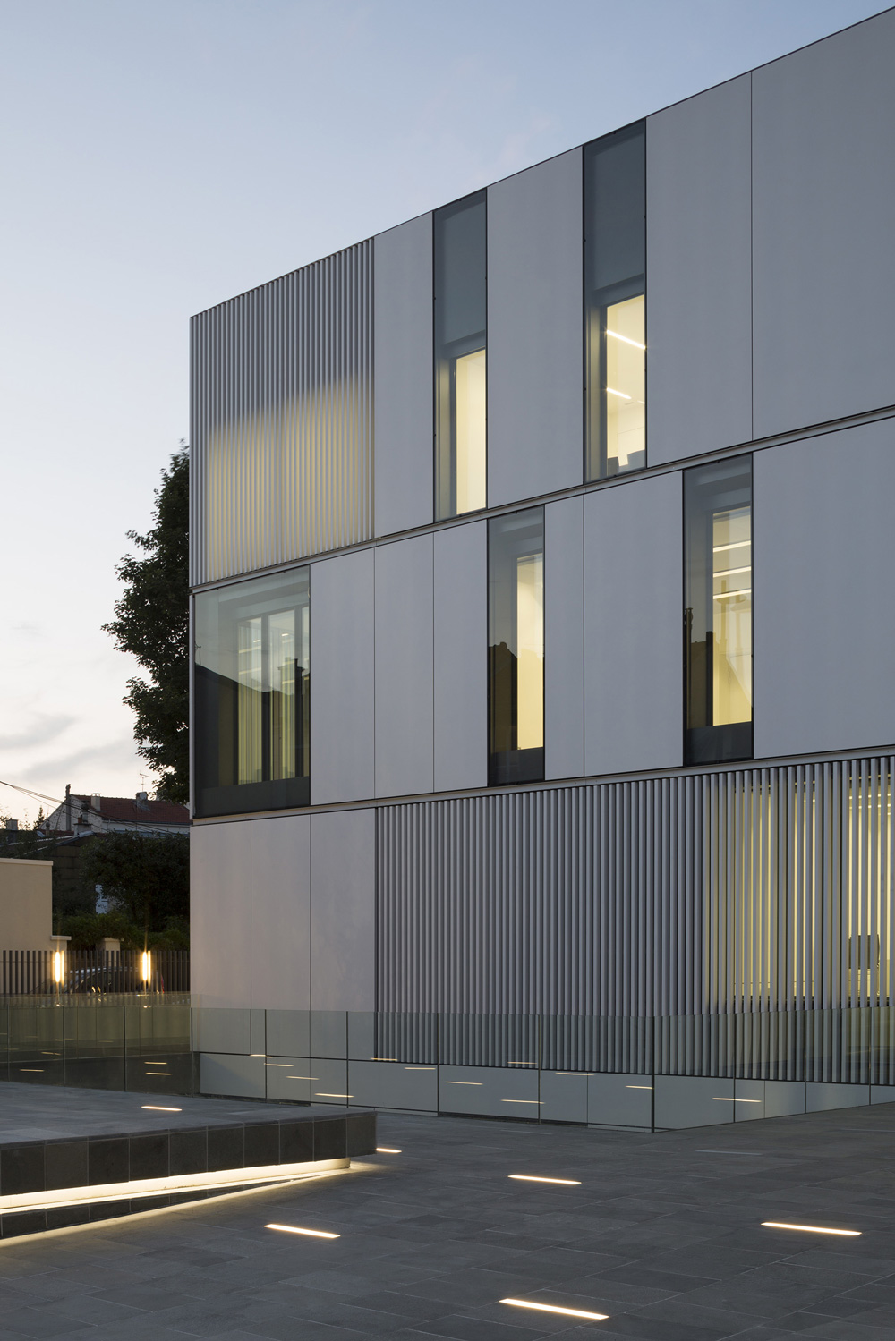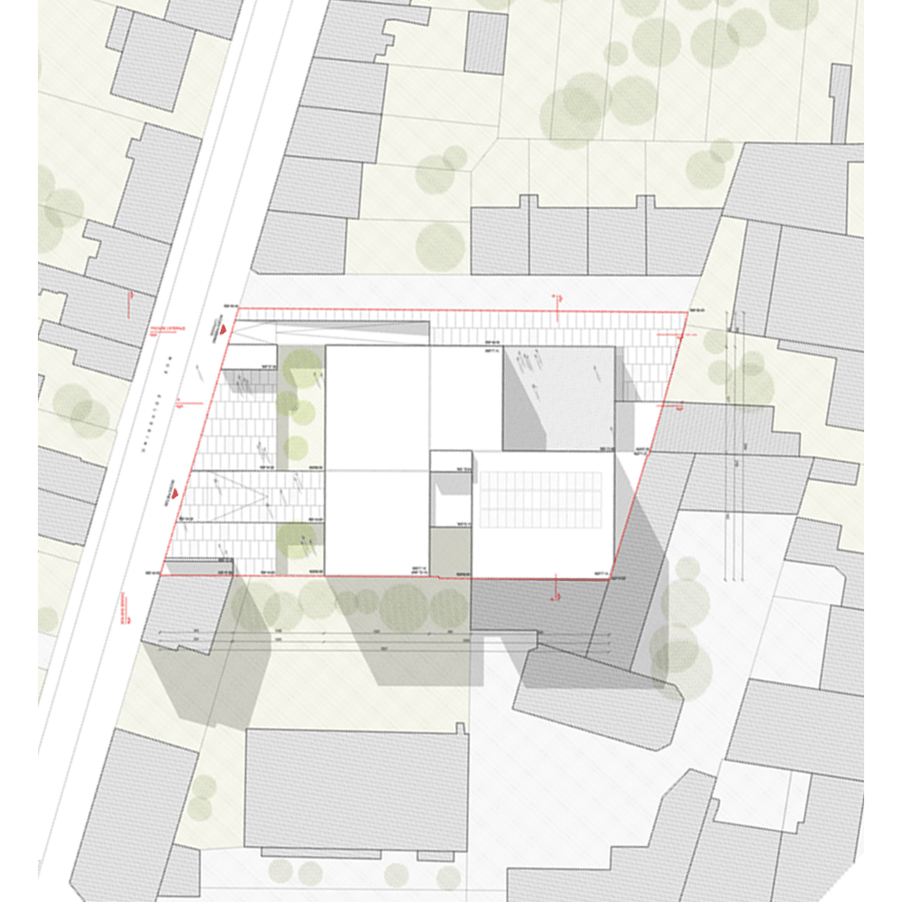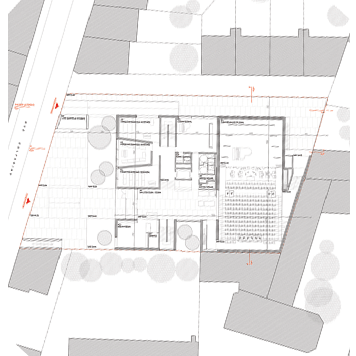 le principe architectural du bâtiment s’organise sur le thème d’un prisme unitaire dont les limites réelles suggèrent l’enveloppe virtuelle des éléments soustraits. chacun de ces vides créés (patios, cour latérale, toiture de la l’espace scénique) offre les conditions d’un éclairement naturel spécifique à tous les niveaux (danse au r+2, tutti/musique ancienne au r+1, hall au rez-de-chaussée, grand ensemble au r-1). ils expriment et décomposent l’unité du prisme en unités fonctionnelles depuis le plan de toiture jusqu’au traitement de la façade.