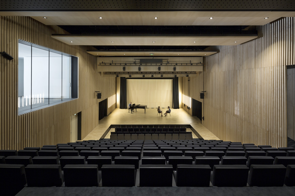 les salles destinées au public (auditorium, studios d’enregistrement, musiques actuelles sont ainsi reliées sur un même niveau et disposent d’un accès secondaire depuis le parvis.