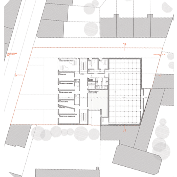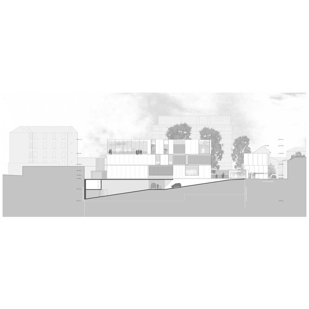 une "nappe" horizontale éclairée par des patios extérieurs prolonge le projet sous le parvis en liaison avec les distributions