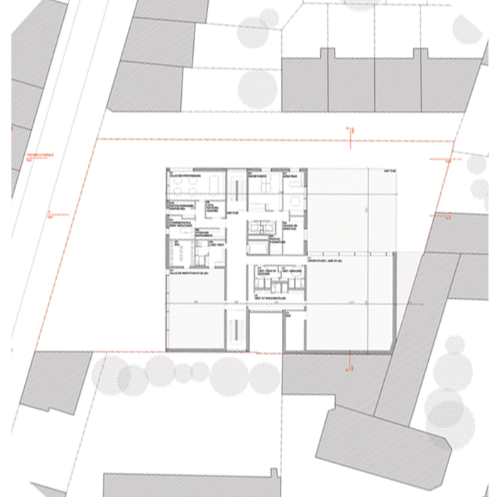 le corps du bâtiment principal se décompose ainsi en deux couches verticales, parallèles à la rue séparées par une bande de services associant les dessertes horizontales et verticales (escaliers, ascenseur) ainsi que les sanitaires.